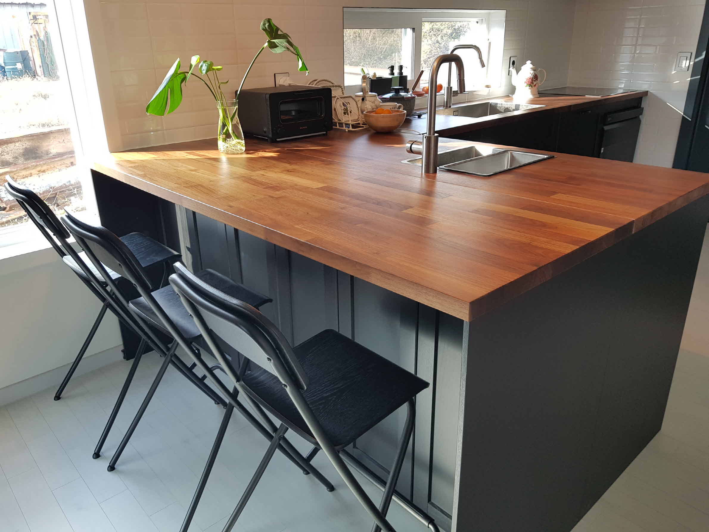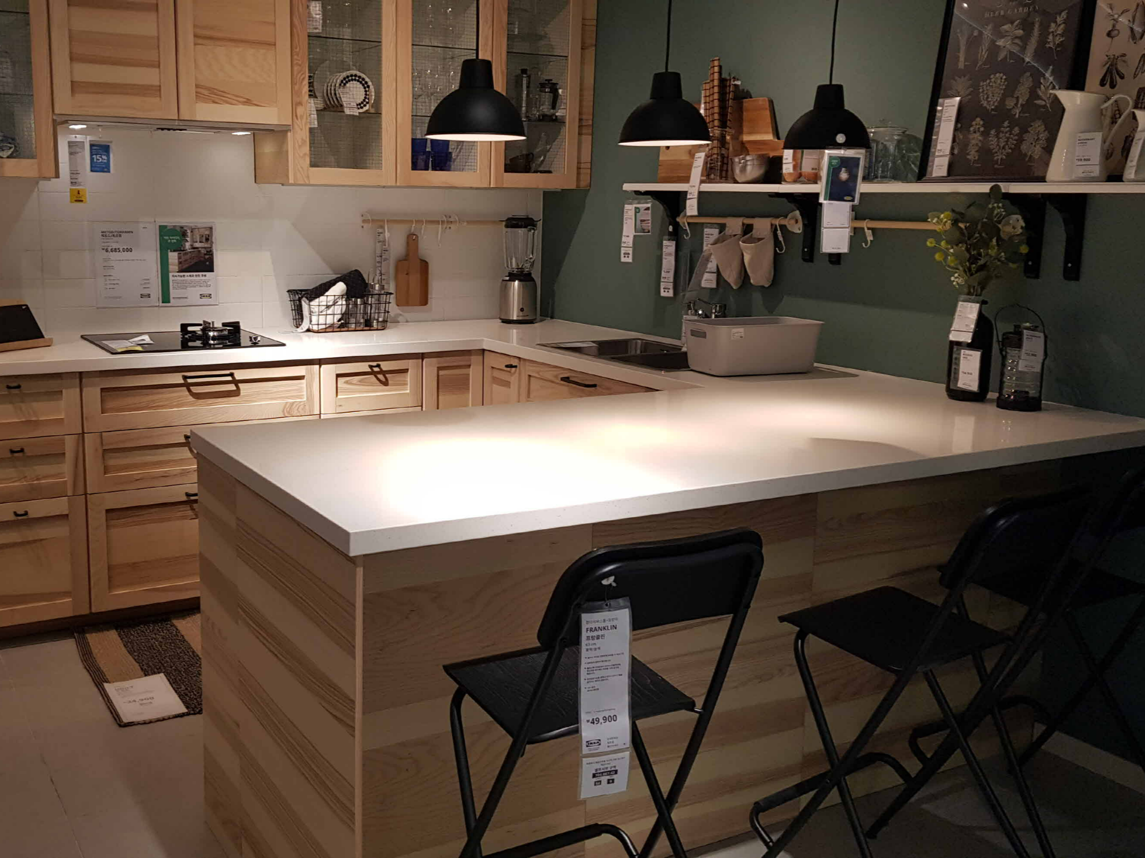원목 상판 싱크대에 아이랜드 식탁이 붙어있는 주방을 원했다. 이케아 쇼룸에서 생각했던것과 비슷한 느낌의 싱크대를 발견하고는 이케아에서 싱크대를 주문 제작하게 되었다.
