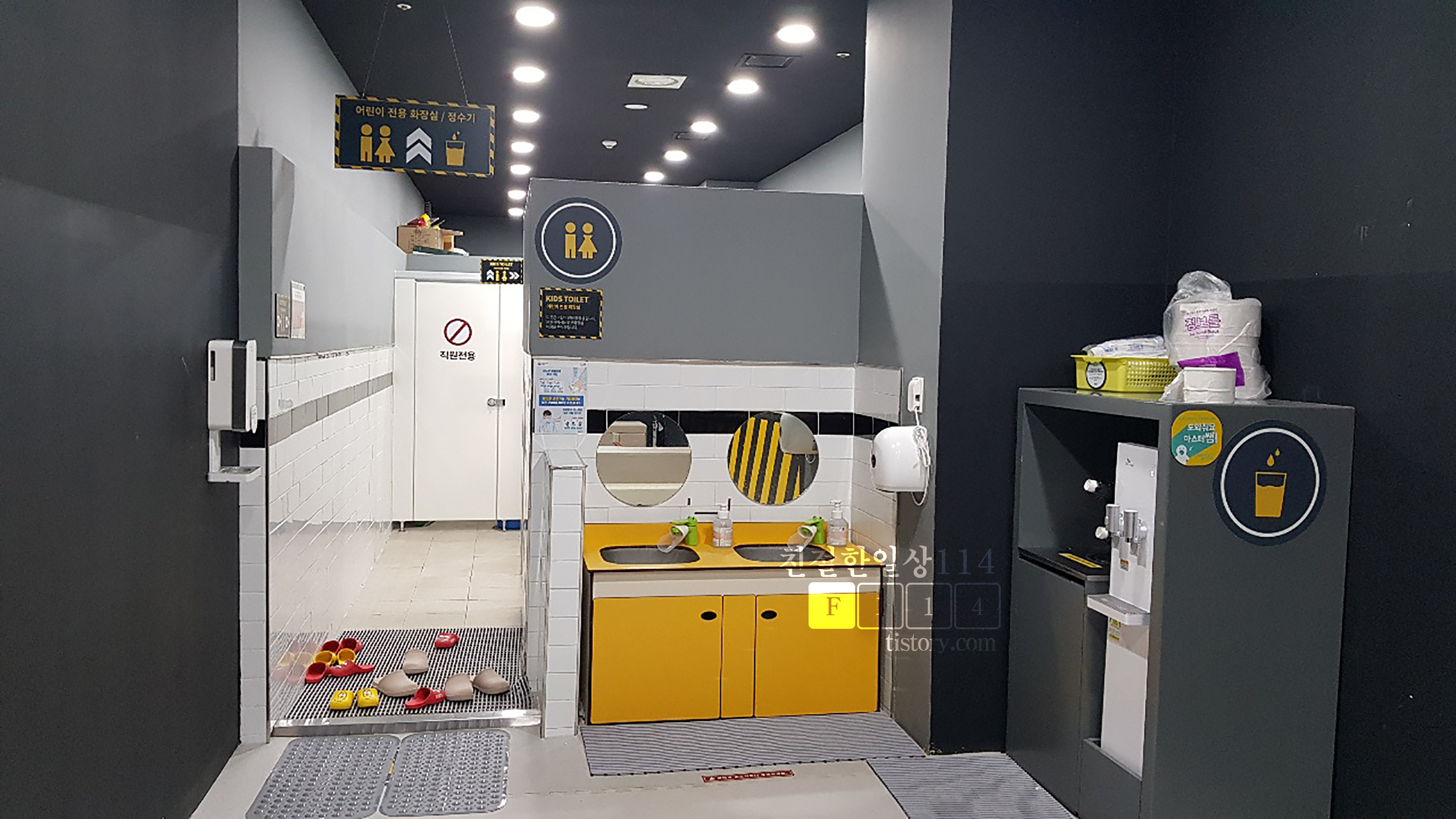 어린이용 화장실과 세면대. 그리고 작은 스낵코너도 있다. 화장실은 어린이들만 이용할 수 있으며 어른들은 키즈파크 외부 화장실을 이용해야 한다.