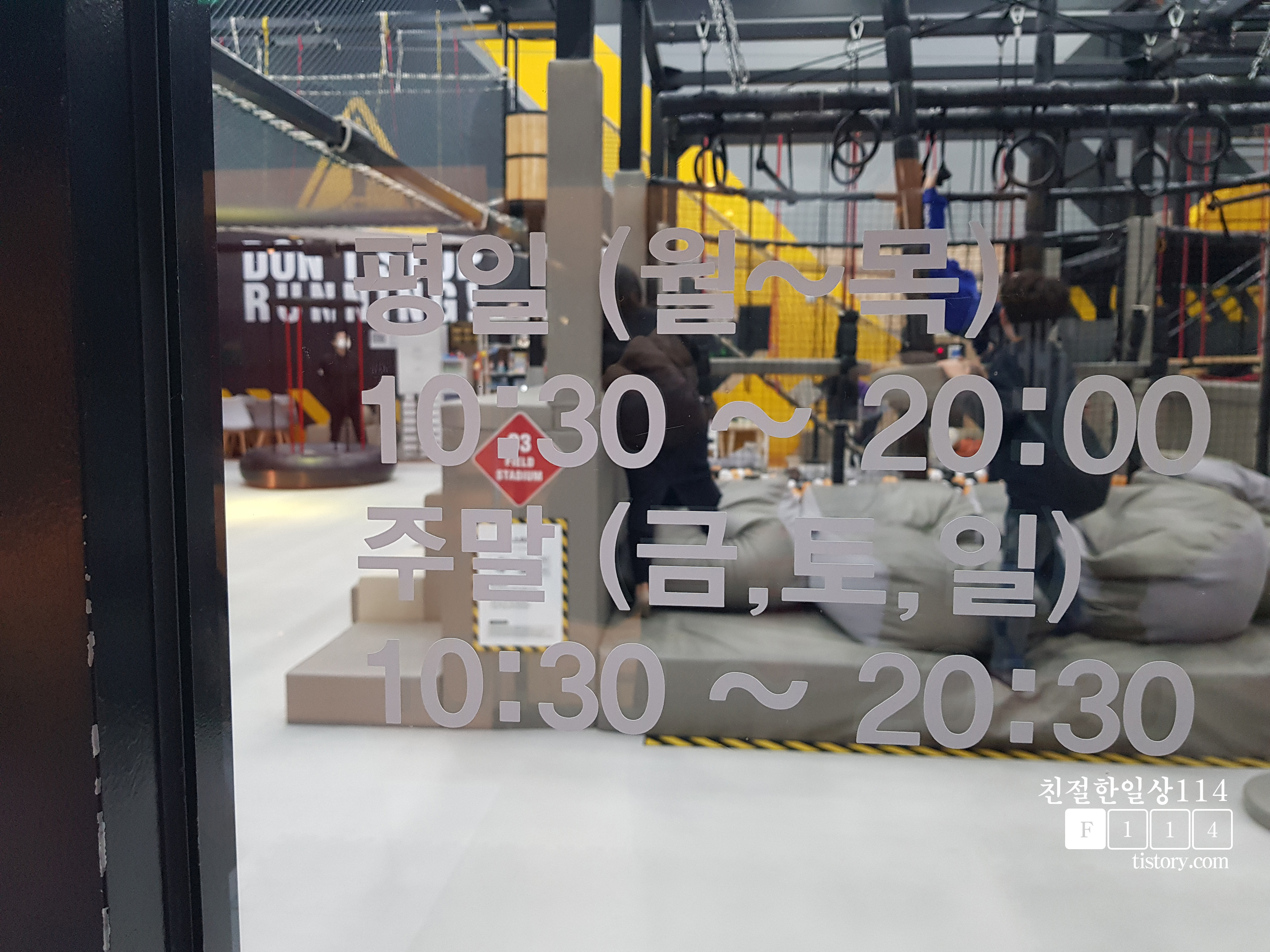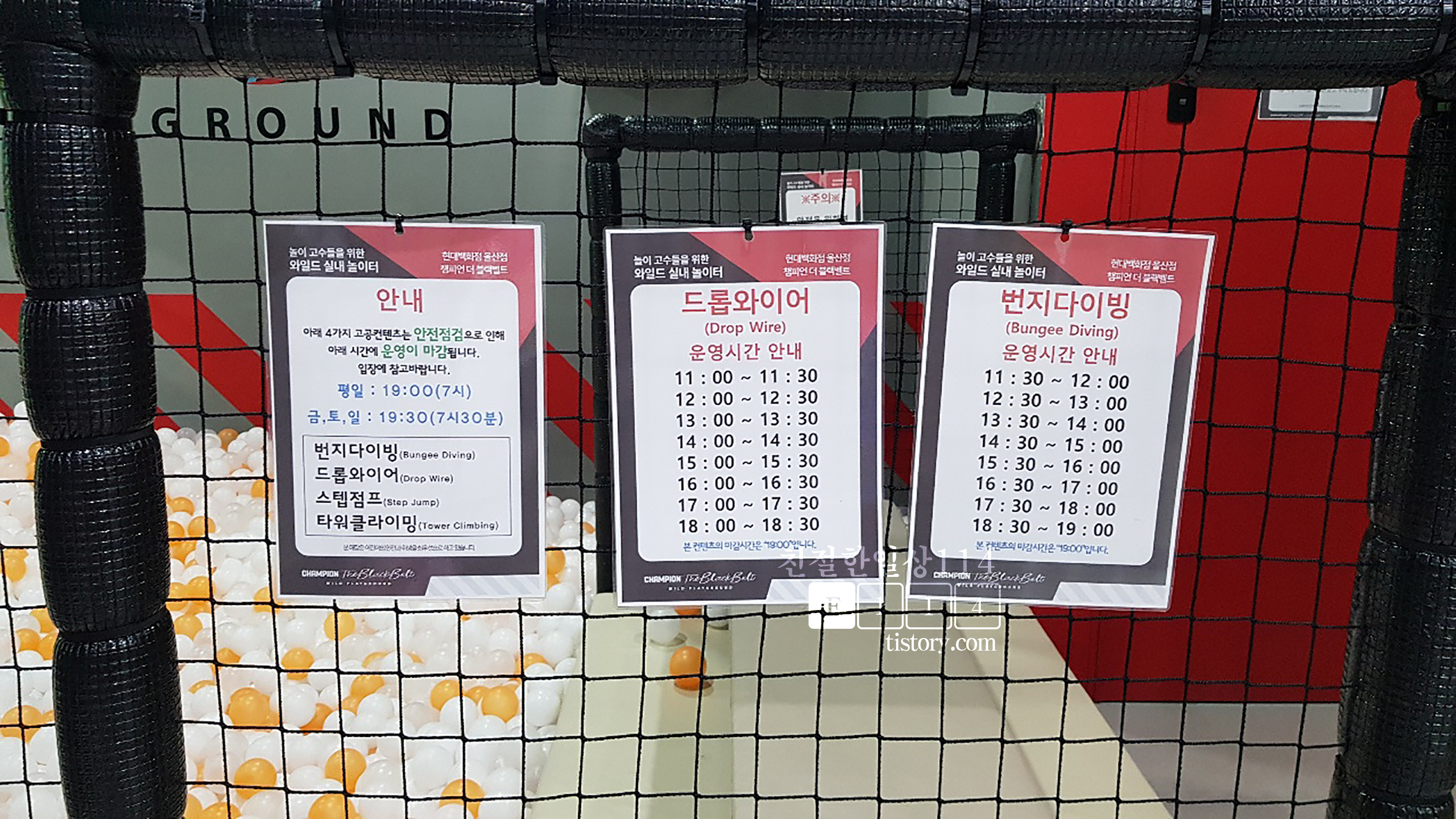 드롭와이어 & 번지다이빙 & 스텝점프 & 타워클라이밍 이용시간은 위 사진을 참고 바란다. 방문일에는 평일이고 이용객이 적어서 정시에 시간맞춰서 운영이 되지는 않고 있었다. 대신 선생님을 부르고 타고 싶다고 얘기하니 다른 아이들도 함께 모여서 같이 이용하게 해주었다.