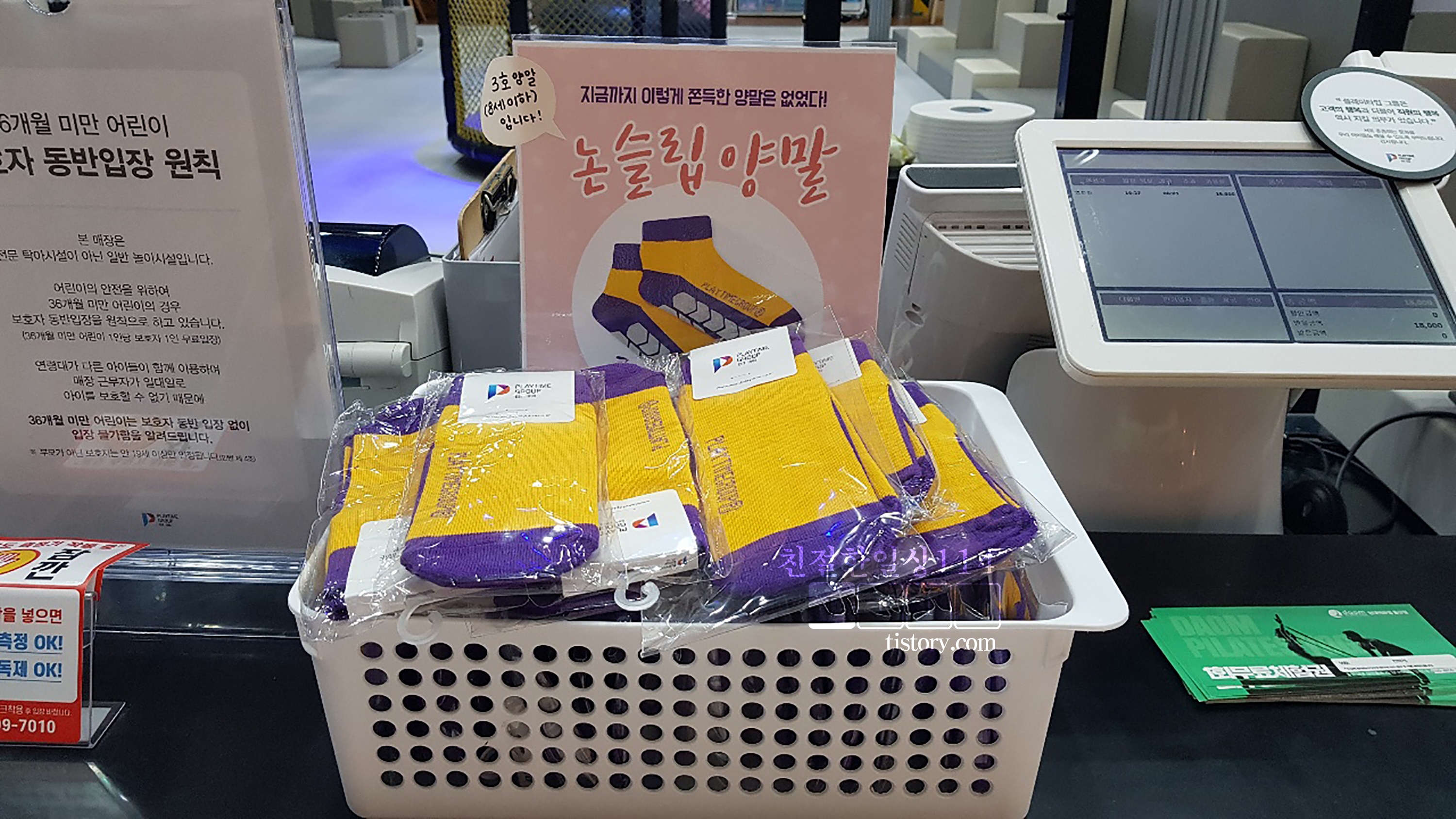 이용요금은 2시간에 18,000원 이다. 키즈카페 치고는 비싼 편이지만 안전하면서도 재밌게 놀 수만 있다면 아깝지 않다. 카운터에 논슬립 양말을 팔고 있다. 반드시 사야하는건 아니다. 신발을 벗고 양말만 신고 들어가는데 바닥이 미끄울시 시설물을 제대로 못 즐기고 다칠 수 있어서 필요한 경우 사서 신으라고 구비해 둔 듯 하다.