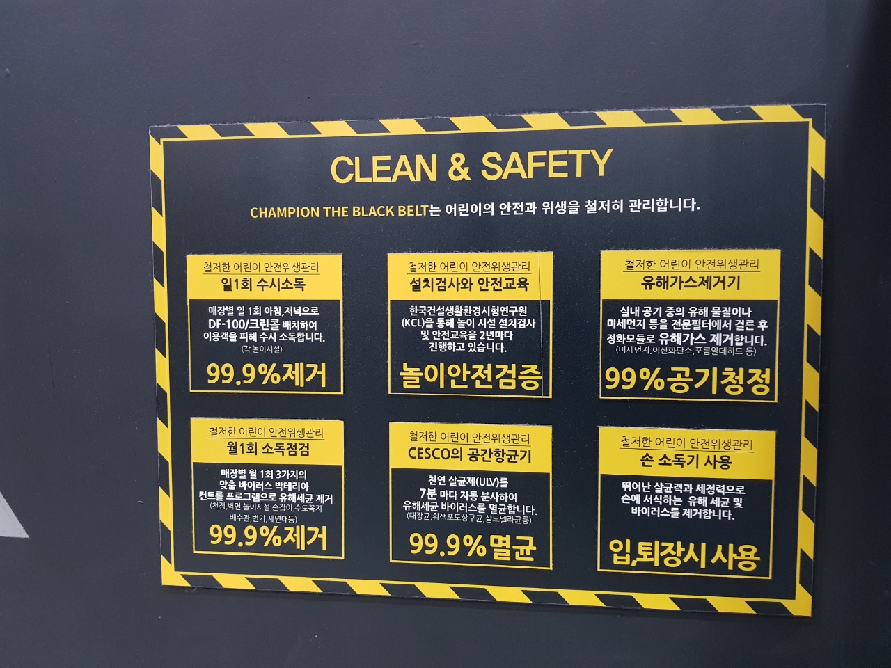 키즈카페가 아니라 어린이 실내 엑티비티 체험장 같았다. 아이가 어리고 아기자기한걸 좋아한다면 기존의 키즈카페가 나을 것이다. 딸아이와 같이 활동적이고 모험심이 강한 아이는 이곳 챔피언더블랙벨트를 추천한다. 조금은 무서워보이고 난이도 높은 놀이시설도 안전장비를 하고 선생님들의 지도와 보호하에 이루어지기 때문에 안전하다. 이용요금은 다른 키즈카페보다는 조금 비싼편이지만 이렇게 즐겁게 노는 아이를 보니 아깝지 않았고 충분한 값어치를 했다고 본다.