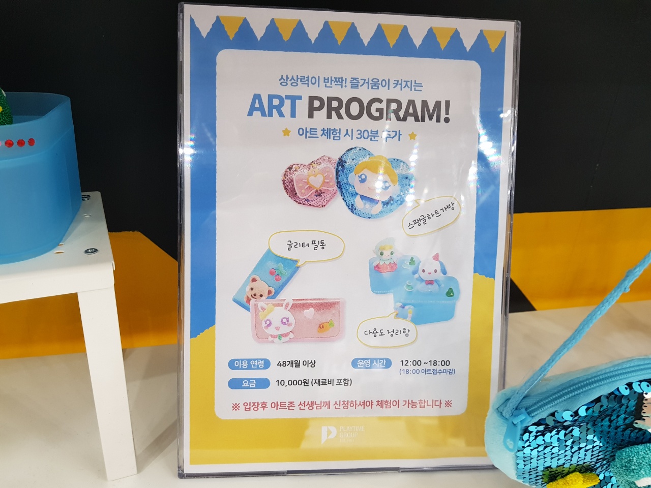 키즈파크내 유료 체험이 있는데 바로 아트체험 프로그램이라고해서 슬라임 만들기 이다. 가격은 1만원이며 아트체험 이용시 키즈파크 이용시간을 30분 추가해준다.