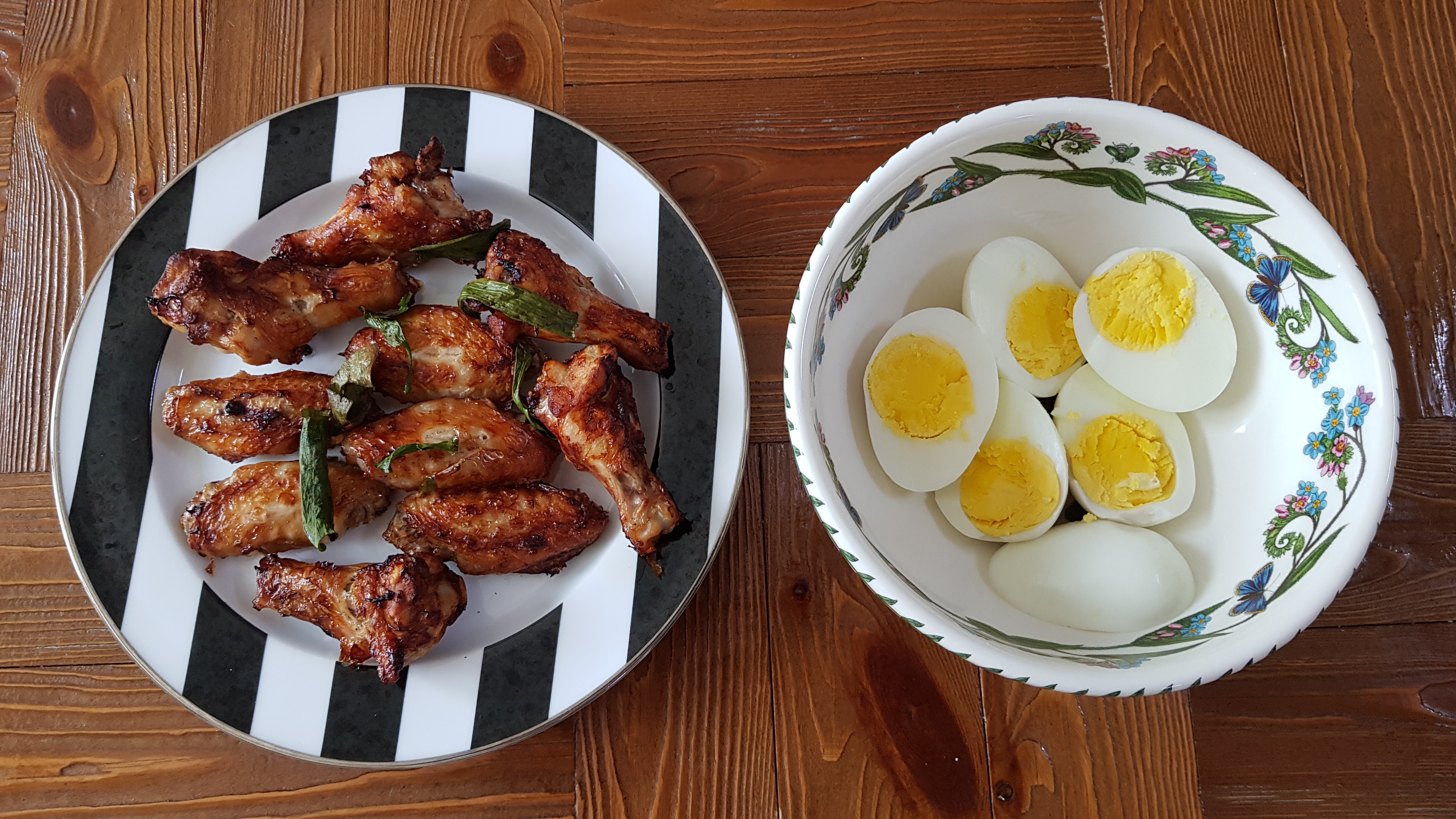 윙이 익어가는 동안 삶은 계란을 준비하고 노릇하게 잘 익은 윙/봉도 꺼내어 접시에 담아본다.