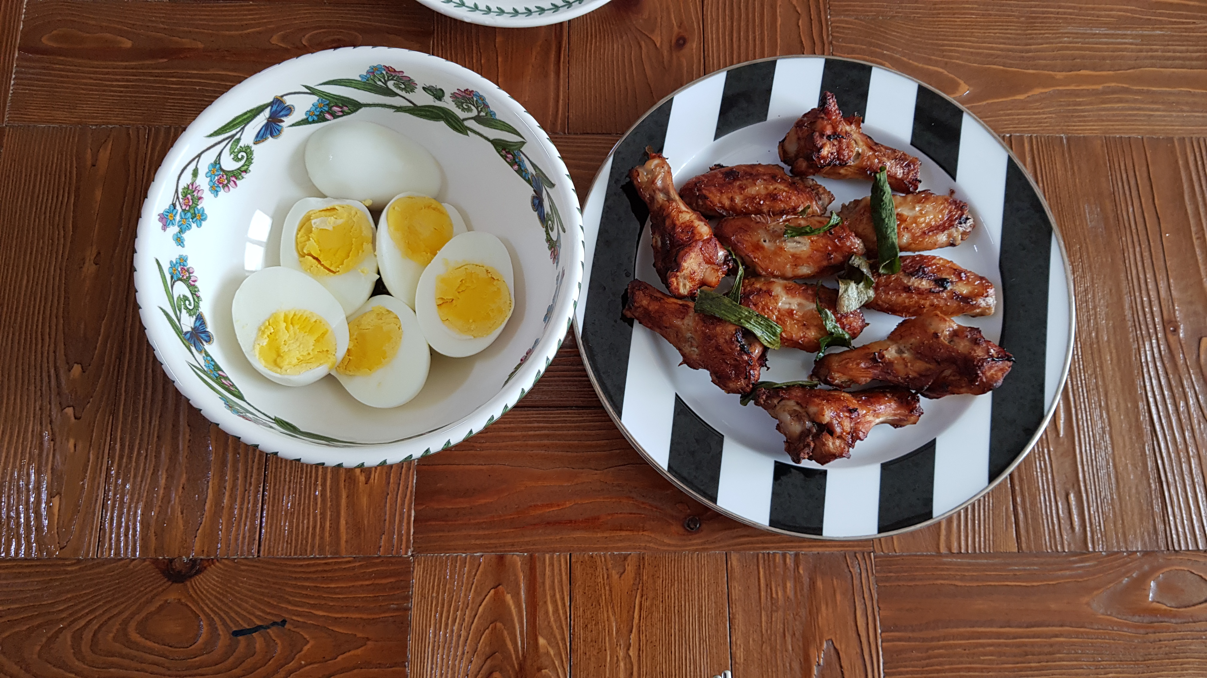 윙이 익어가는 동안 삶은 계란을 준비하고 노릇하게 잘 익은 윙/봉도 꺼내어 접시에 담아본다.