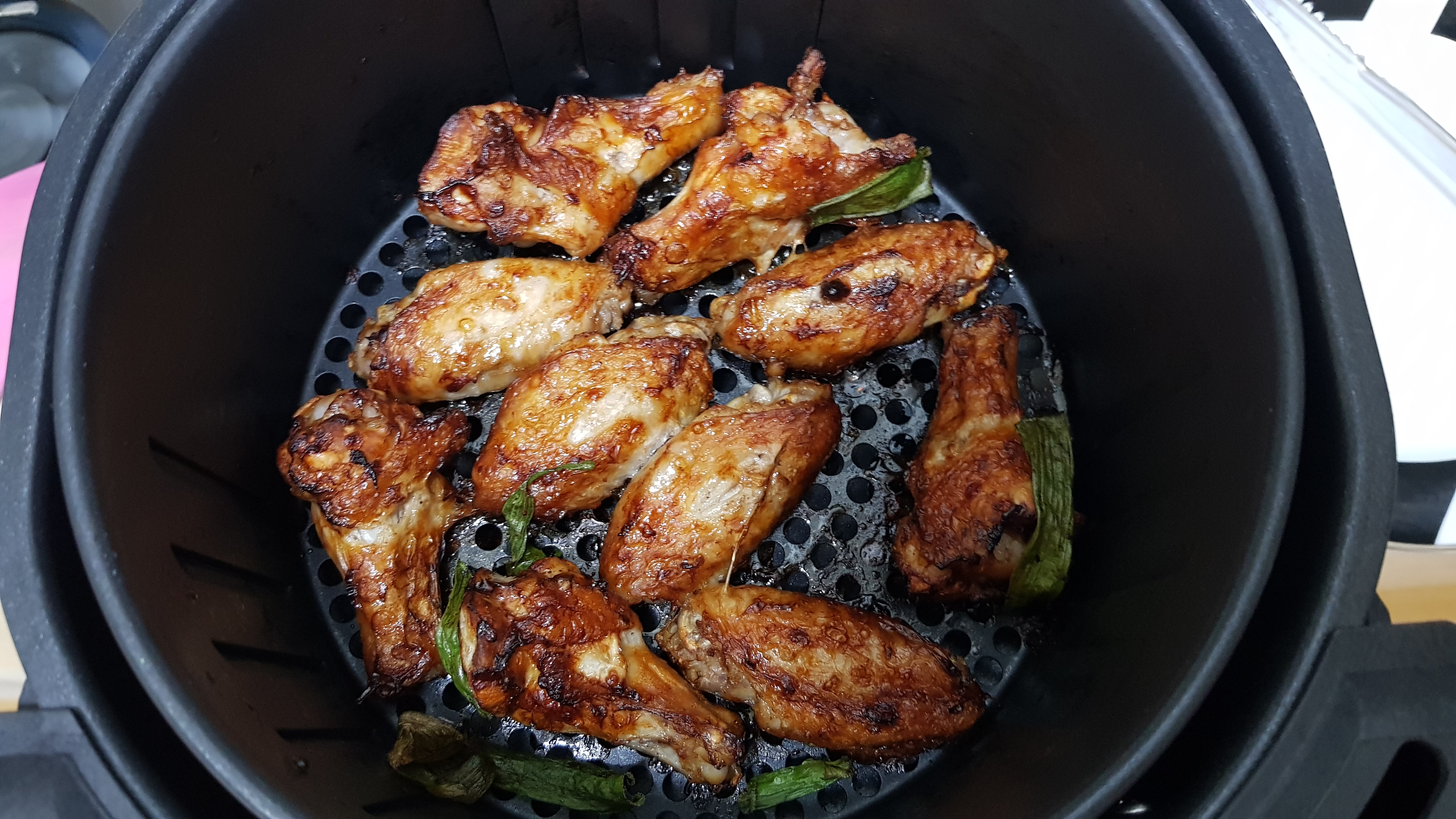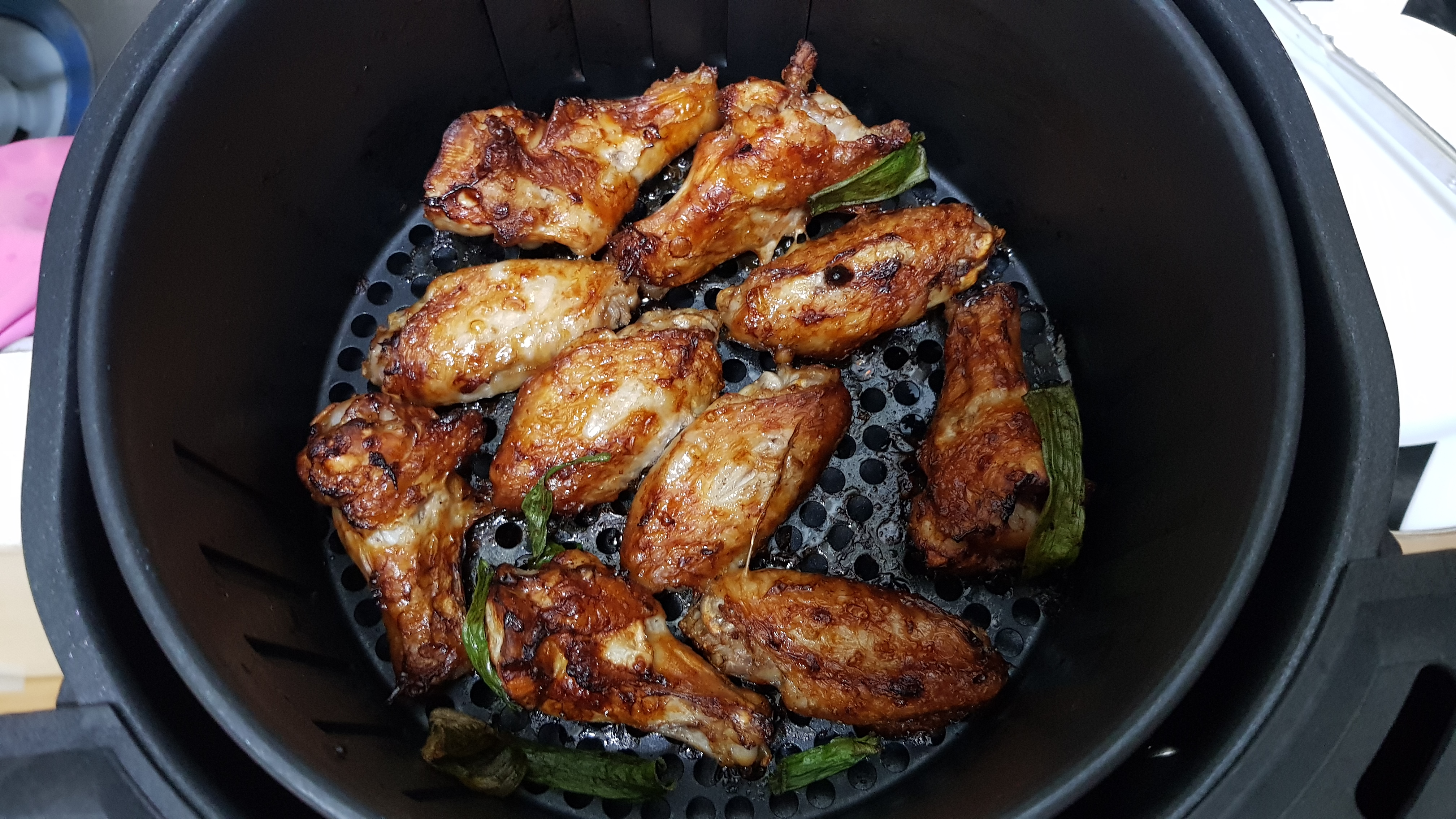에어프라이어는 먼저 가동시켜 3분정도로 예열을 해둔다. 예열이 다 되고나면 양념에 버무려진 윙과 봉을 에어프라이기에 겹치지 않게 잘 펴서 놓는다. 윙/봉을 에어프라이어에 놓은 다음 그 위에 듬성듬성 대파를 올린다.(대파는 맛 보다는 비쥬얼 담당이다) 그리고 에어프라이어를 돌리는데 처음에는 12분, 뒤집어서 8분정도 익히면 완성 된다.