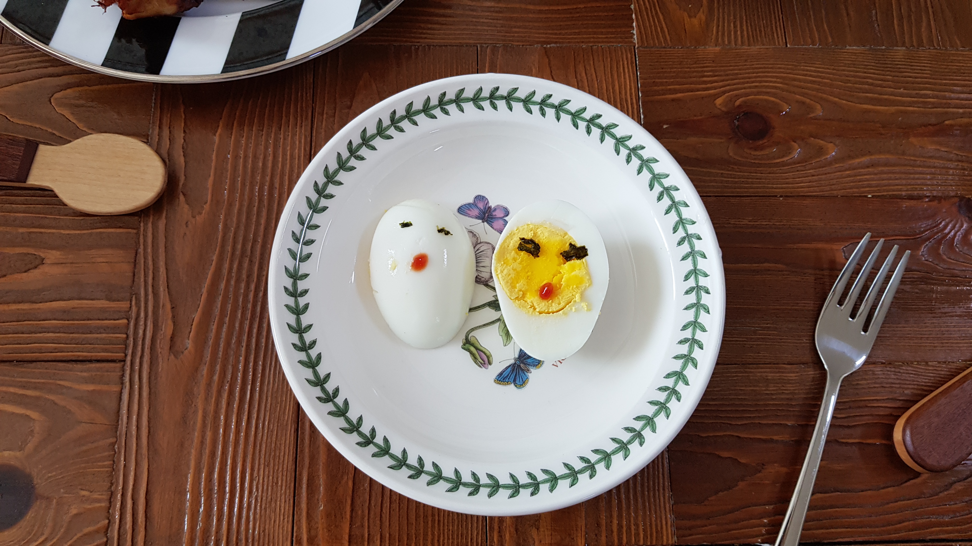 삶은 계란에는 심심하지 않게 김과 토마토 케챱으로 재미를 줘 봤다. 딸아이가 관심을 보이며 어서 먹겠다고 한다.
