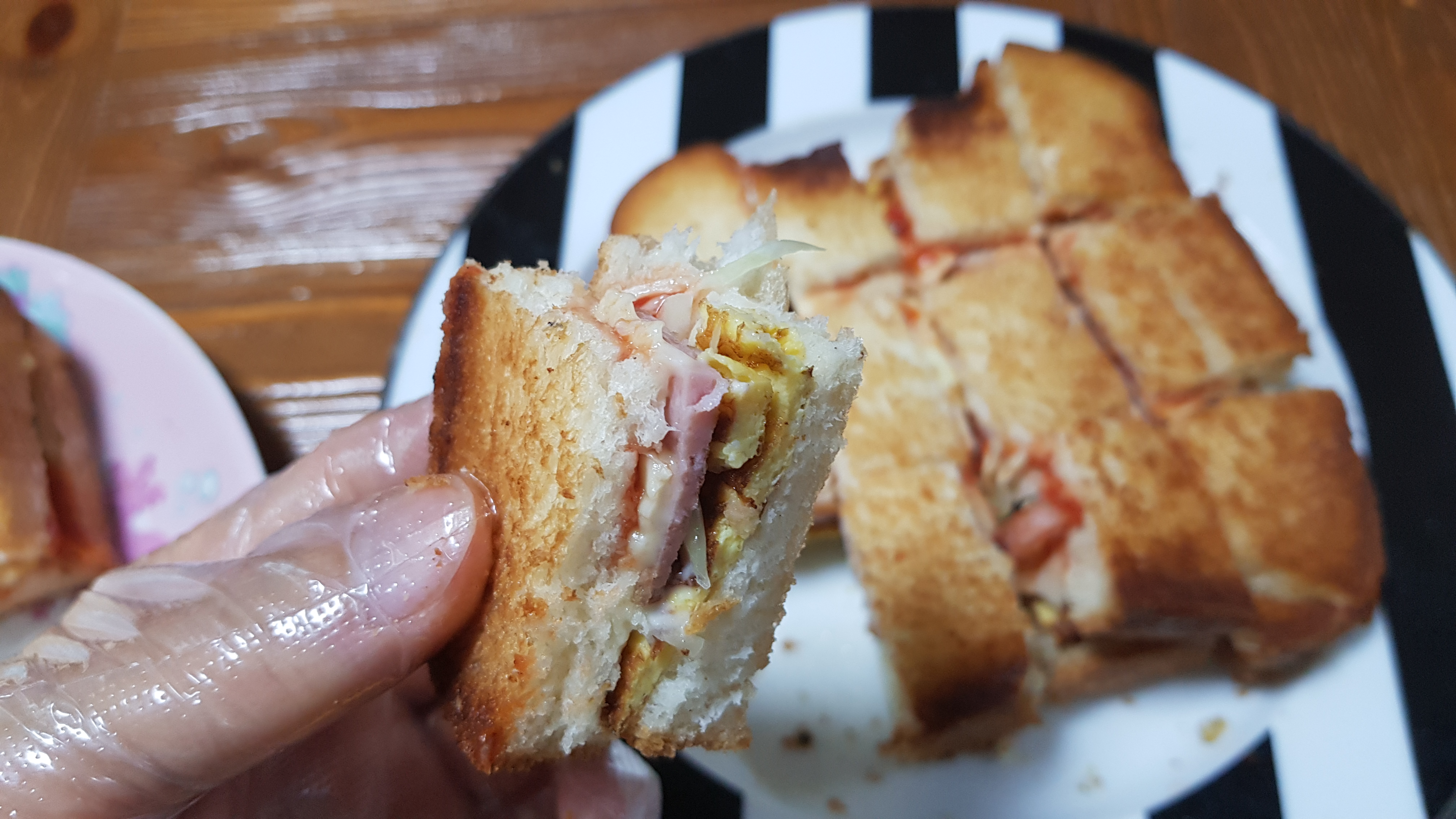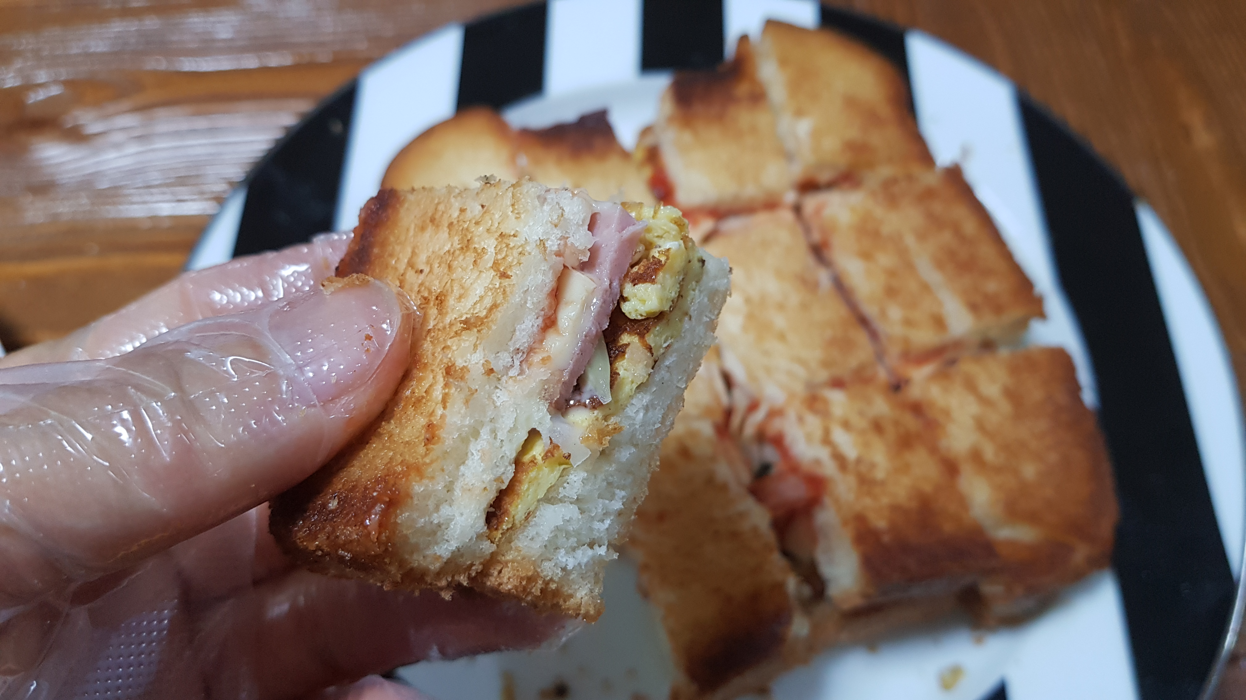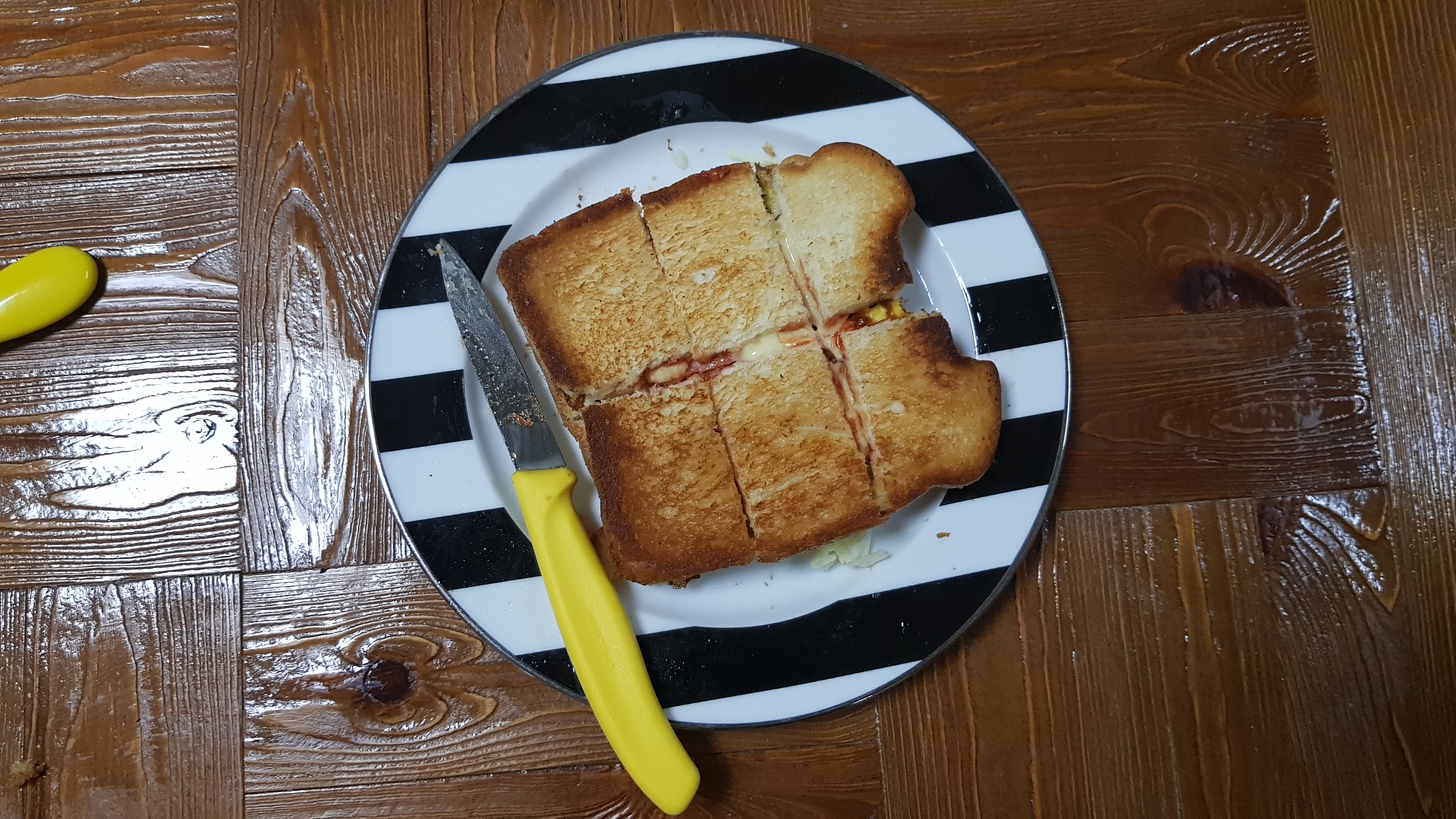 치즈는 잘 녹았지만 식빵의 겉부분이 타버렸다. ㅜ