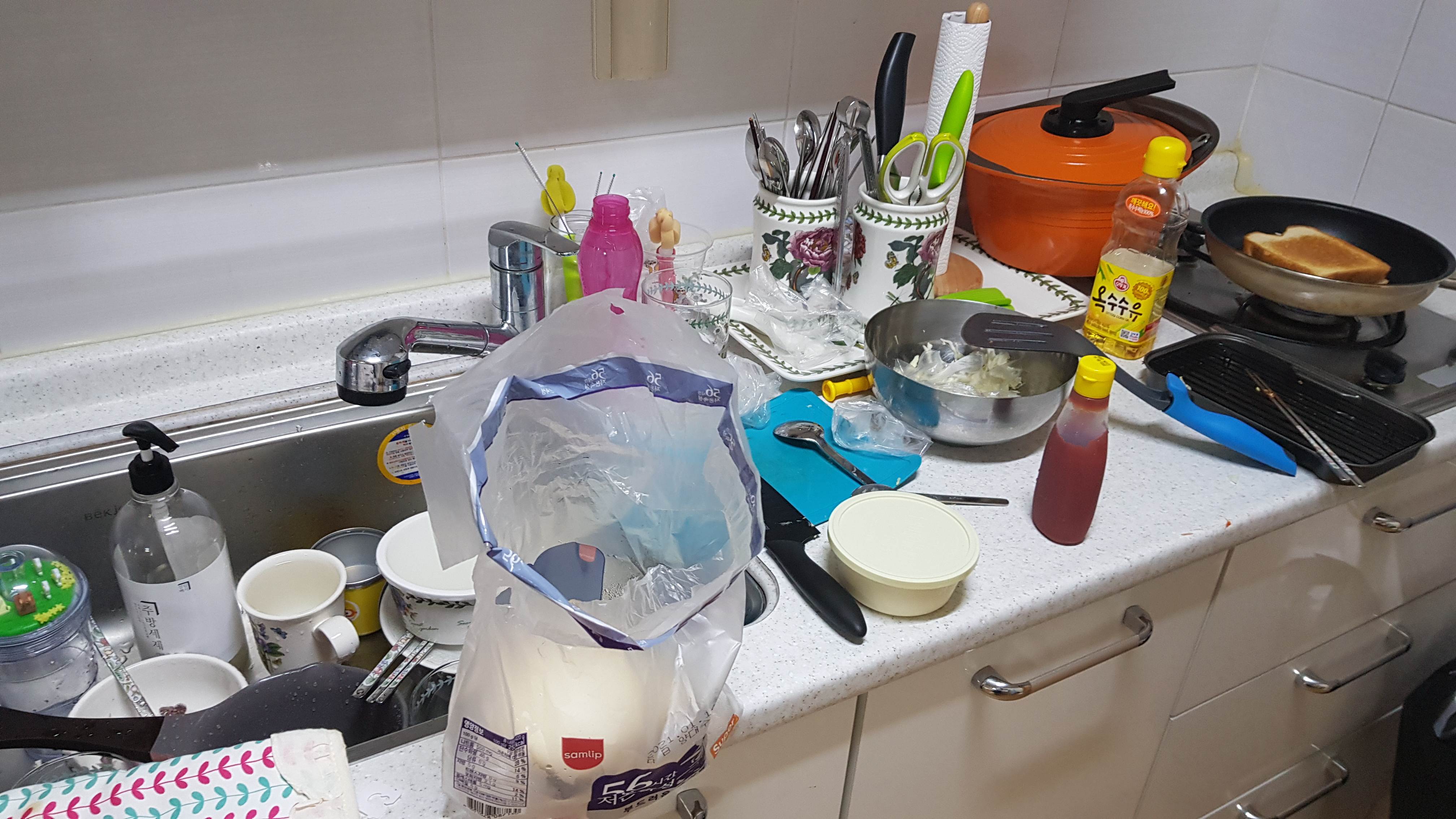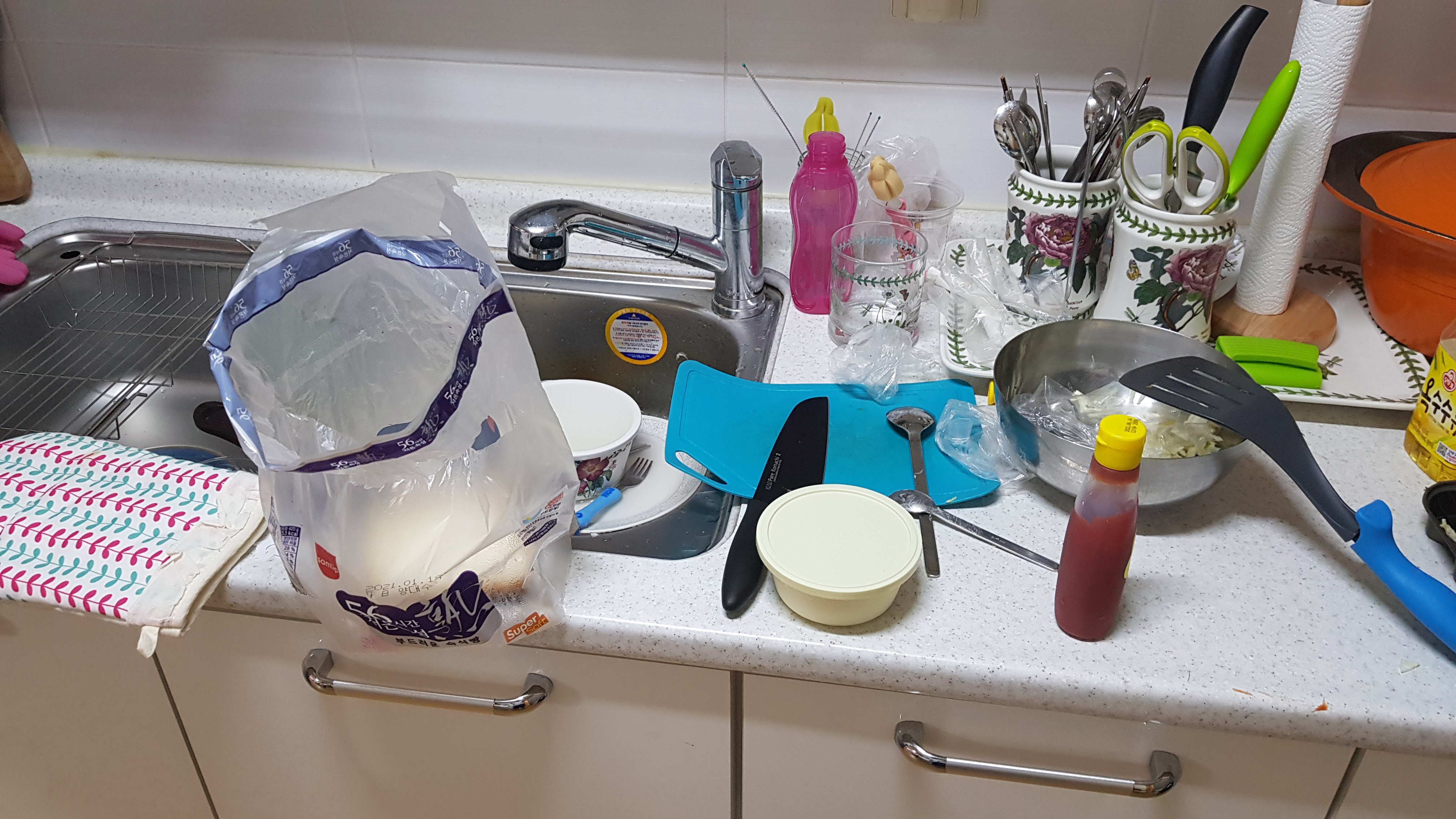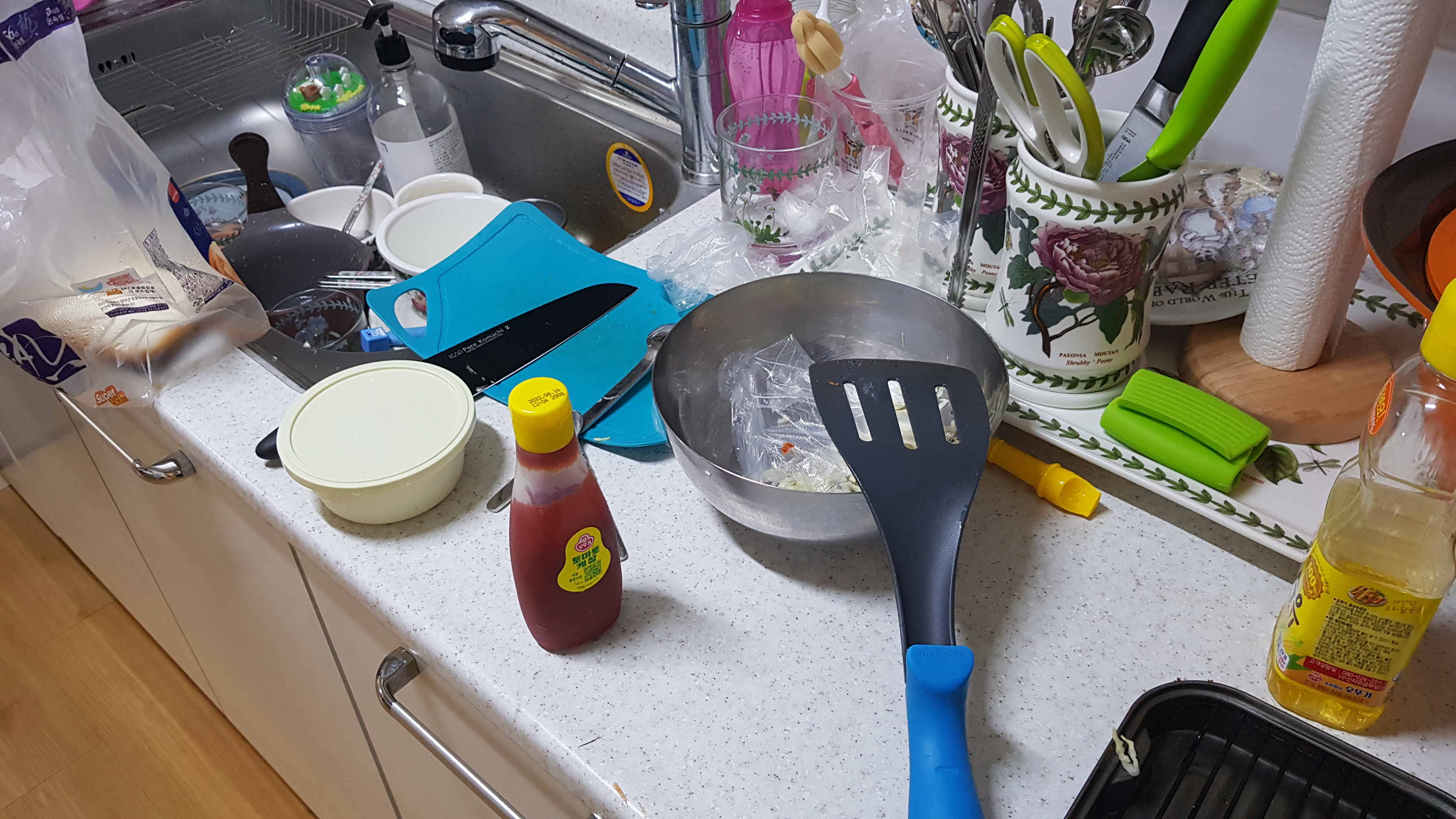 필자는 요리를 하면 널려놓고 하는 타입인가 보다. 보고 있자니 심난해서 일단 먹고 치우자며 식탁으로 간다.