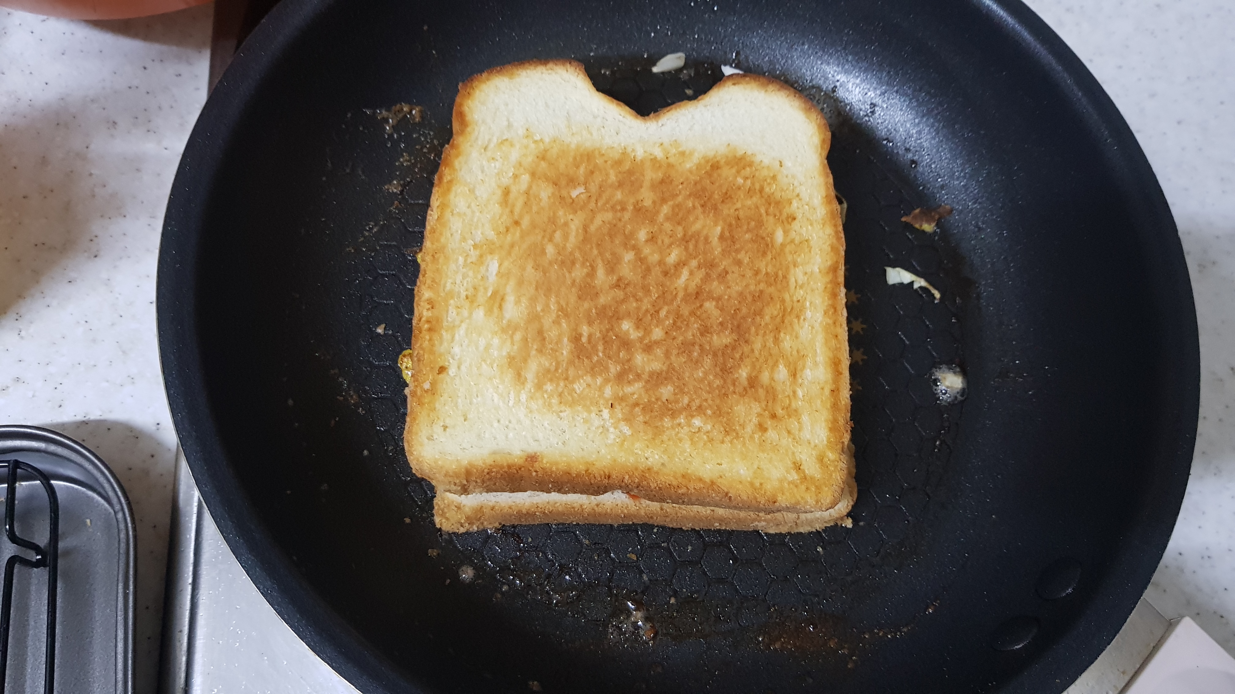 달구어진 후라이팬에 버터를 녹인 후 조립한 토스트를 굽는다. 익혀야하는 재료는 이미 준비과정에서 다 구워뒀기 때문에 치즈가 잘 녹을 수 있게 약한 불로 두번 뒤집어가며 굽는다.