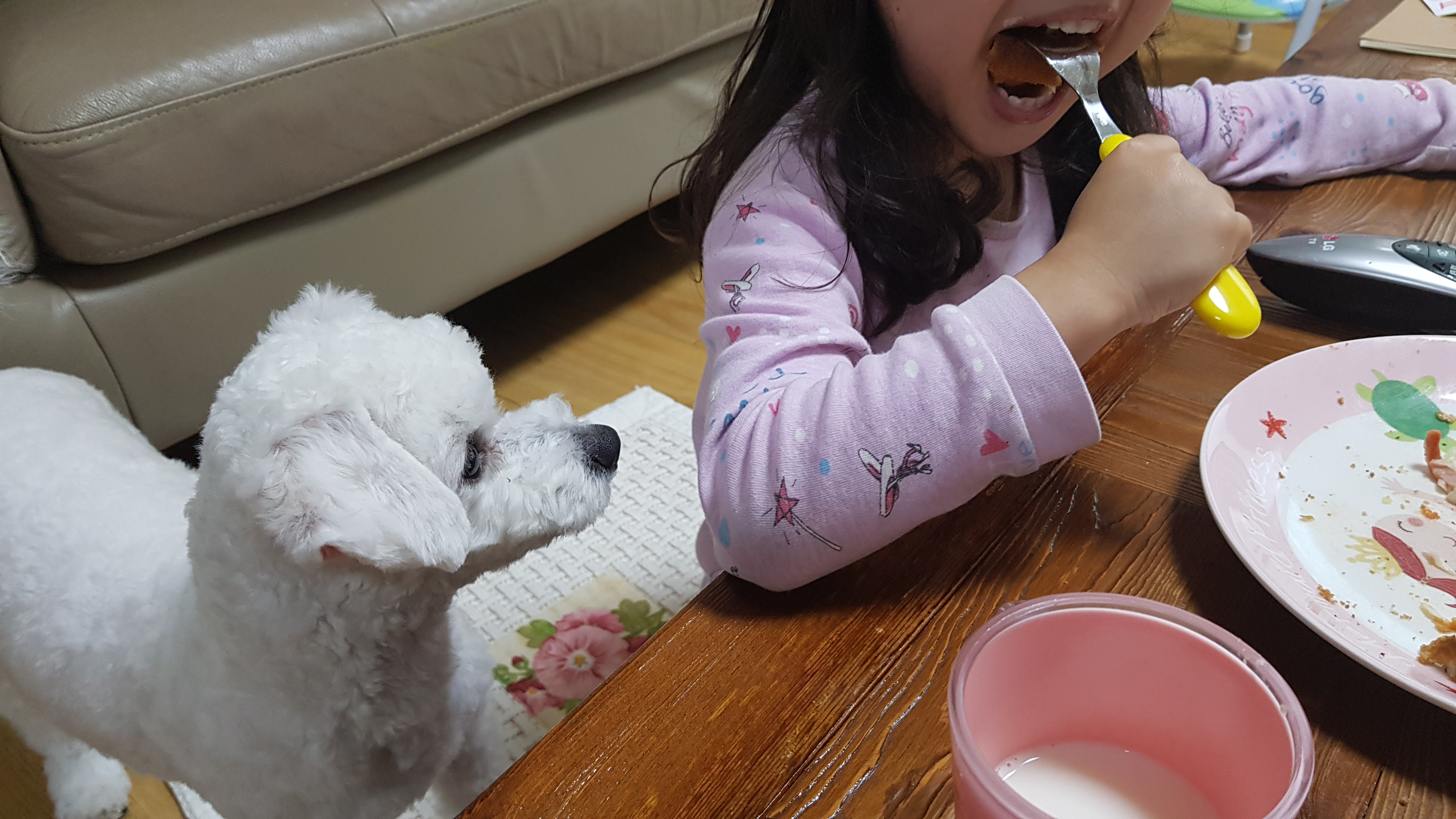 맛있게 잘 먹어주니 기분도 좋고 흐믓하다. 옆에서 마늘이도 나와 같은 심정일까? 개껌을 하나 주어야 겠다.