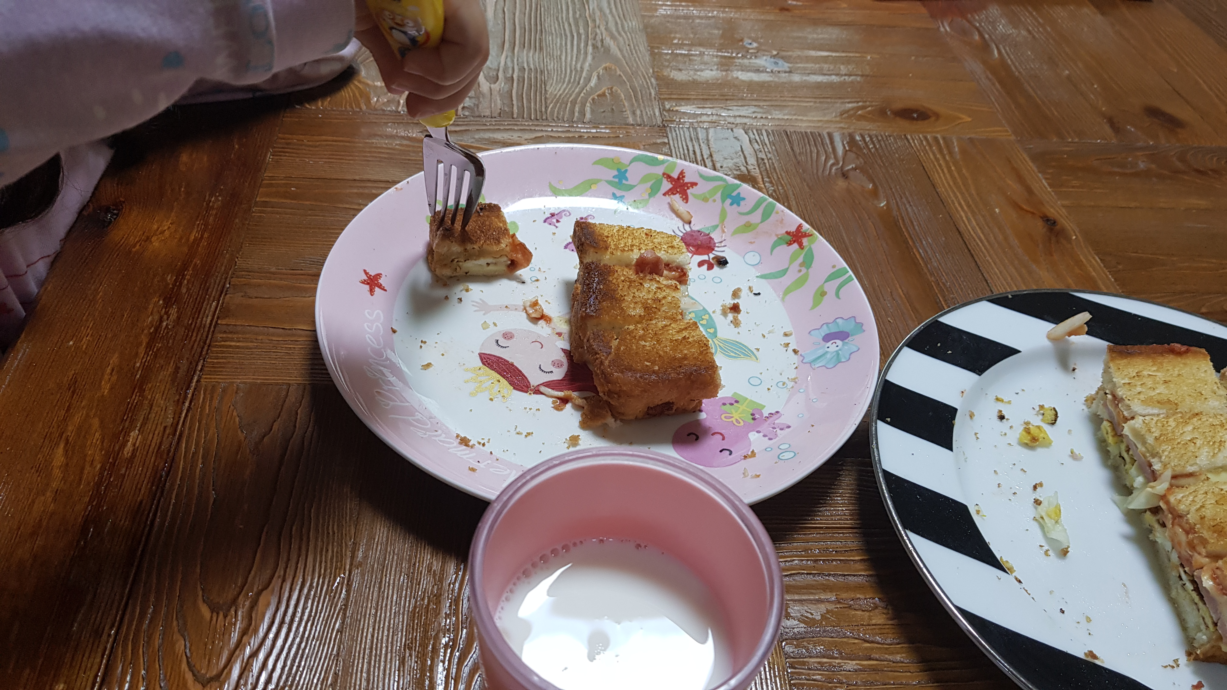 앞서 준비한 재료를 아이와 함께 조립한다. 식빵을 제일 밑에 두고 재료의 순서는 상관없이 선호하는 재료를 올리도록 한다. 단 싫어하는 것이라도 조금씩을 넣어야 한다는 요리규칙?을 정해서 재료가 골고루 소진 될 수 있도록 유도한다.