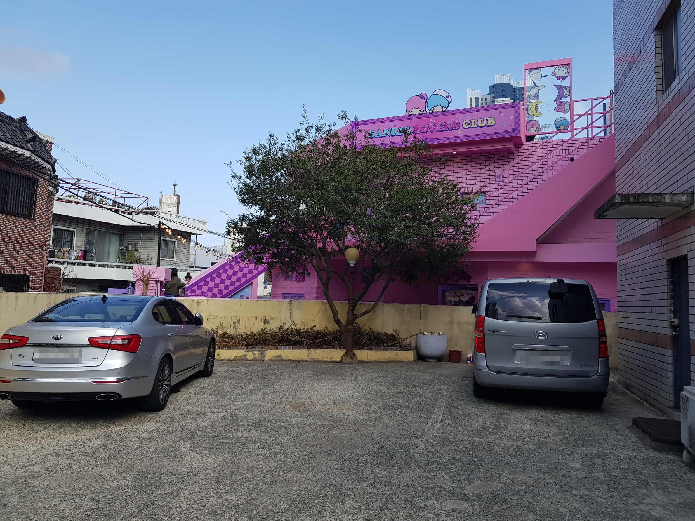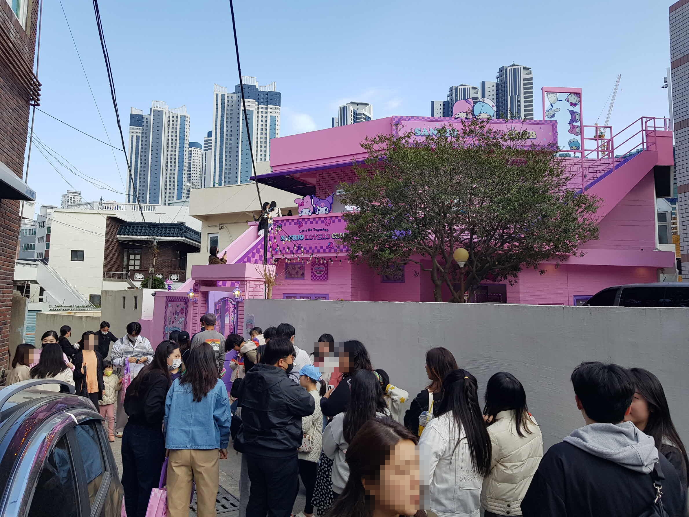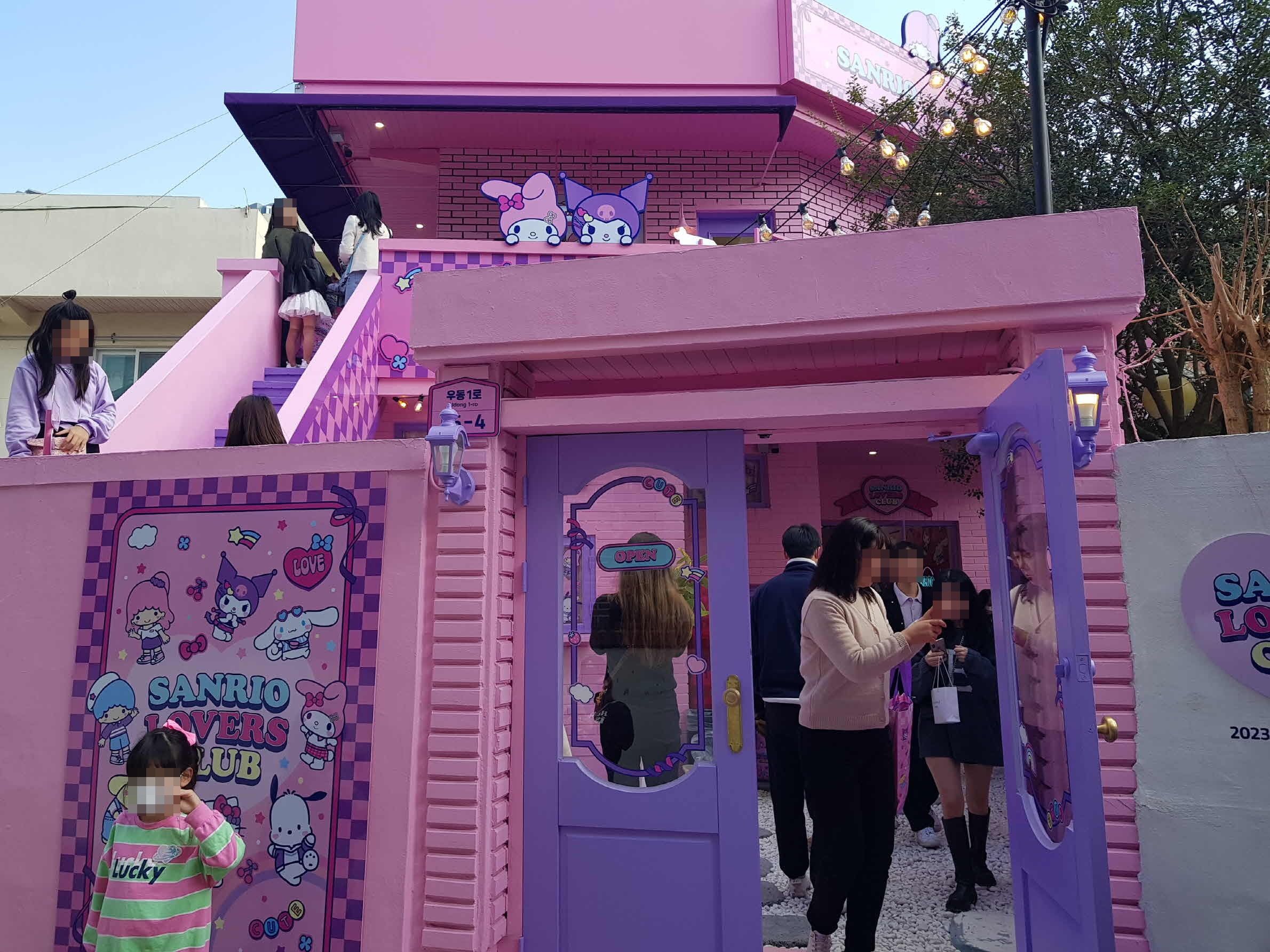 주차를 하고 산리오 러버스 클럽을 찾아 걸었다. 도로 안쪽으로 눈에 확 띄는 핑크색 건물이 보이고 사람들이 많이 몰려있는 모습도 보인다.