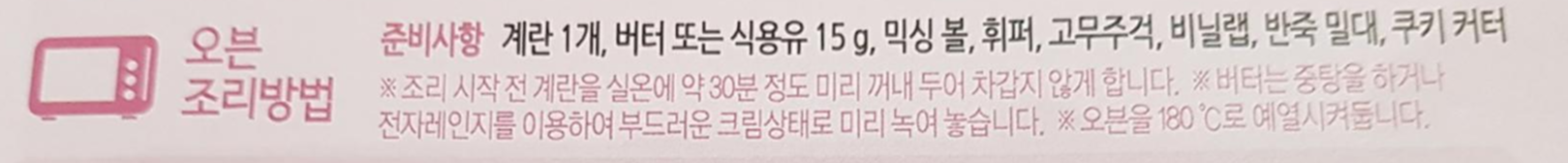 마트에 가기전에는 쿠키만들기 세트를 사면 쿠키틀과 밀대까지 다 들어있을 것으로 생각했었다. 큐원 영양쿠키믹스 상자 뒤에 써있는 준비사항(준비물)을 보니 이 상자에는 쿠키가루만 들어있고 나머지 부재료와 도구는 따로 사여한다.