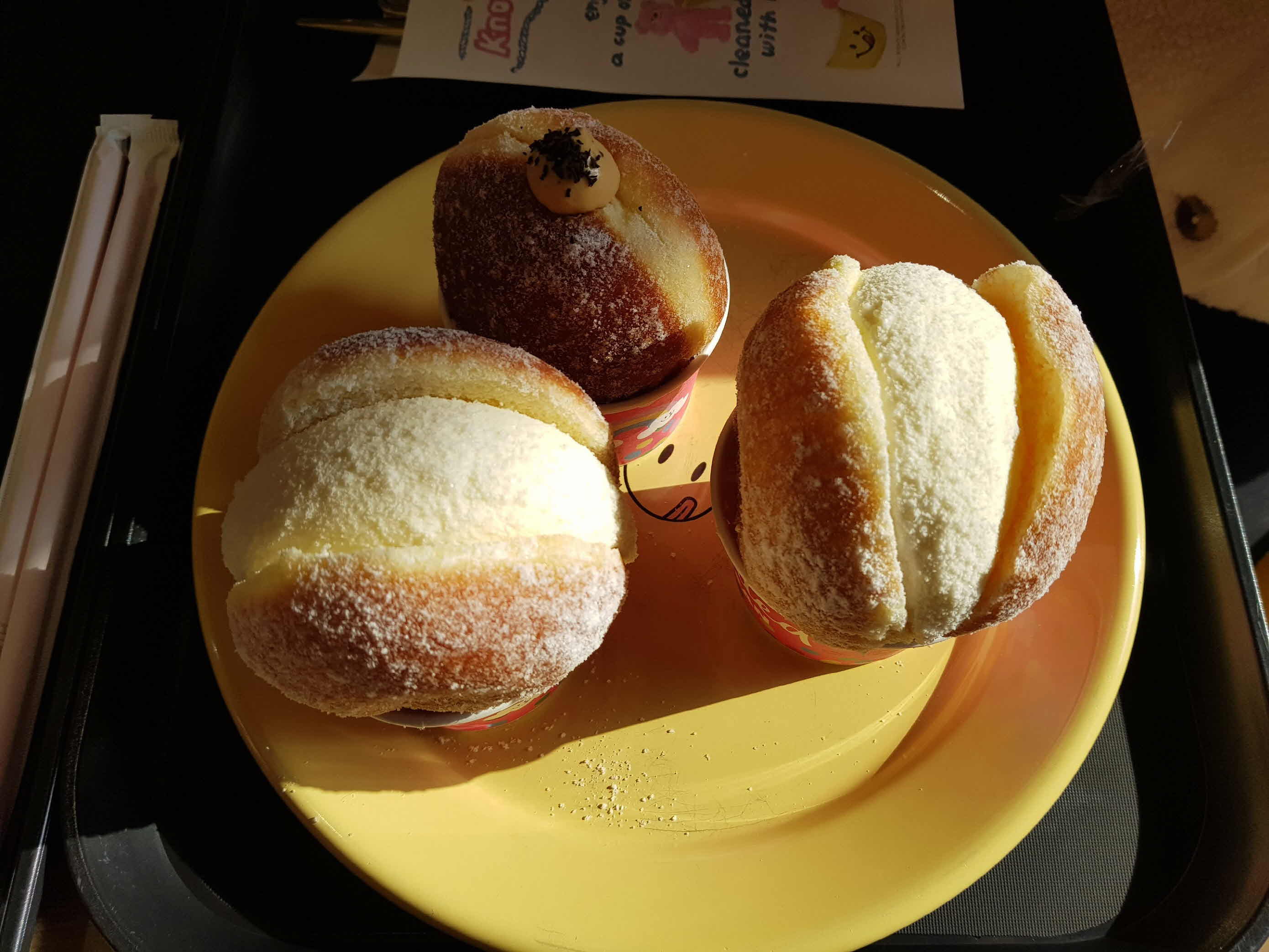 우유 생크림 도넛과 얼그레이 도넛. 생크림이 빵 사이에 가득 들어있어 입이 다물어지지가 않는다. 스푼을 주니 생크림을 스푼으로 떠먹어 가며 도넛을 베어 먹으니 먹기도 좋고 다채로운 맛을 느낄 수 있어서도 좋다.