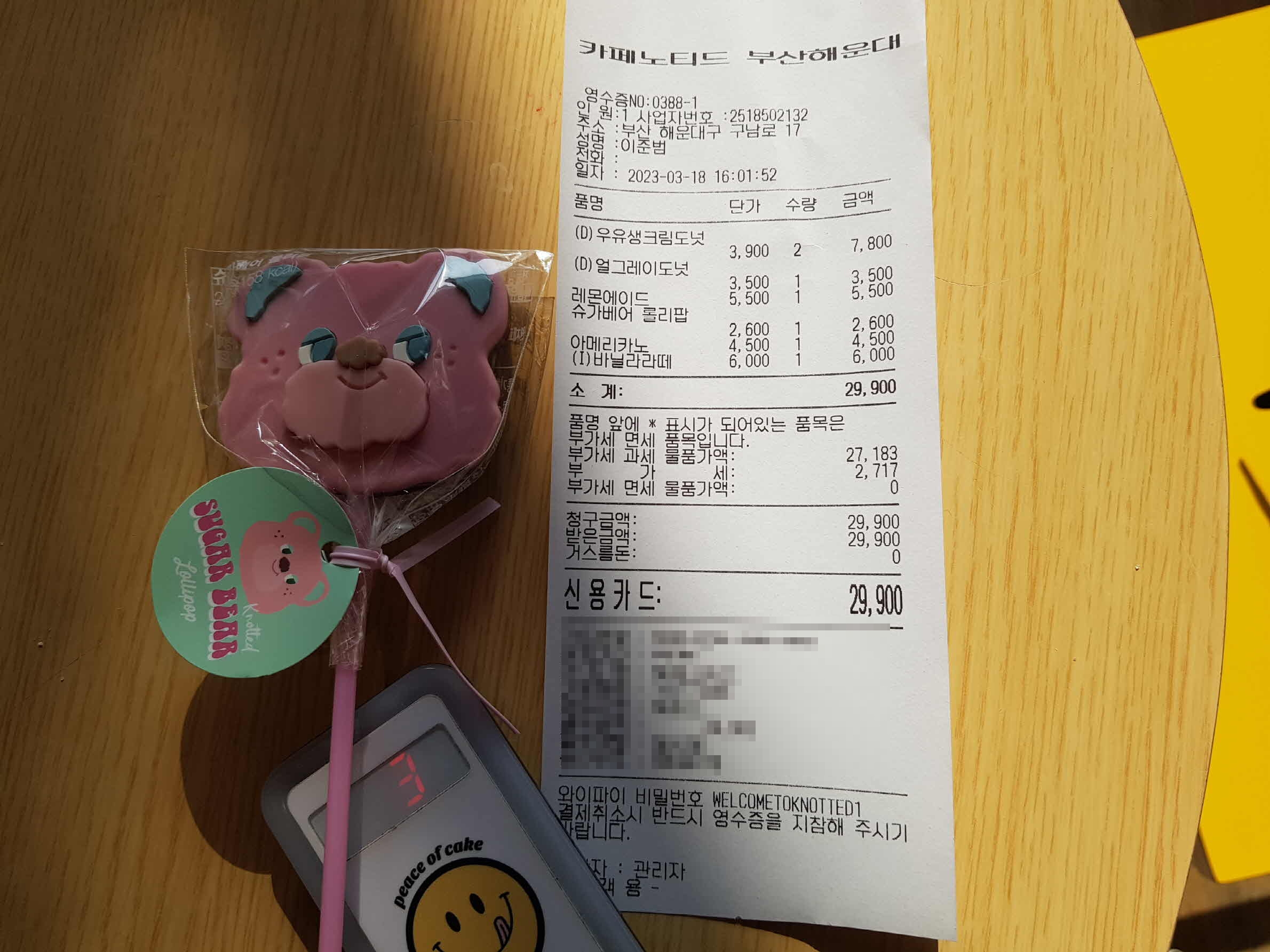 이번에 우리가 주문한 메뉴는 우유 생크림도넛 2개, 얼그레이도넛 1개, 레모네이드, 롤리팝, 아메리카노와 바닐라라떼이다.