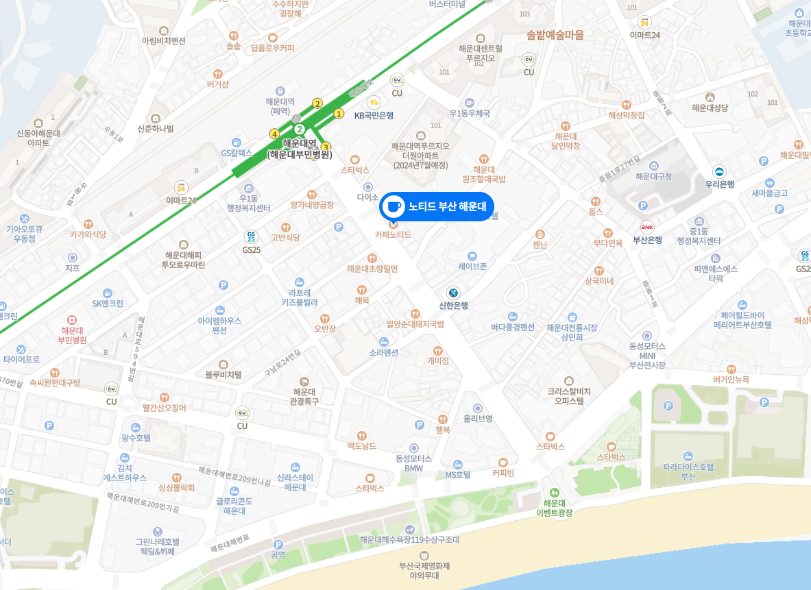 카페 노티드 해운대점은 해운대역 3번 출구에서 내려 해운대 해수욕장이 있는 쪽으로 조금만 걸어가다 보면 왼쪽 편에 위치해 있다.