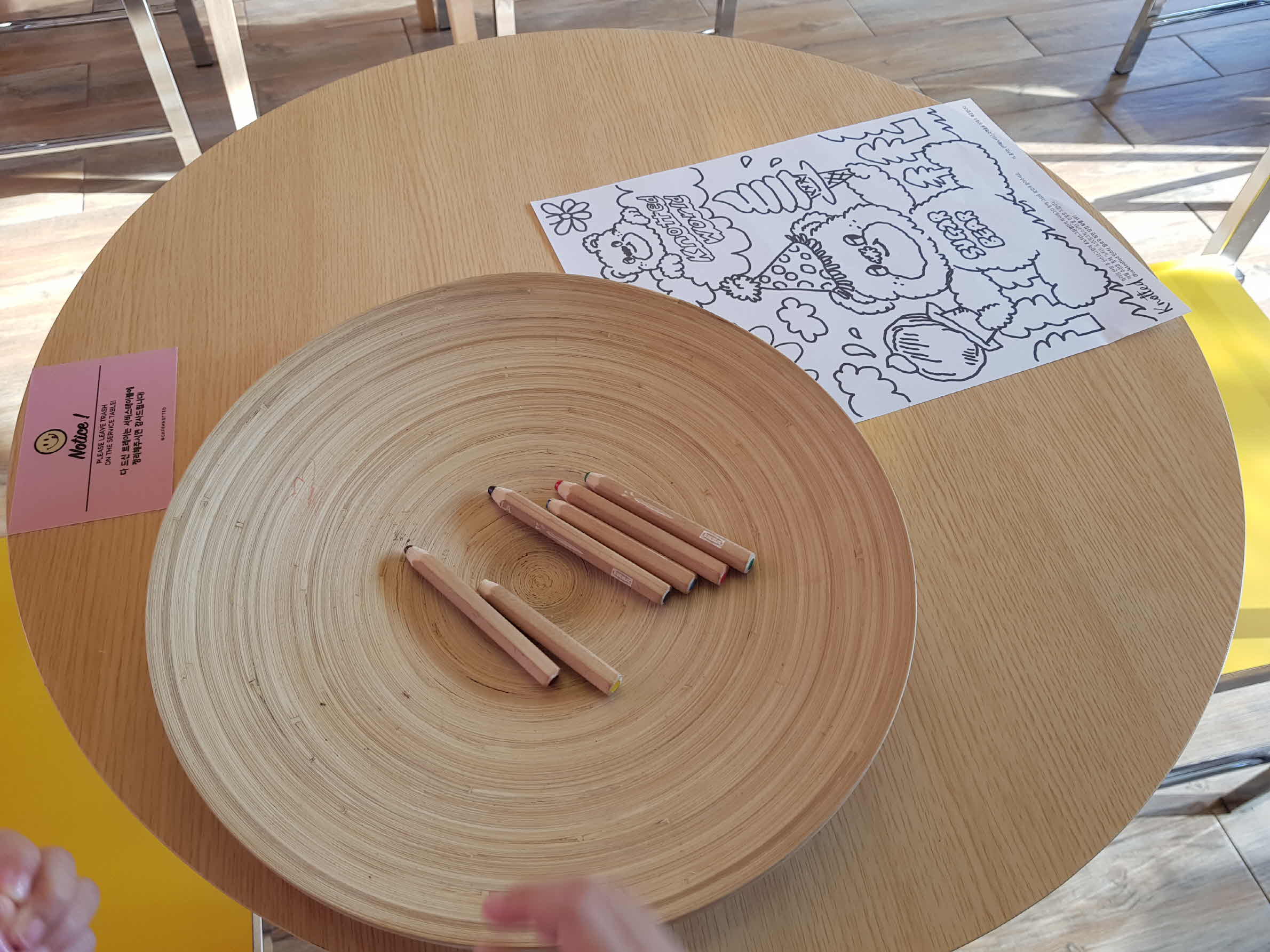 노티드 카페 3층으로 가면 아주 큰 테이블이 있다. 이 테이블에는 색연필과 색칠을 할 수 있는 종이가 있어 누구든지 가져다 그림을 그리고 색칠할 수 있다. 그리고 노티드 스마일 마크 스티커도 있어 스티커로 꾸미기도 할 수가 있다.