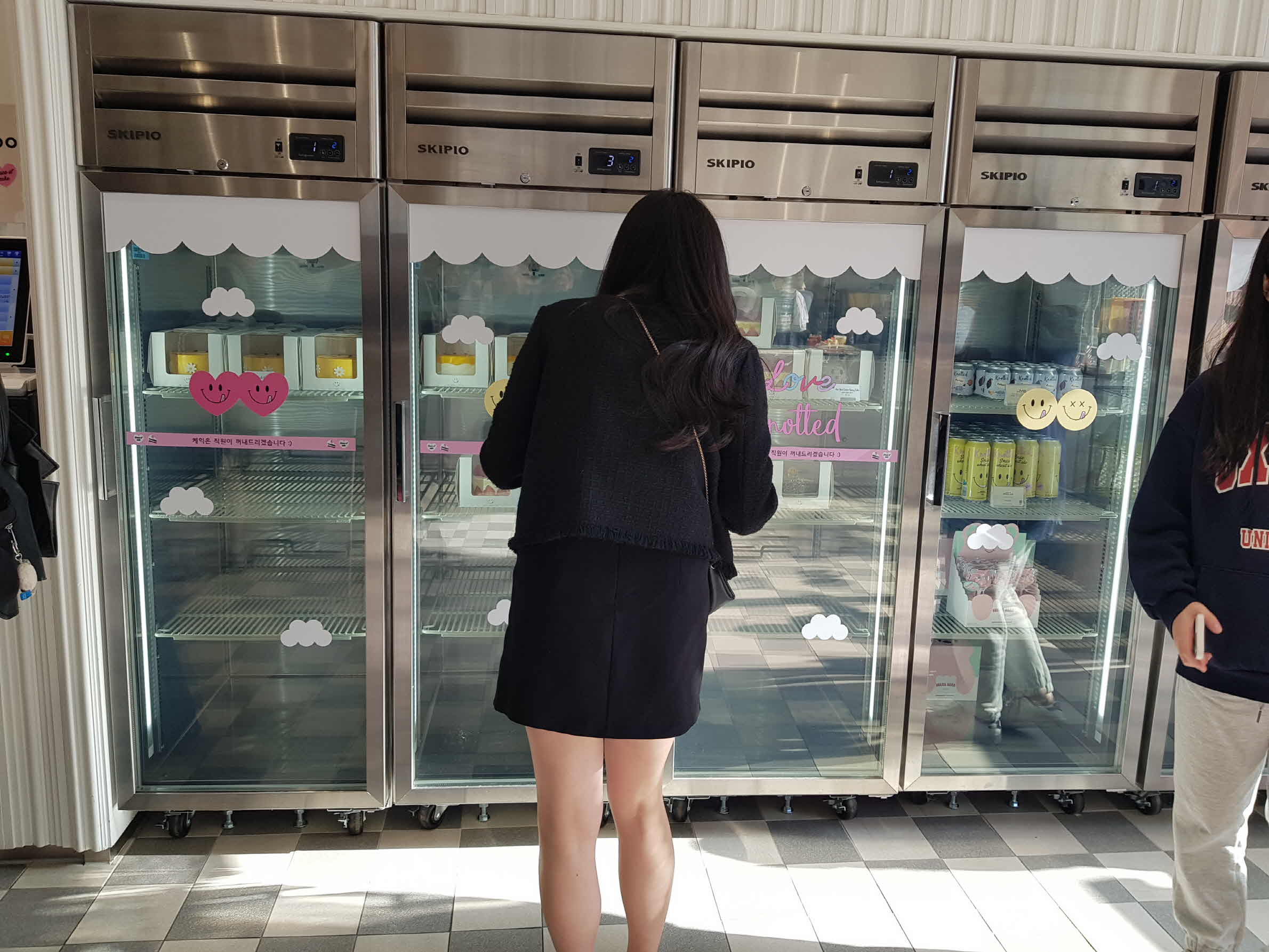 카운터 맞은편에는 케이크와 캔음료를 보관하고 있는 냉장고가 있다.