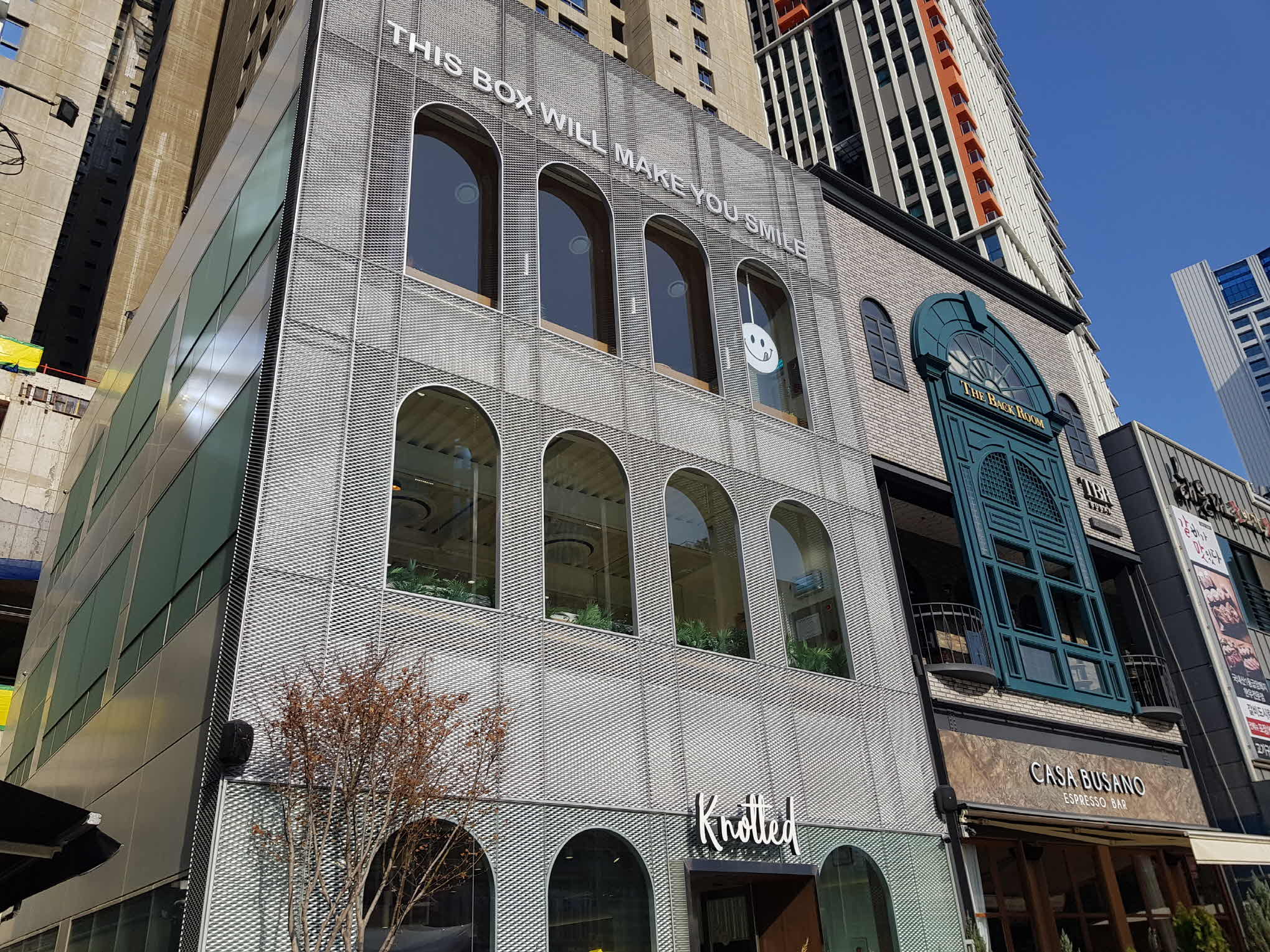 얼마 지나지 않아 왼쪽 편에 3층짜리 노티드 건물이 보인다. 노티드의 마크인 쩝쩝 이 스마일이 3층 유리창에 붙어있다.