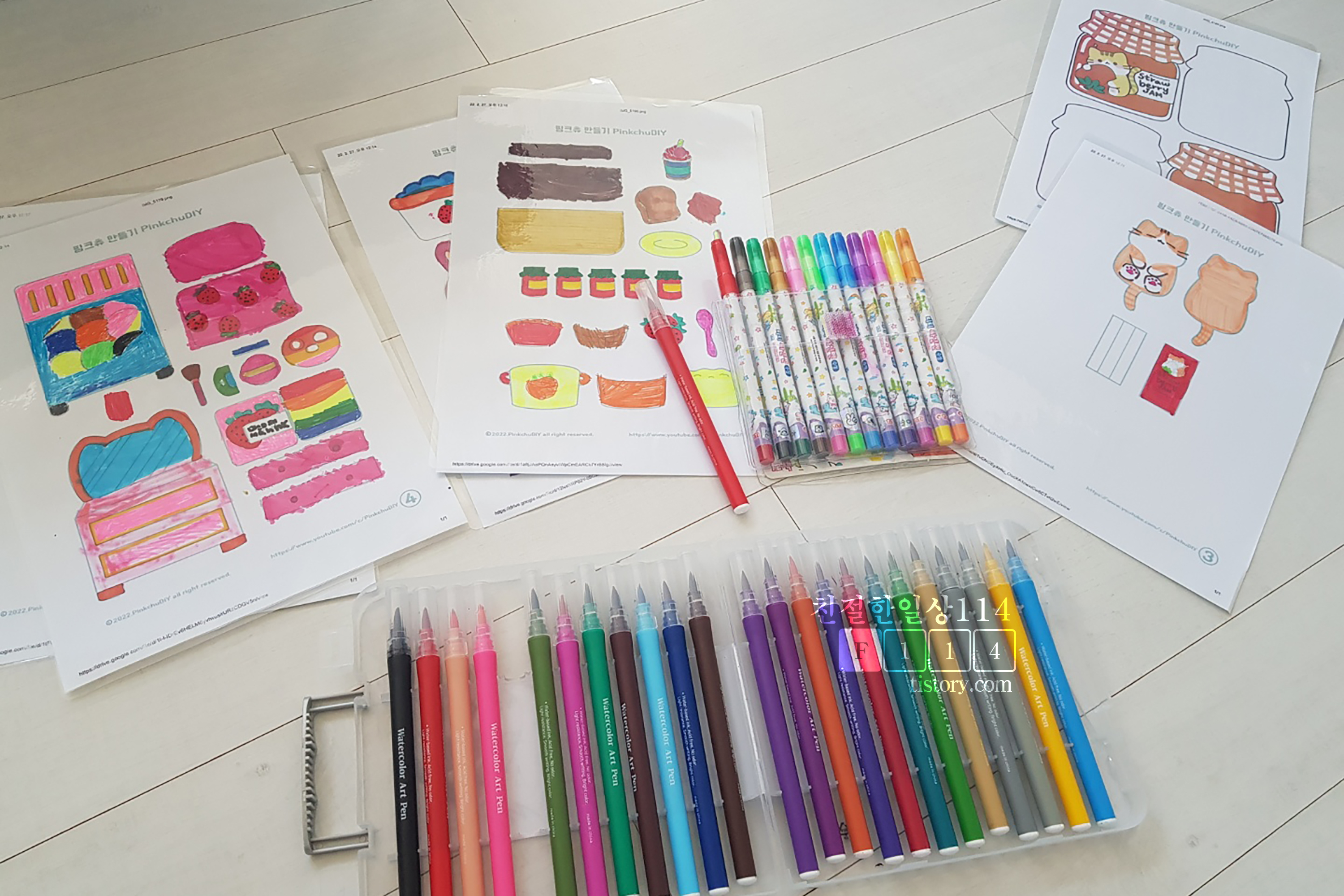 준비물이 생각보다 많다. 집에 왠만한건 있거나 아니면 문구점, 다이소에서 살 수 있겠지만 프린트기나 코팅지가 있어야 만들 수 있다. 무료도안으로 프린트를 해야하며 도안은 색칠이 되어져있는 컬러 도안과 색칠을 해야하는 흑백 도안 두 종류가 있다. 준비물 중 코팅지 대신 테이프로 할 수는 있겠지만 중노동이 될 것 같기에 추천하지는 않는다. 만들기 도중 칼을 사용해야 하므로 어른과 함께 만들어야 겠다.