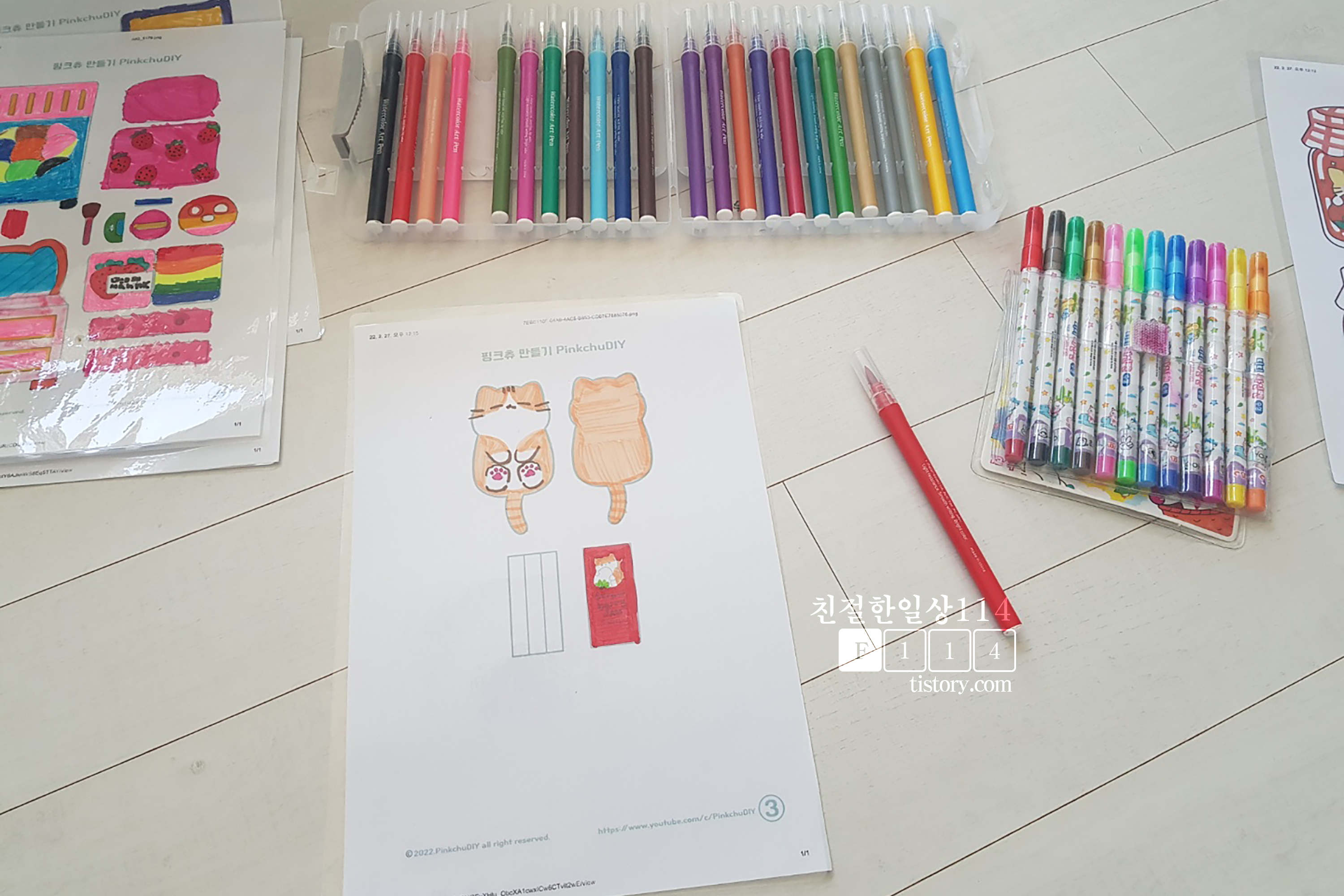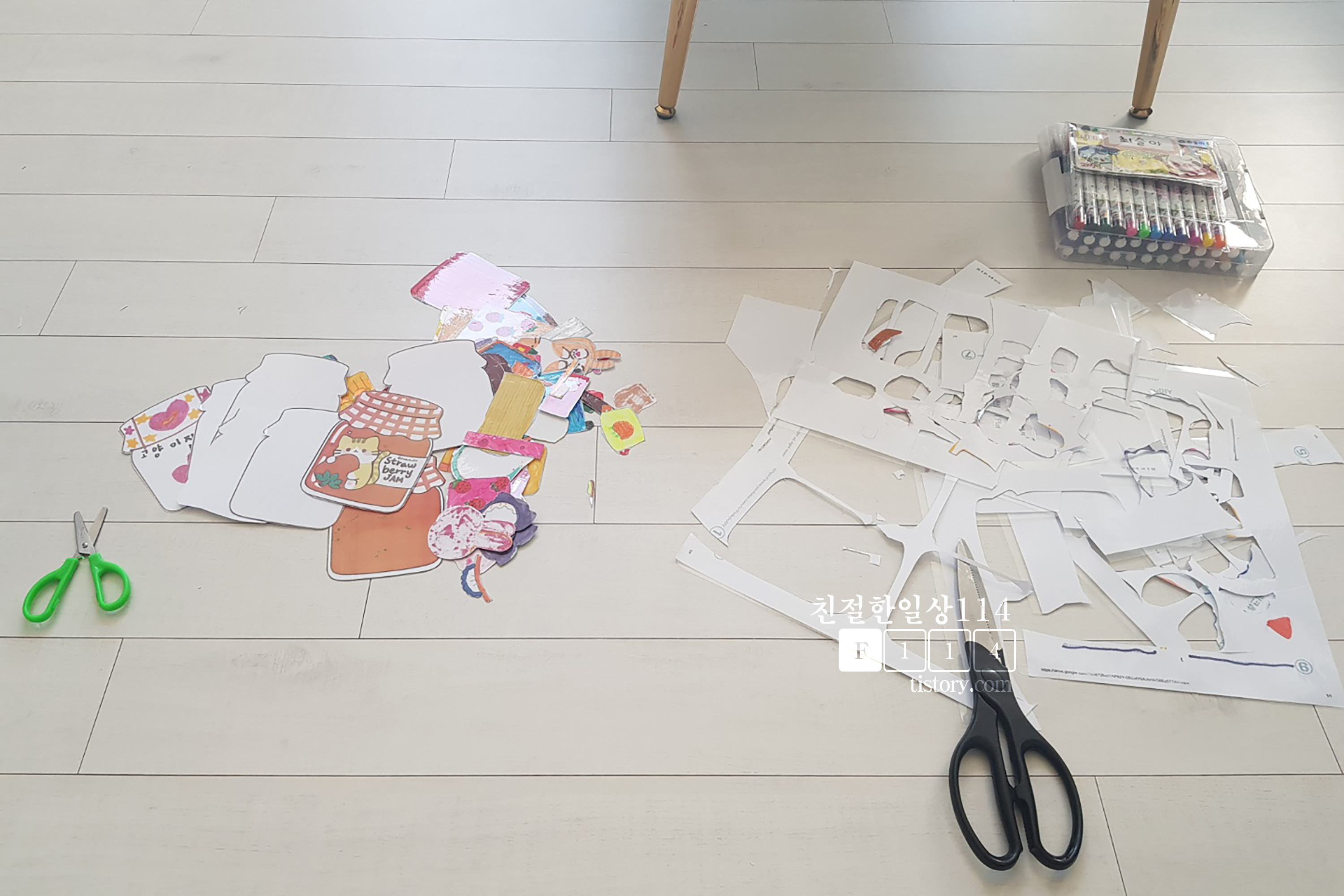 아이가 색칠하는걸 좋아해서 같이 색칠놀이하면서 만들어 나간다. 싸인펜으로 색칠을 했는데 색칠한 부분이 크고 많은 부분은 붓펜으로 해서 쉽고 금방 할 수 있었다.