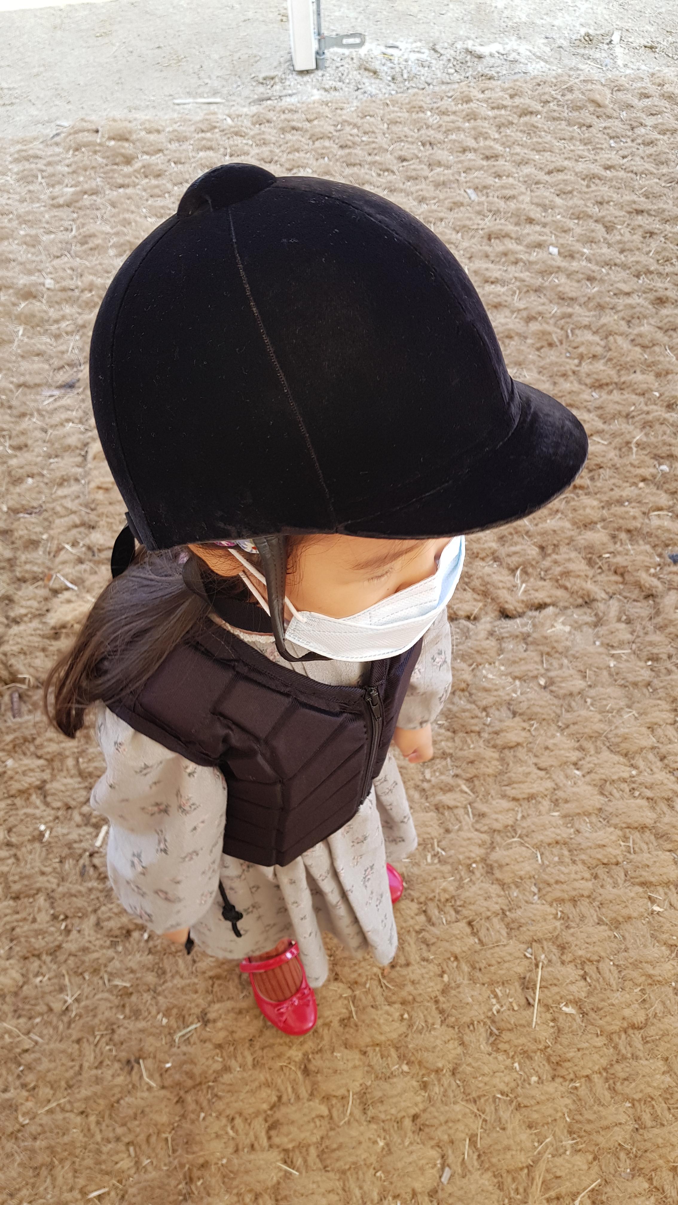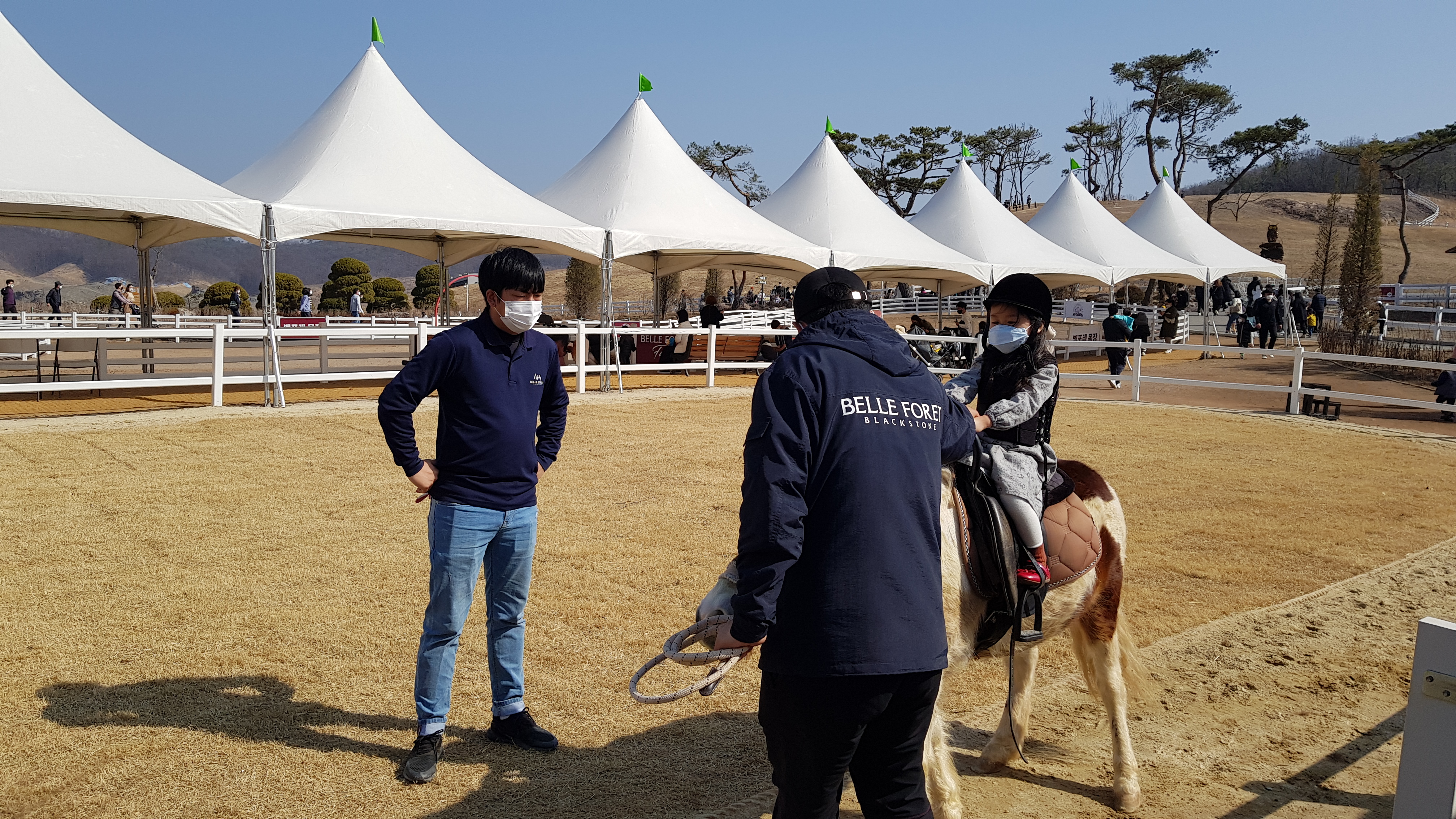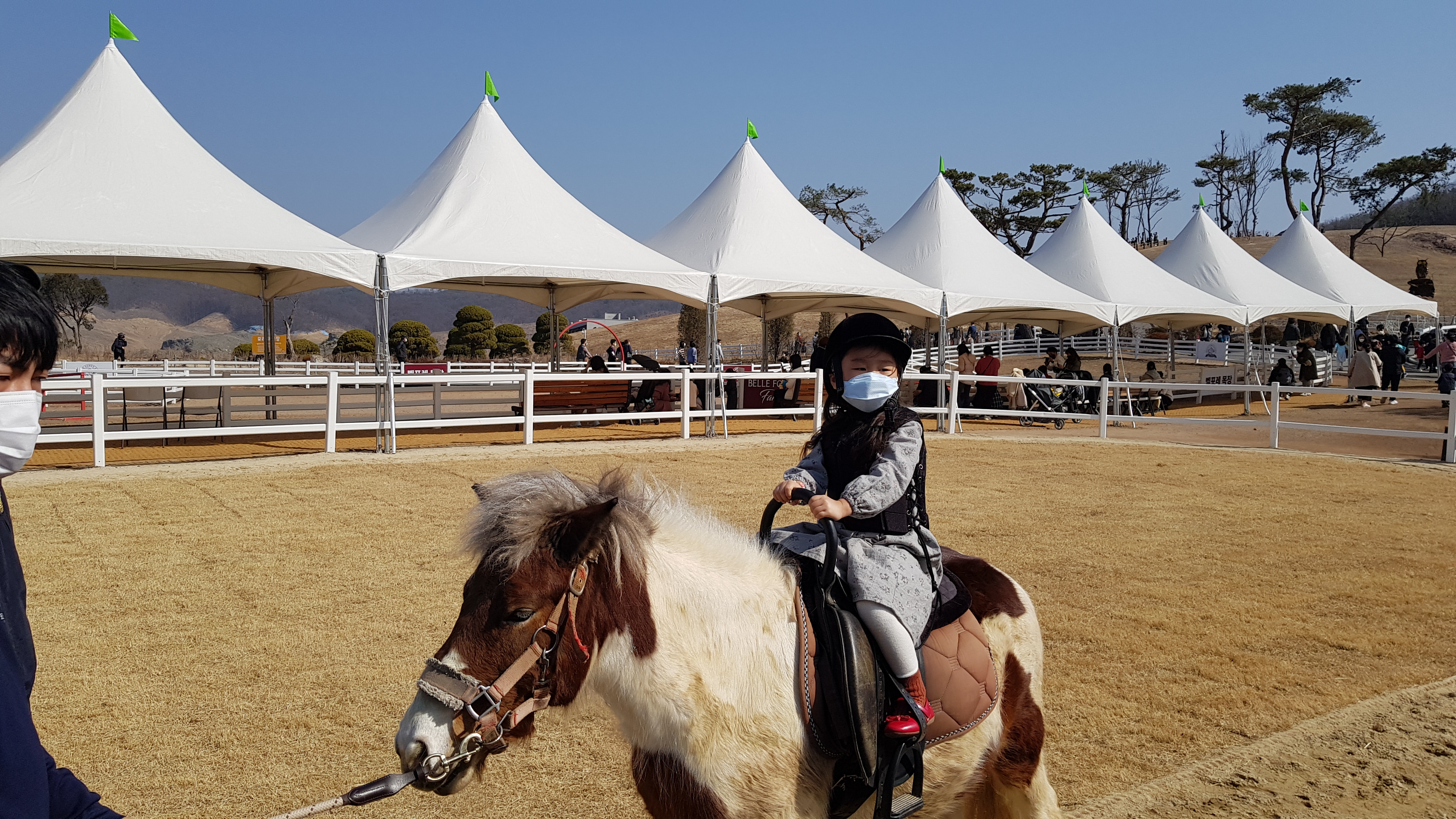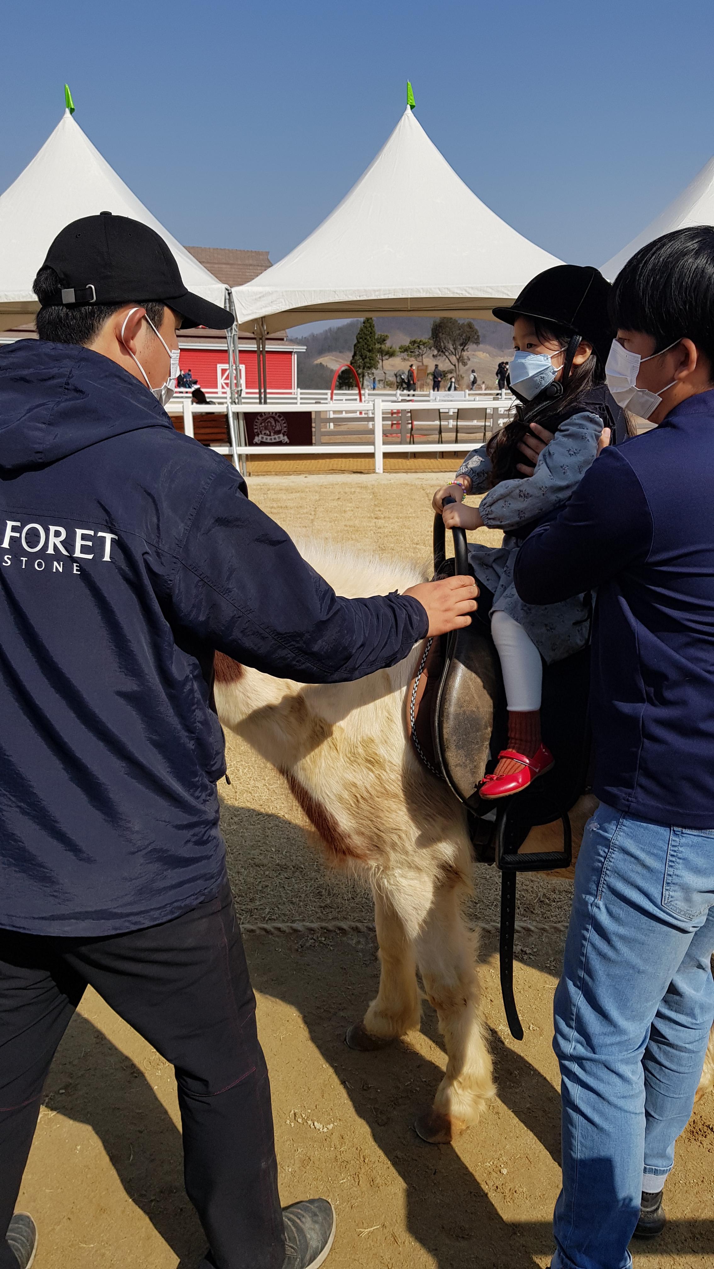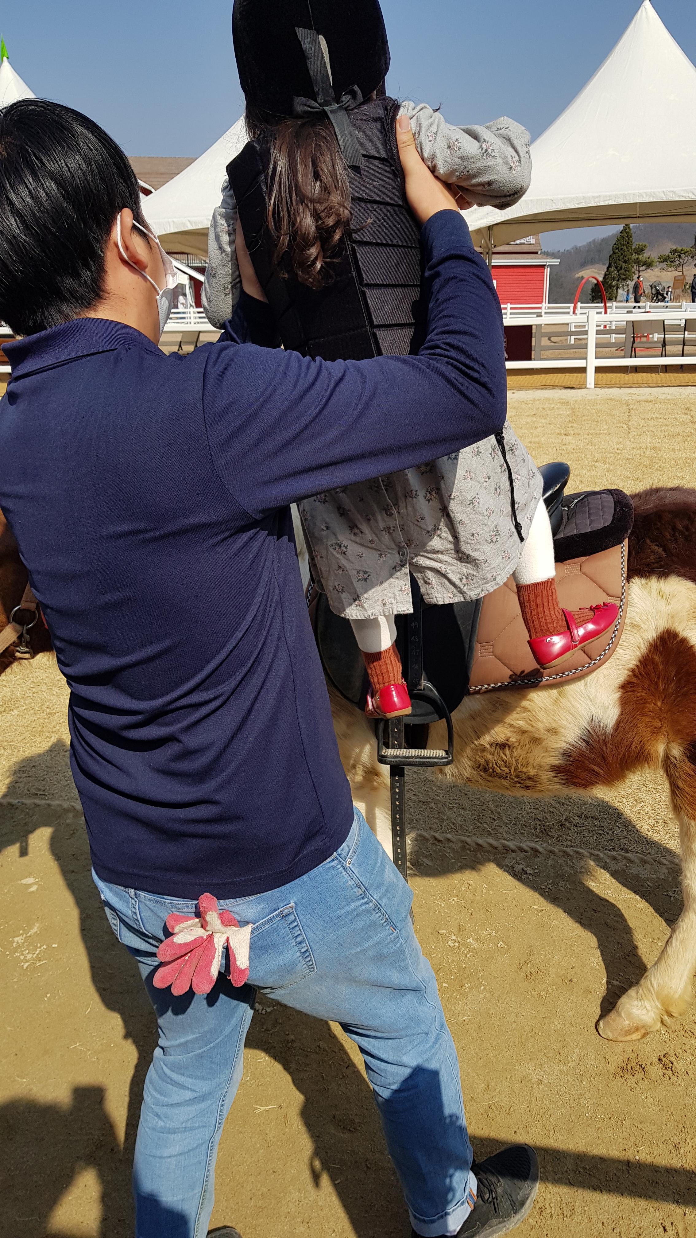 말에 탈때 직원이 안전하게 도와준다. 조금 큰 아이들은 계단을 이용해 말에 타고 딸아이처럼 어린아이는 안아올려서 태워준다.