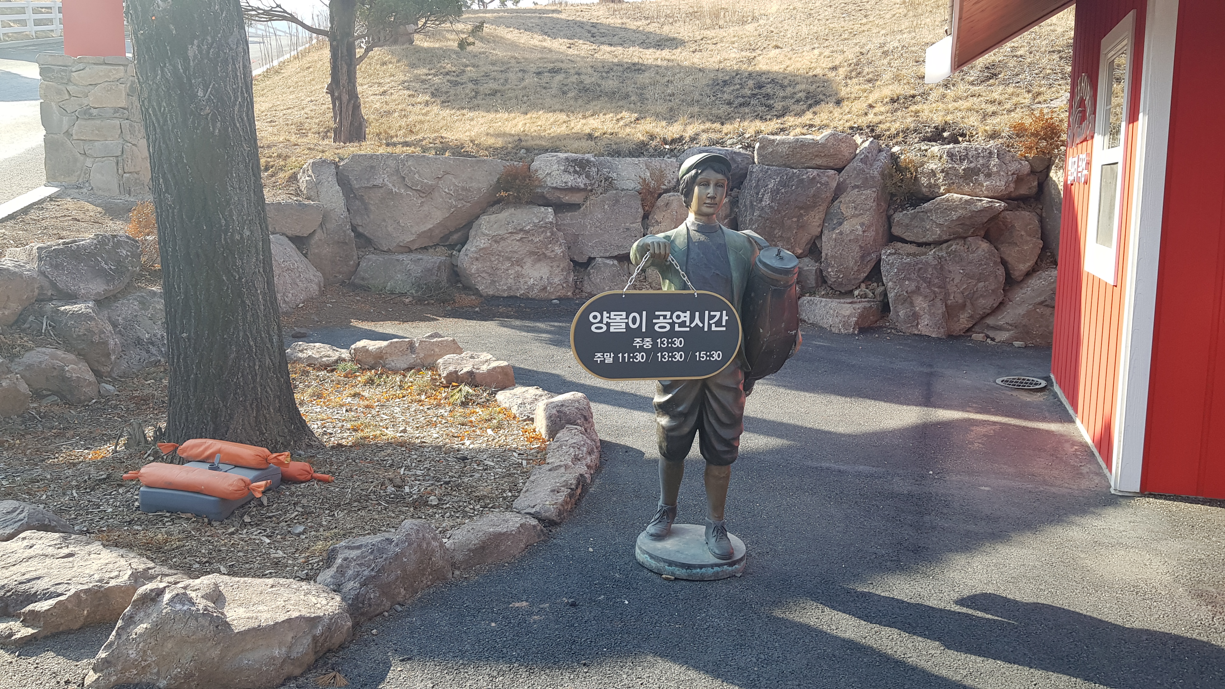 티켓 오피스 옆에 목동이 양몰이 공연시간 안내표를 들고 있다.