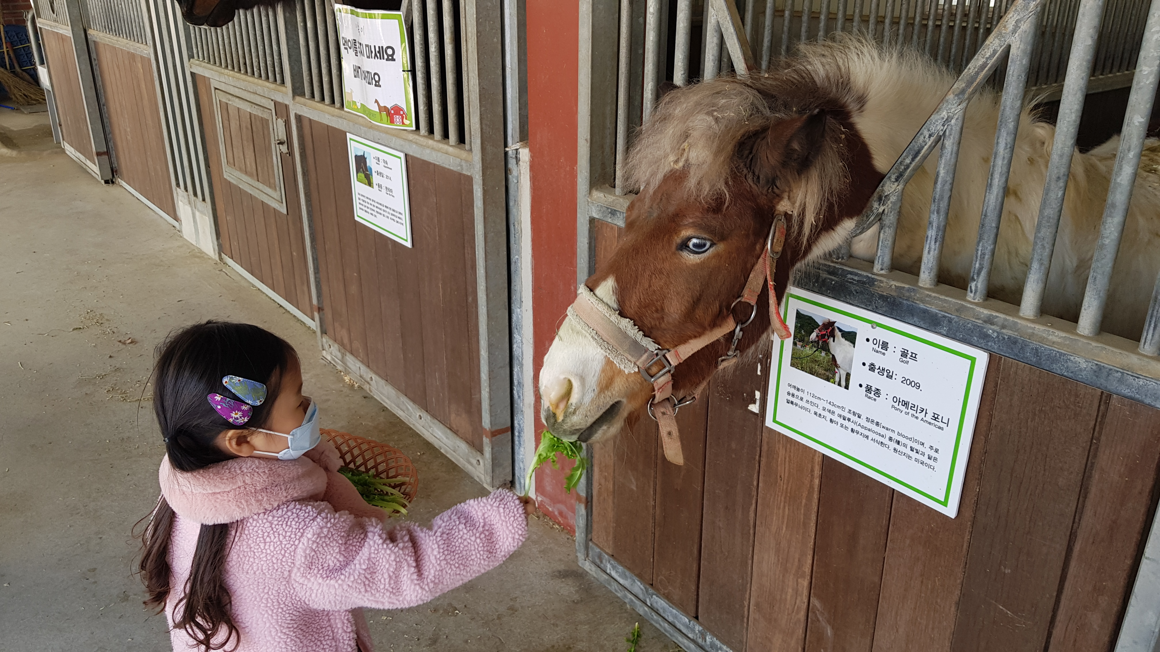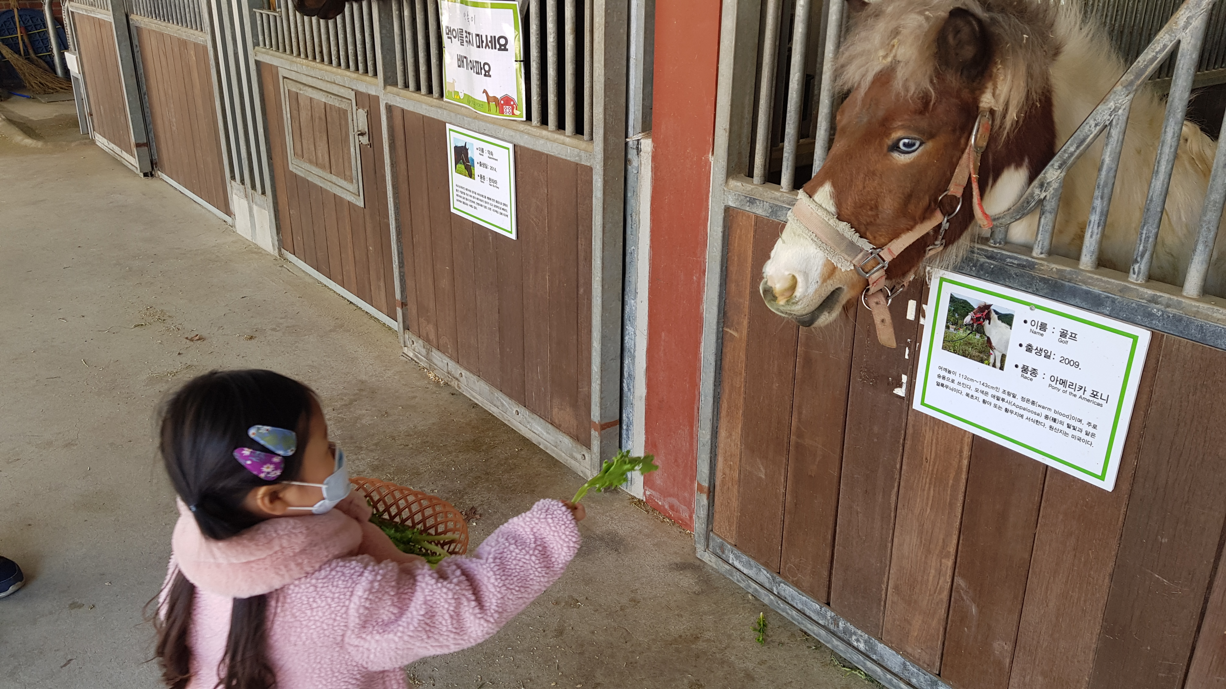 먹이 바구니를 들고 가까이 가면 말이 얼굴을 내밀고 먹이를 받아 먹는다. 이 말들 중에 나중에 승마(말타기) 체험을 할때 타는 말이 있으니 먹이를 든든히 주자.