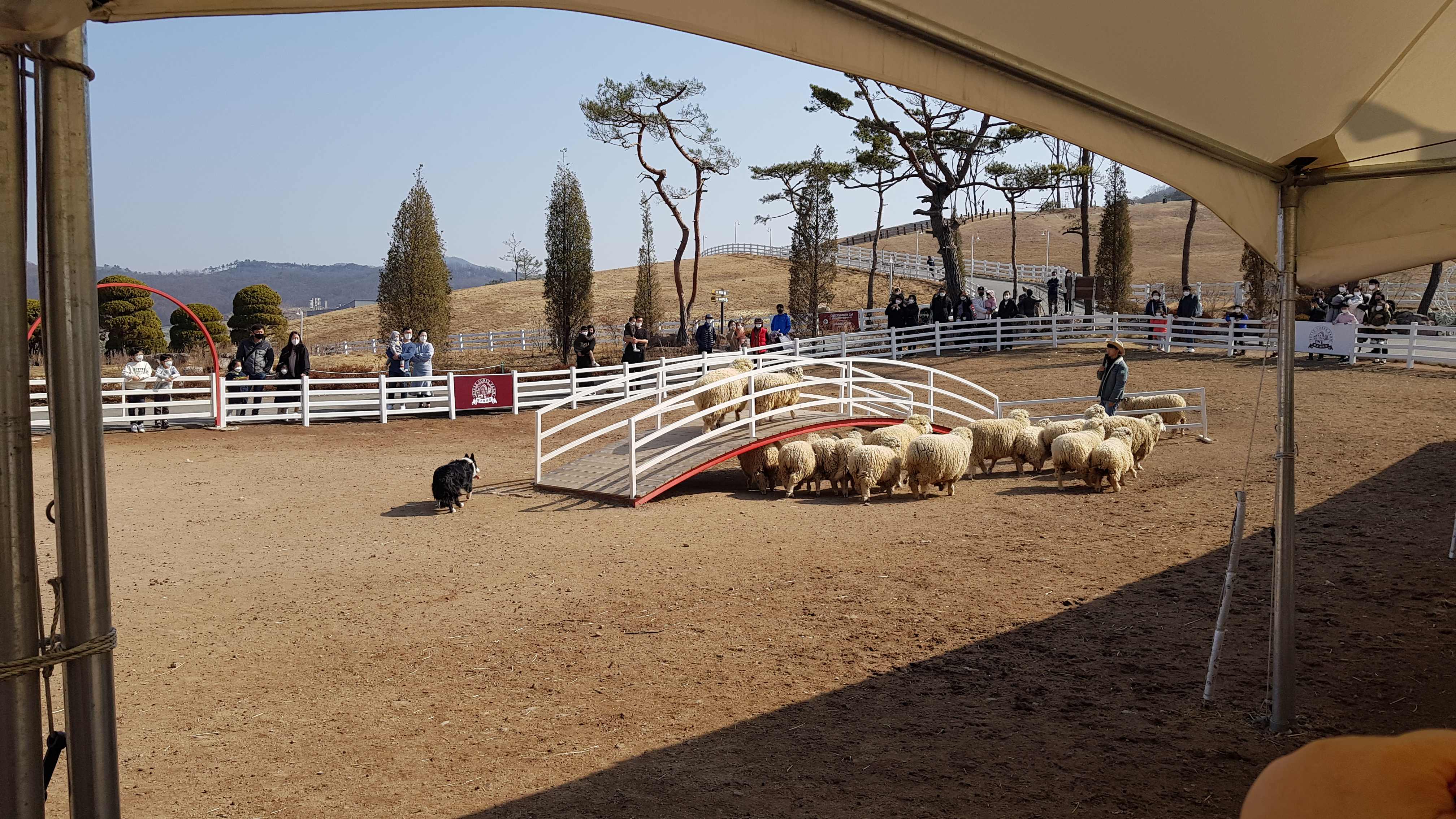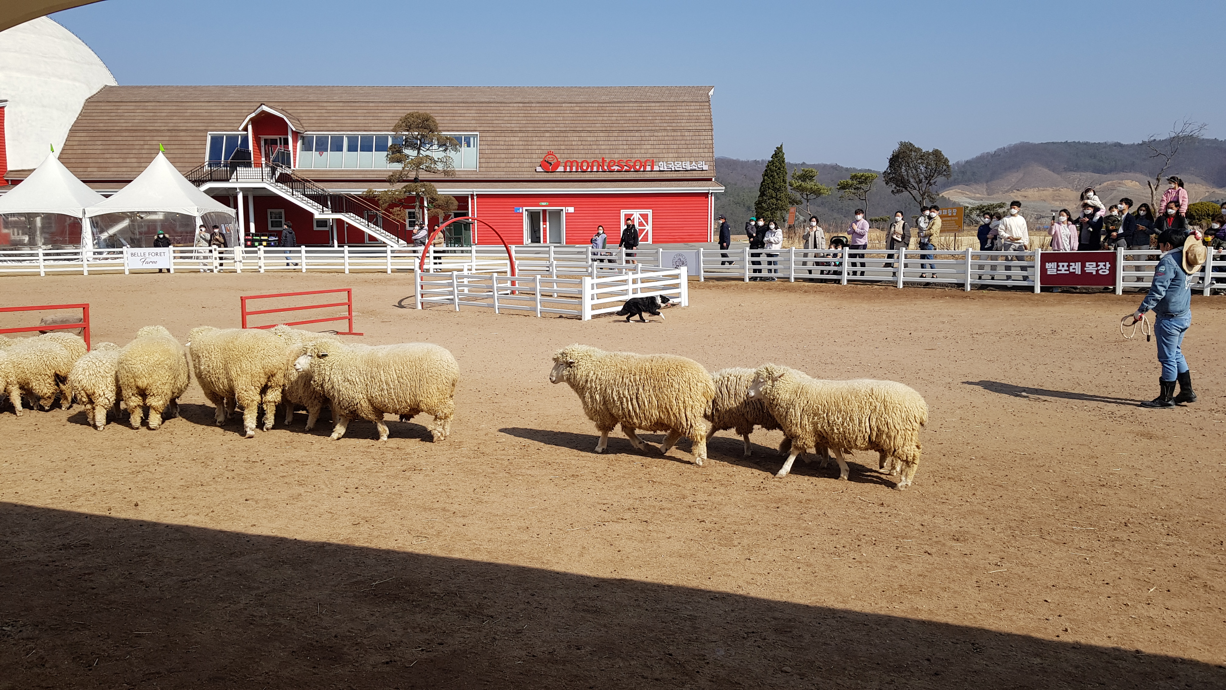 공연이 시작되면 카우보이 복장을 한 2명의 직원과 양몰이 보더콜리, 그리고 주인공 양떼가 등장한다.