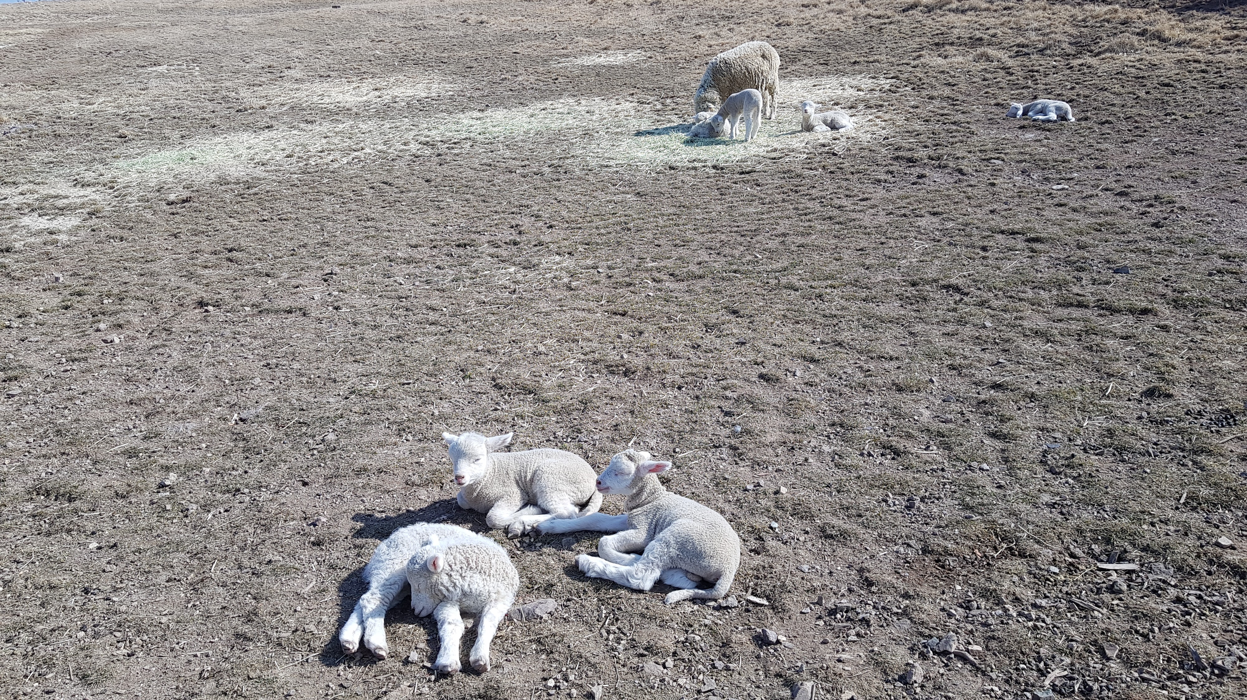 목장에서 내려오는 길에 아기양들이 풀밭에 누워서 낮잠 자고 있다.