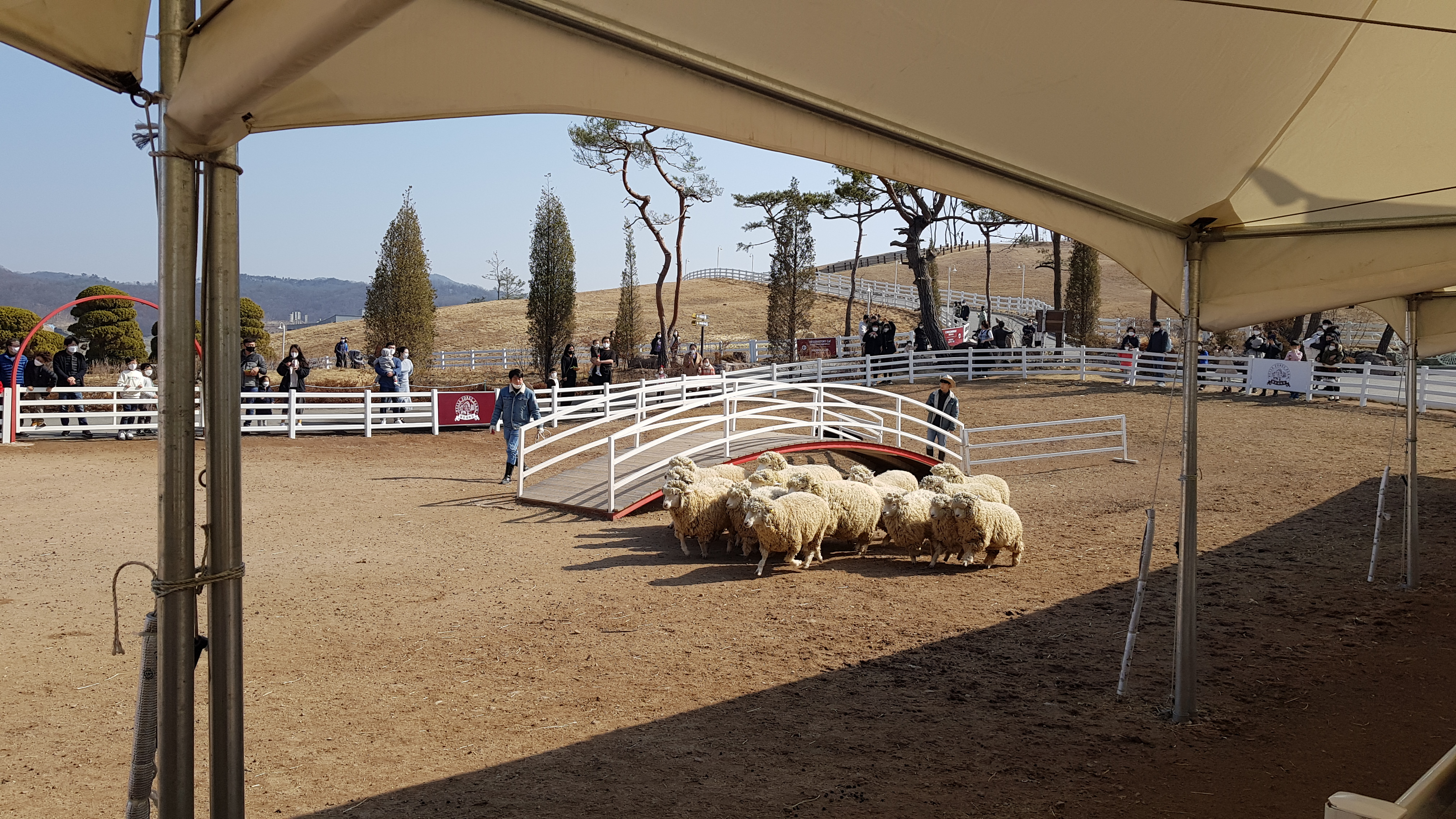 공연 준비를 위해 양들을 몰고 언덕위 다른 목장으로 가는 모습. 검은 못을 입은 직원분이 바구니에 사료인지 구슬같은걸로 소리를 내니 양들이 사람에게 몰려오고 저렇게 몰려 가는 모습이 신기하다.