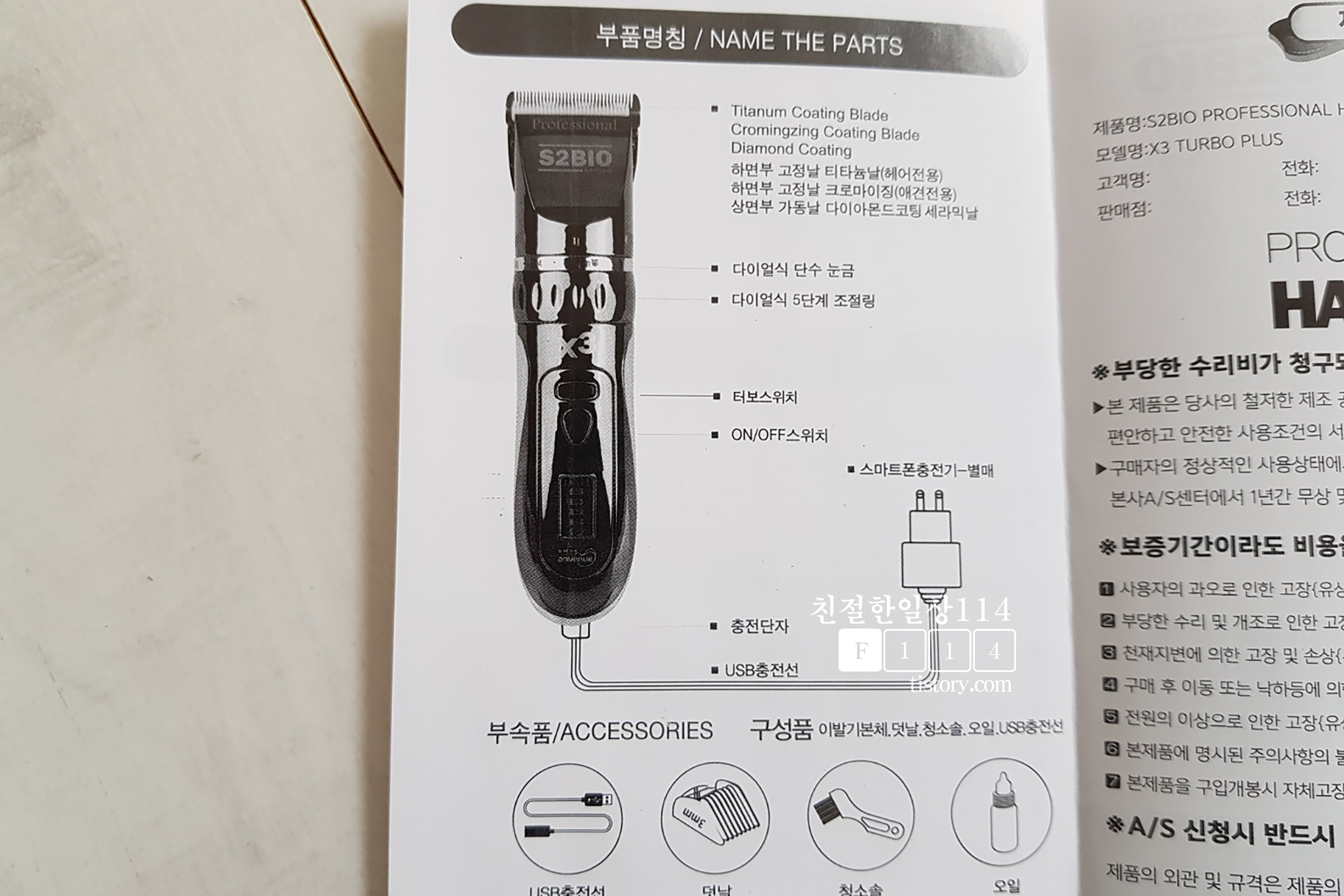 구성품: 본체이발기/밧데리/오일/빗솔/충전연결선/덧날 4개(3,6,9,12mm)