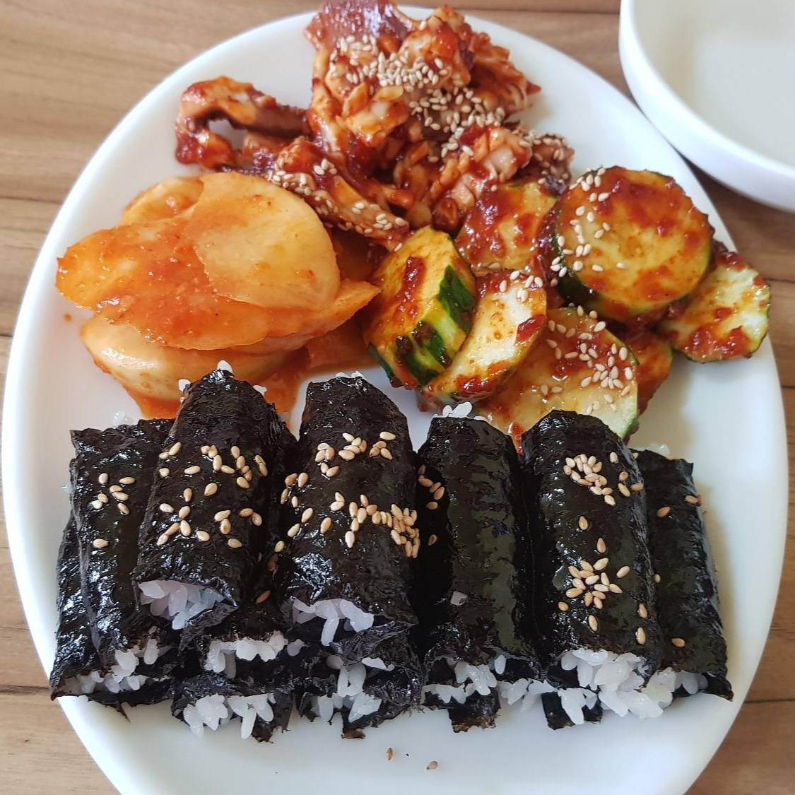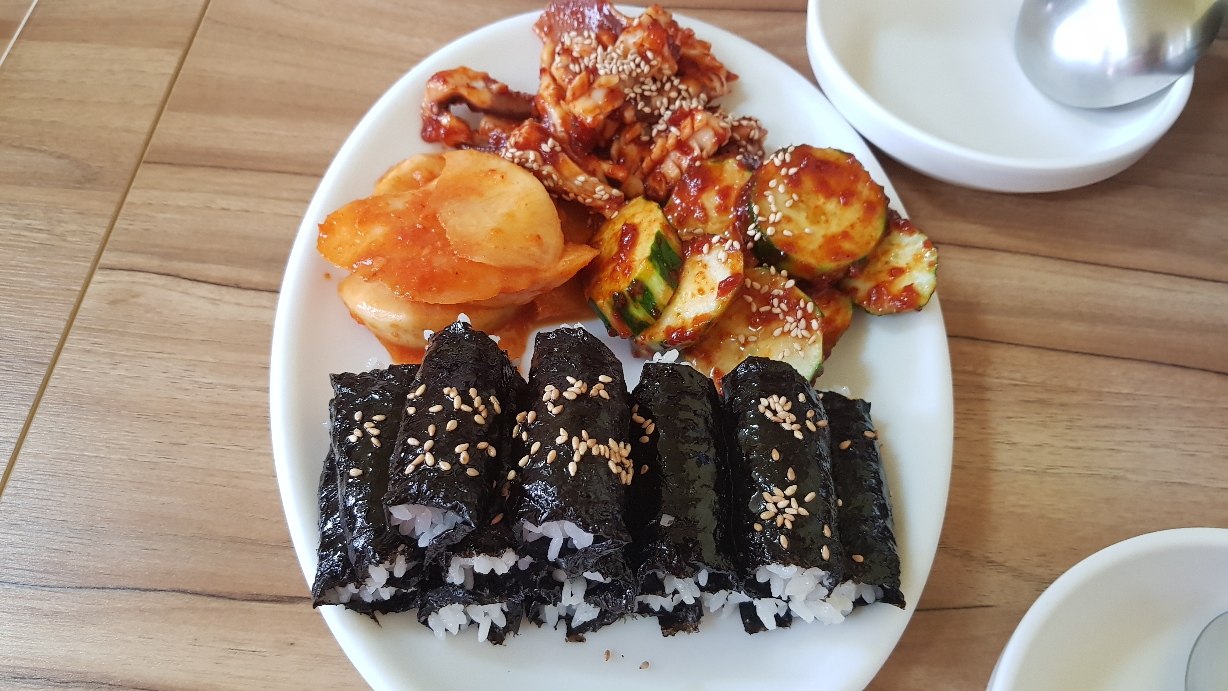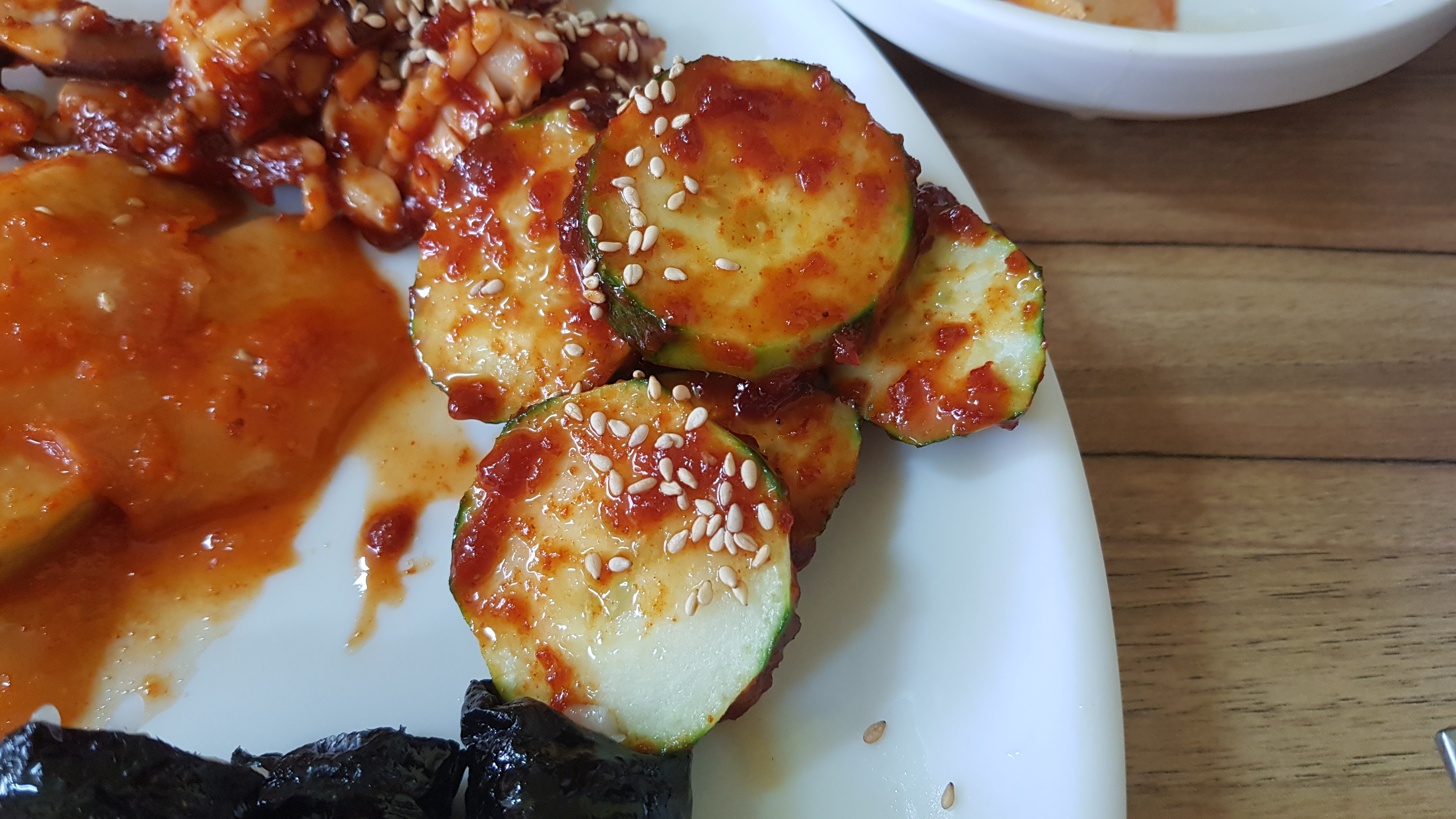 충무김밥, 김밥과 석박지, 오징어무침, 오이무침이 같이 나온다.
