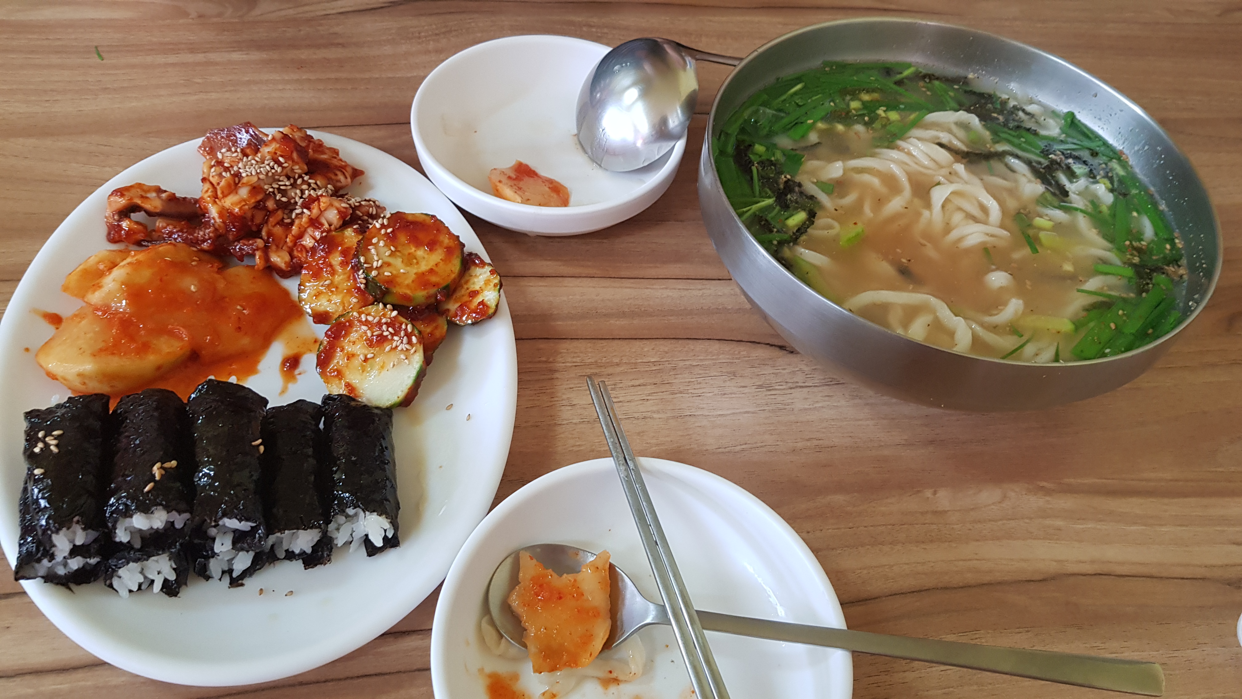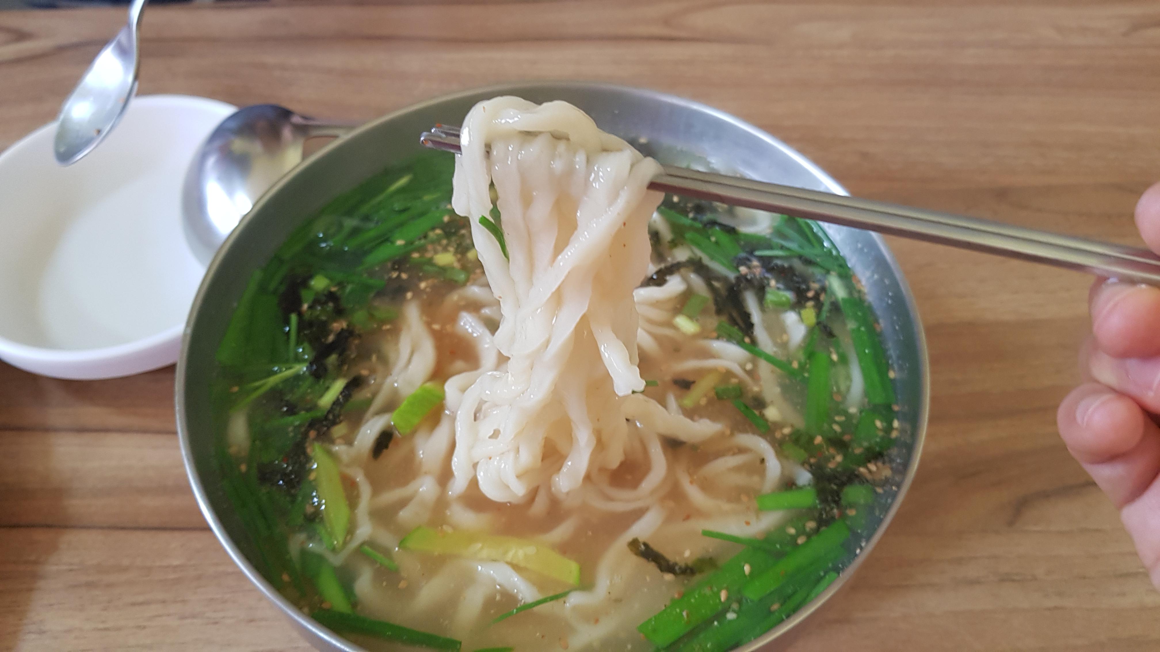 우리가 식당에 들어갔을때 다른 손님이 없었다. 앞선 손님이 없었고 첫 주문인데도 음식 나오는 시간은 조금 걸린다. 주문을 하면 사장님이 만든 수타면을 끓여서 내오기 때문이니 이해하고 기다린다. 음식을 기다리며 앉아 있으니 손님들이 하나둘 들어오고 의자가 있는 네개의 테이블이 만석이 됐다. 안쪽으로도 손님이 들어갔다. 가장 바쁜 점심시간, 테이블은 모두 찼지만 손님이고 사장님이고 서두르거나 다급해보이지 않는다. 그리고 주문한 충무김밥과 칼국수가 나왔다.