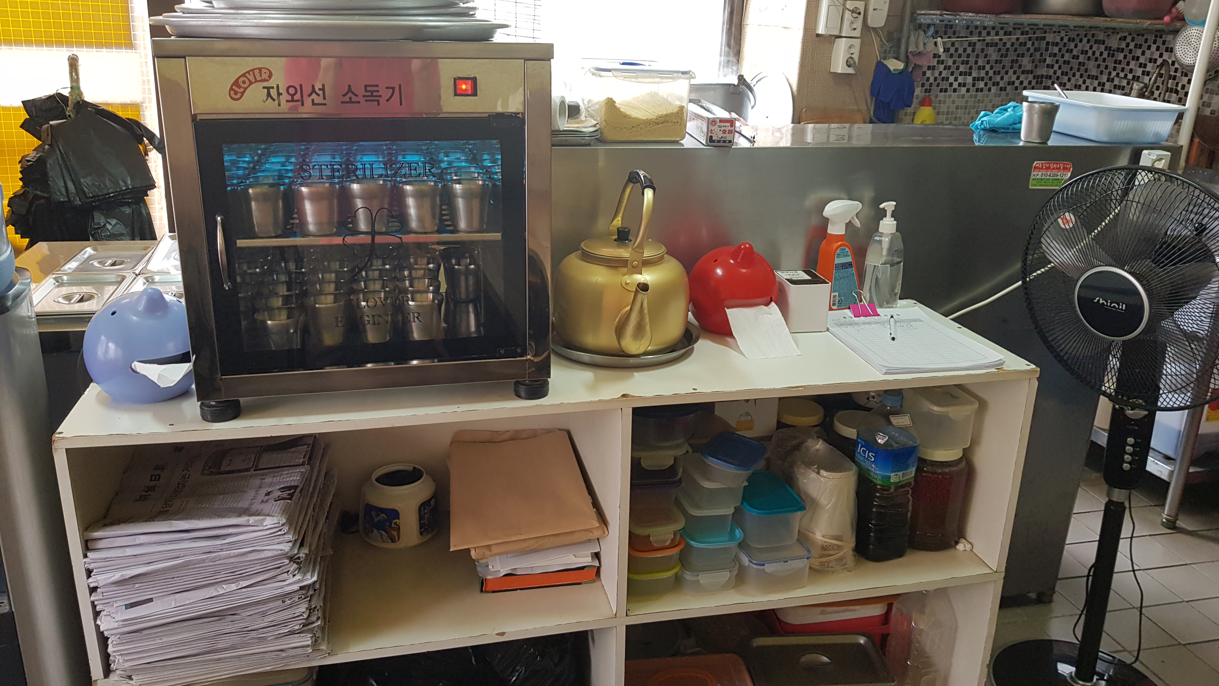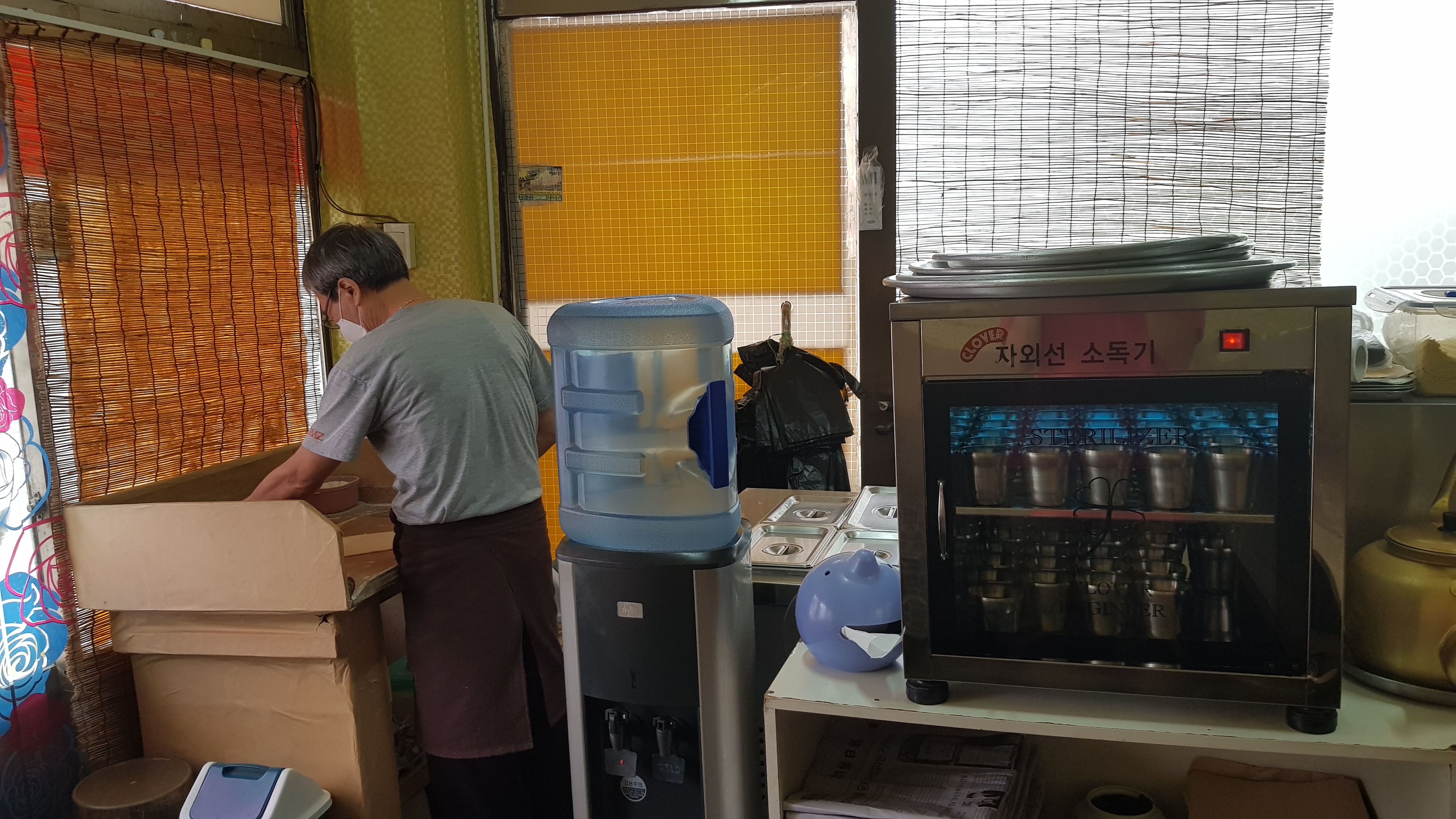 물은 셀프이다. 컵을 중앙으로 좌측에는 정수기물 오른쪽 주전자에 보리차를 선택해서 마실 수 있다.