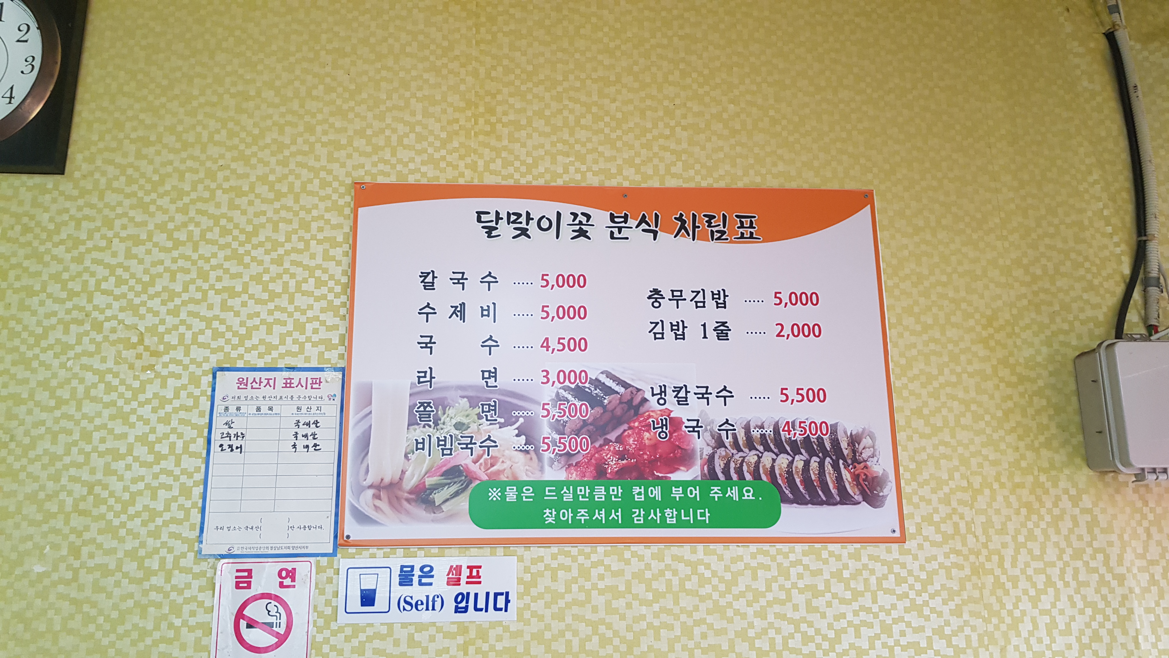 음식가격이 착하다. 이것도 물가 때문에 500원 1000원씩 올린 금액이라고 한다. 우리가 식당에 들어가 주문할 때 사장님께서 면을 밀다가 김밥을 검은 봉지에 싸들고 거스름돈을 준비해 배달을 나가셨다. 신평시장내에는 배달이 되는가 보다. 다음에 통도사에 단풍놀이 갈 때는 달맞이 분식에 들려서 충무김밥을 포장해 가야겠고 생각했다.