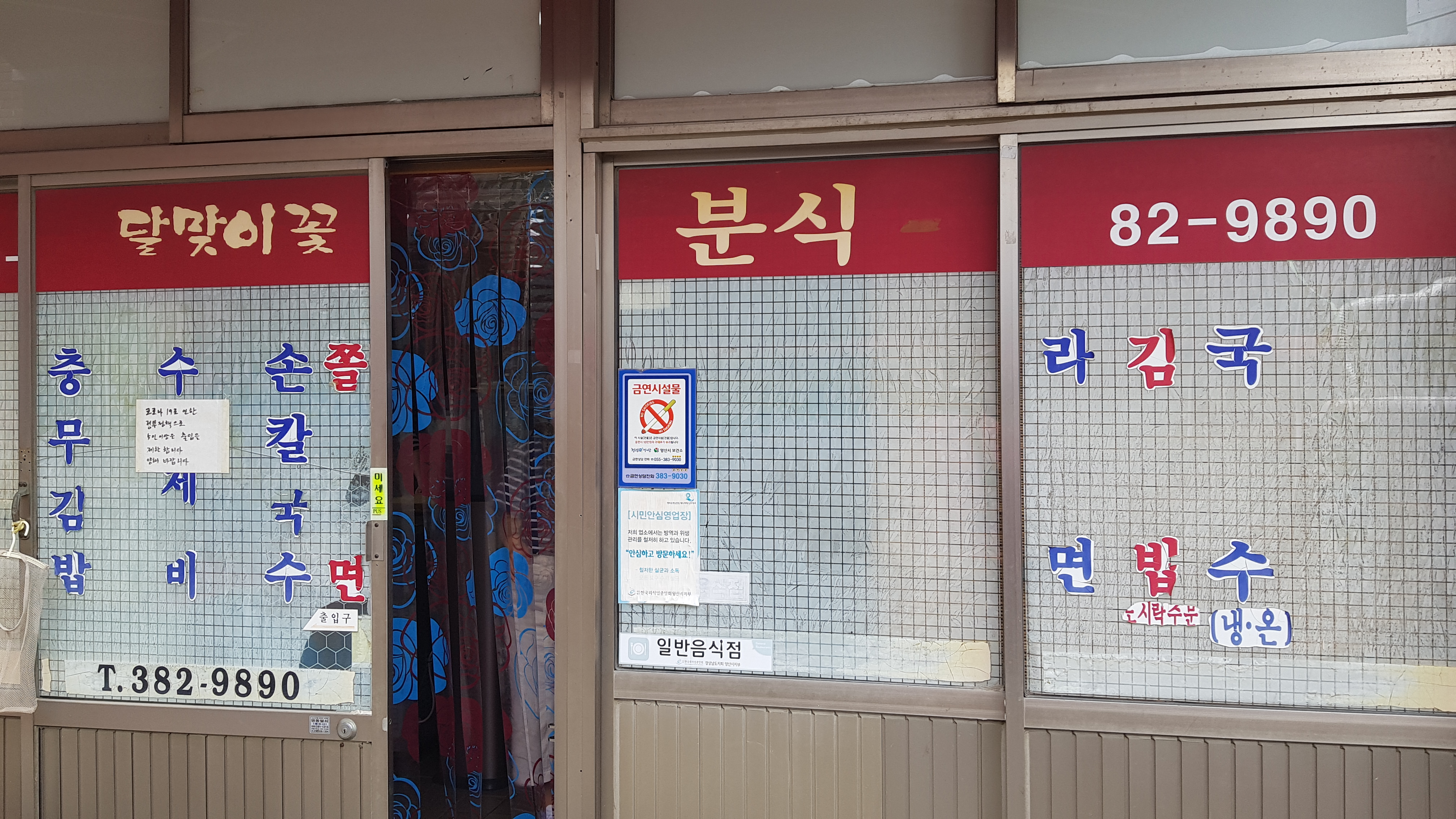 골목에 주차를하고 식당쪽으로 걸어갔다. 간판이 없어서 두리번 거렸지만 이내 찾을 수 있었다. 간판은 없지만 미닫이 문에 달맞이꽃 분식이라고 이름이 써져있다. 그리고 보기좋게 메뉴도 써져있다.