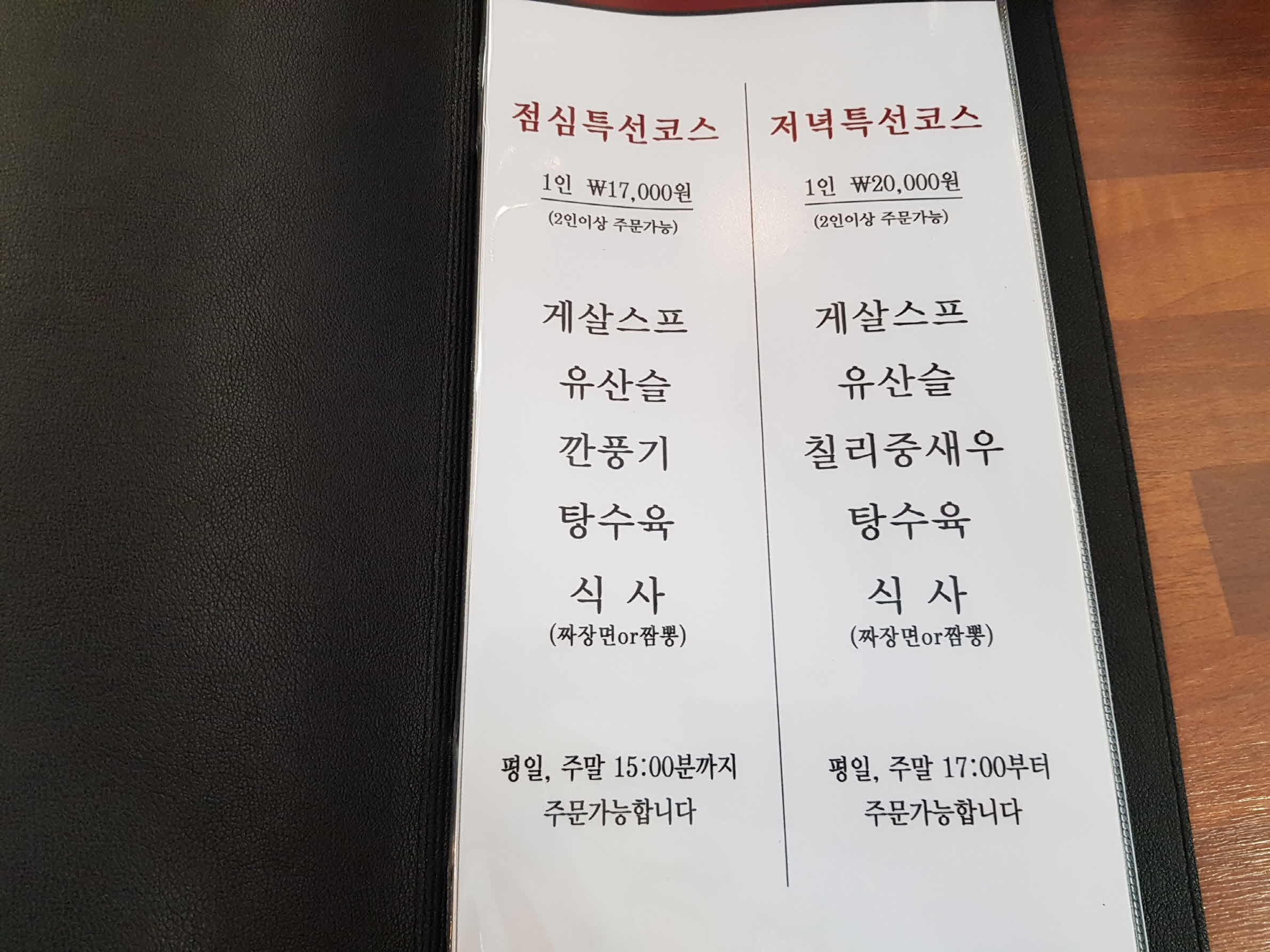 저녁 특선(20,000원)은 17부터 주문 가능.