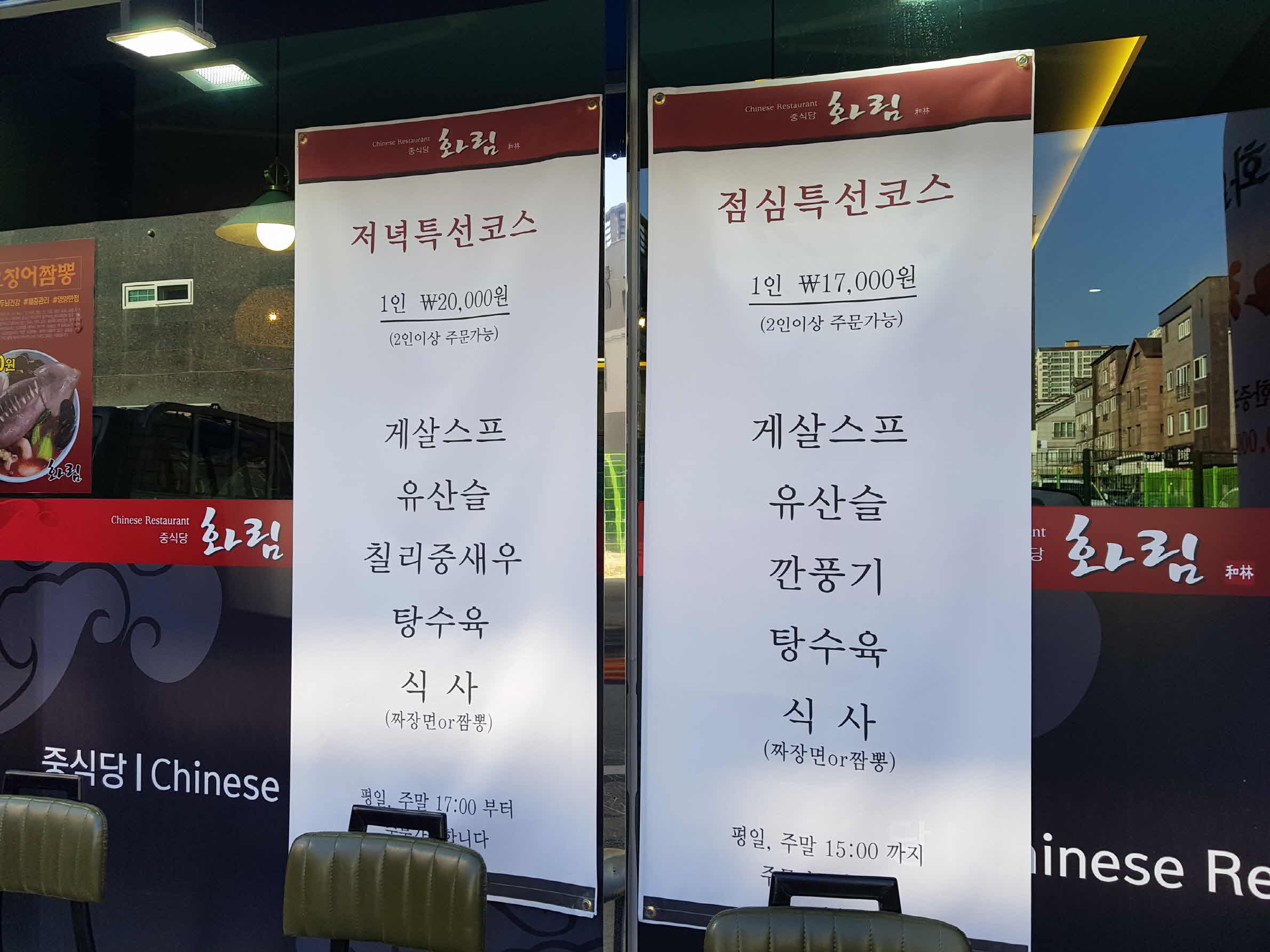 점심 특선 코스와 저녁 특선 코스 메뉴 안내표가 붙어있다.