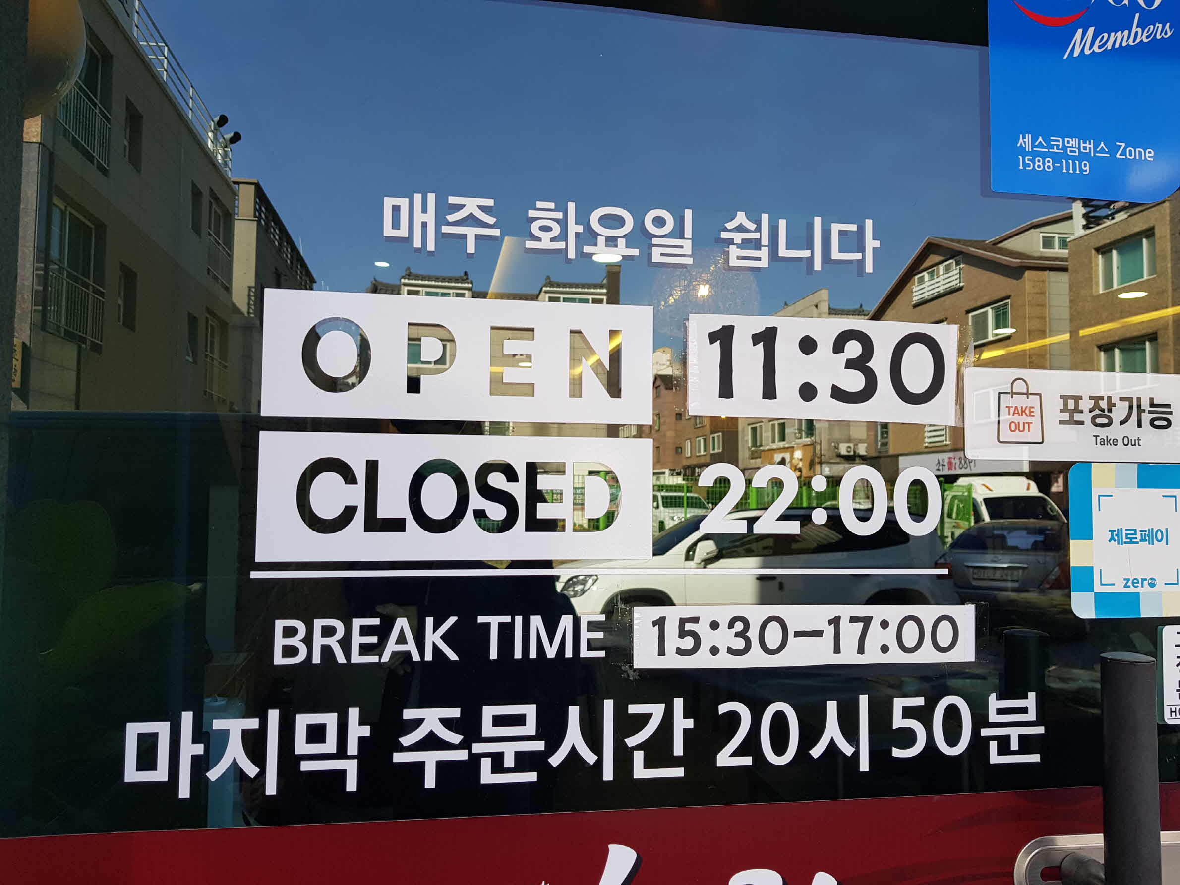 출입문에는 영업시간과 화요일 휴무라는 안내가 쓰여있다.