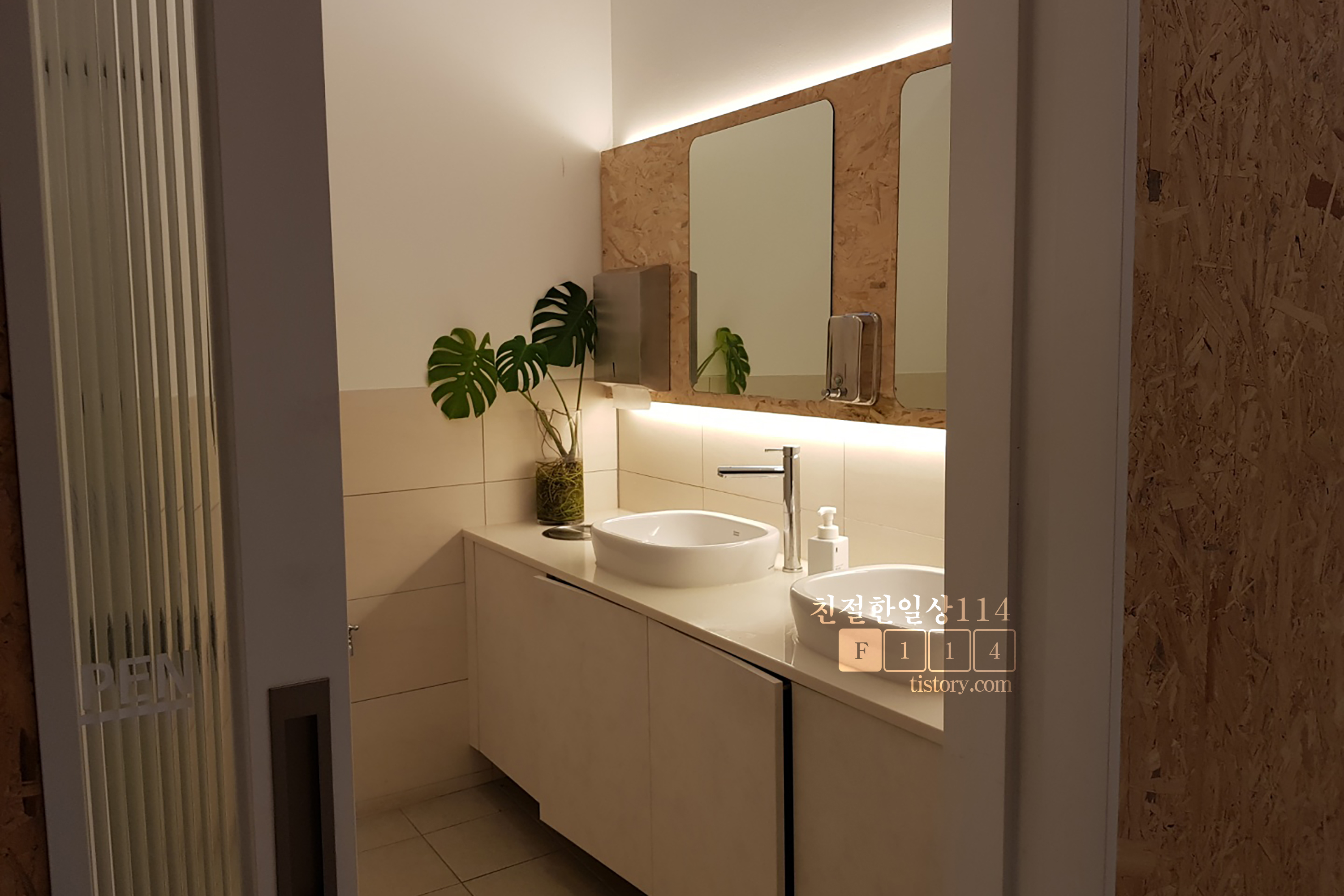 화장실 문이 열려있어서 한컷. 화장실 내부도 상당히 깔끔하며 따뜻한 느낌의 분위기가 감돈다.
