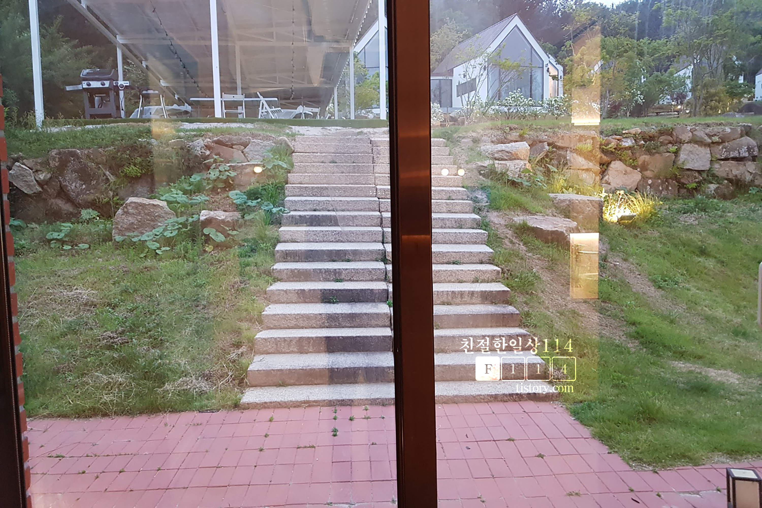 식당건물 화장실쪽에 있는 후문에서 창을 통해 바깥을 보면 토곡스테이가 보인다.