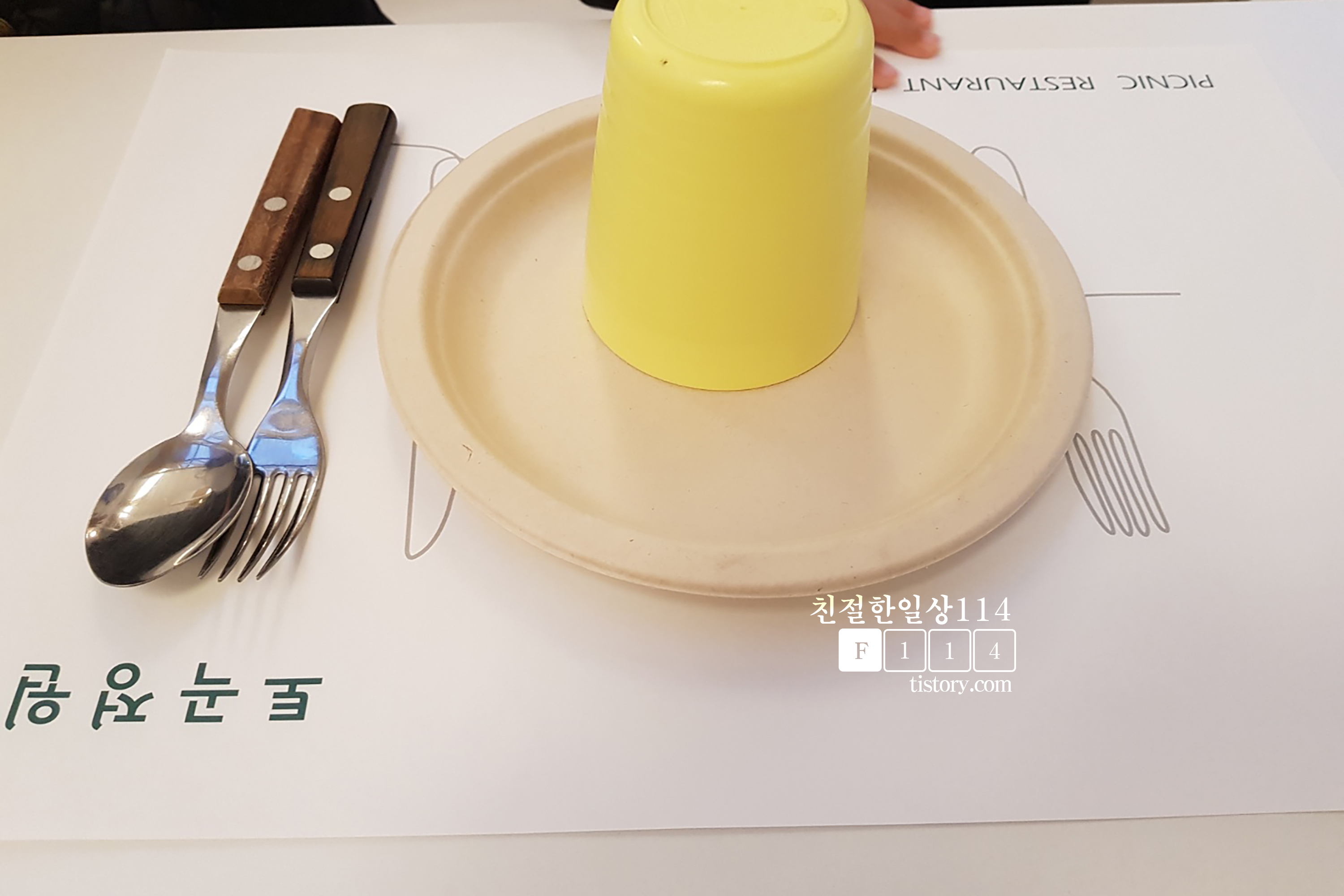 어린이가 있는 경우 어린이 의자와 어린이용 식사 사용여부를 직원분이 물어본다. 지난번에는 어른것을 썼었는데 이번에는 어린이용 식기를 사용해본다. 접시는 종이로된 일회용으로 나오며 포크와 숟가락, 컵은 이케아 제품인듯 하다.