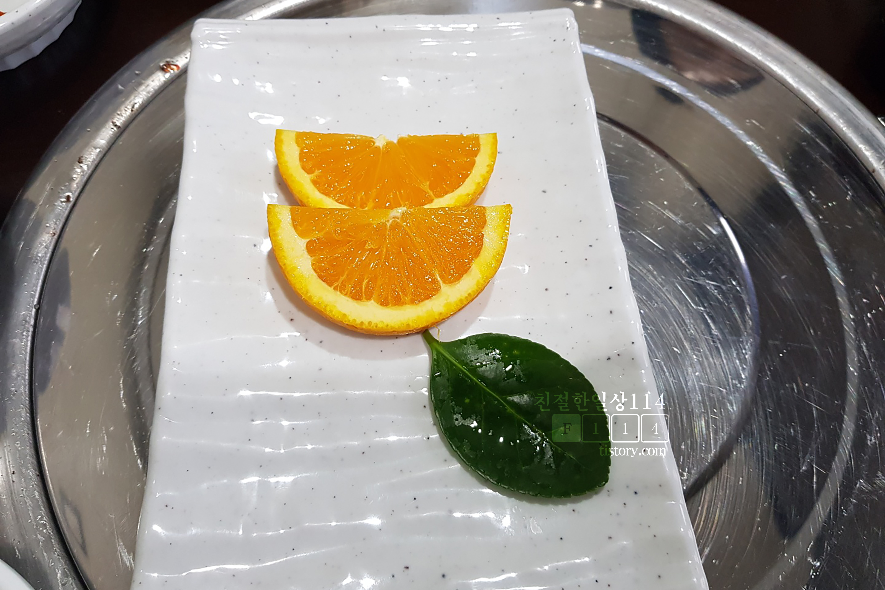 다 먹어 갈때쯤 비빔냉면을 하나 추가로 주문해서 먹고 있으니 후식으로 오렌지와 수정과를 내온다.