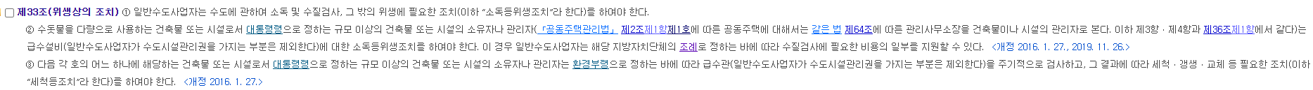 법령이 다소 길어 부분만 캡쳐해보았다. 핵심한 캡쳐한 것도 길어 짧게 요약하면 "수도사업자는 수도에 관하여 소독 및 수질검사, 그 밖의 위생에 필요한 조치를 해야한다" 이다.
