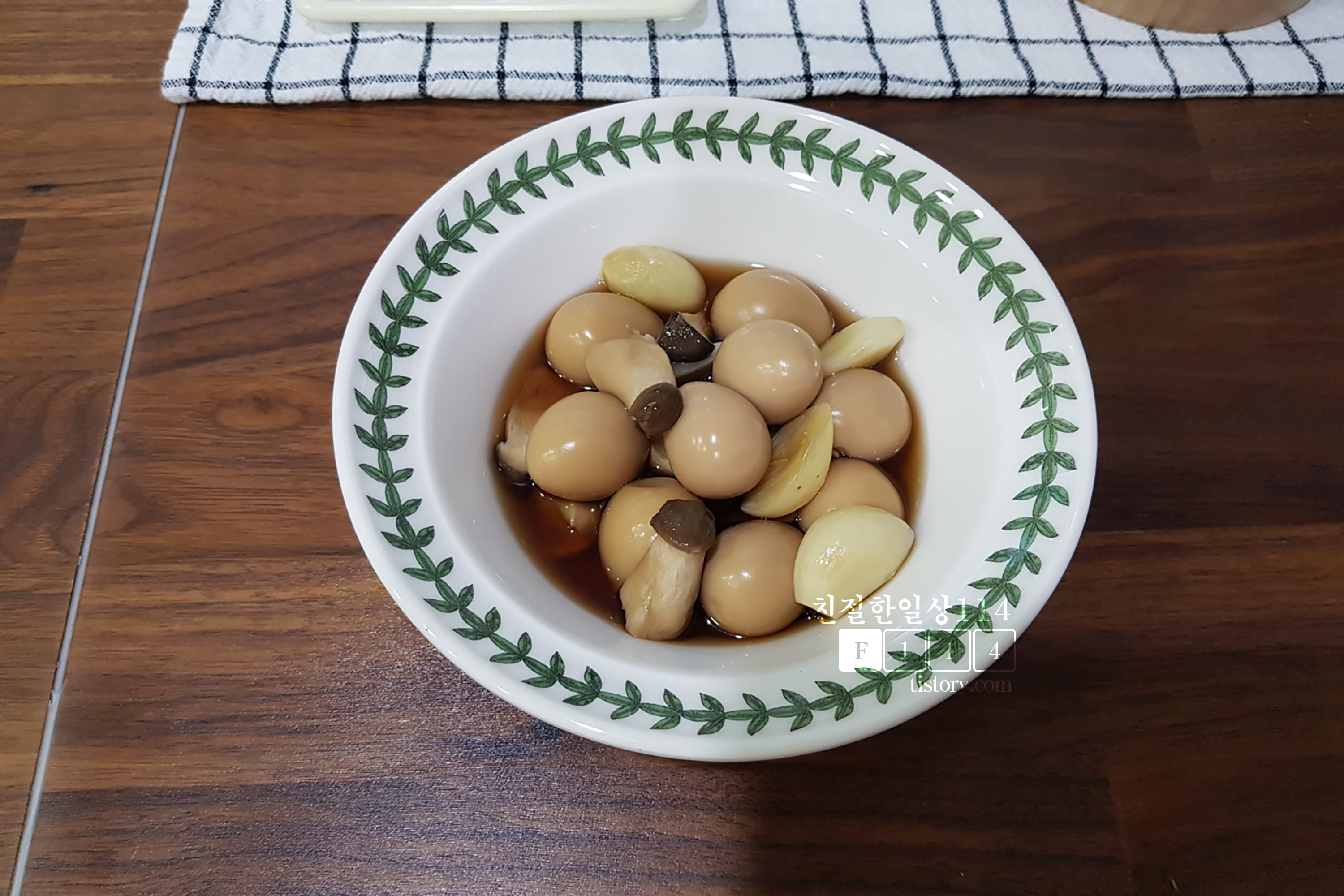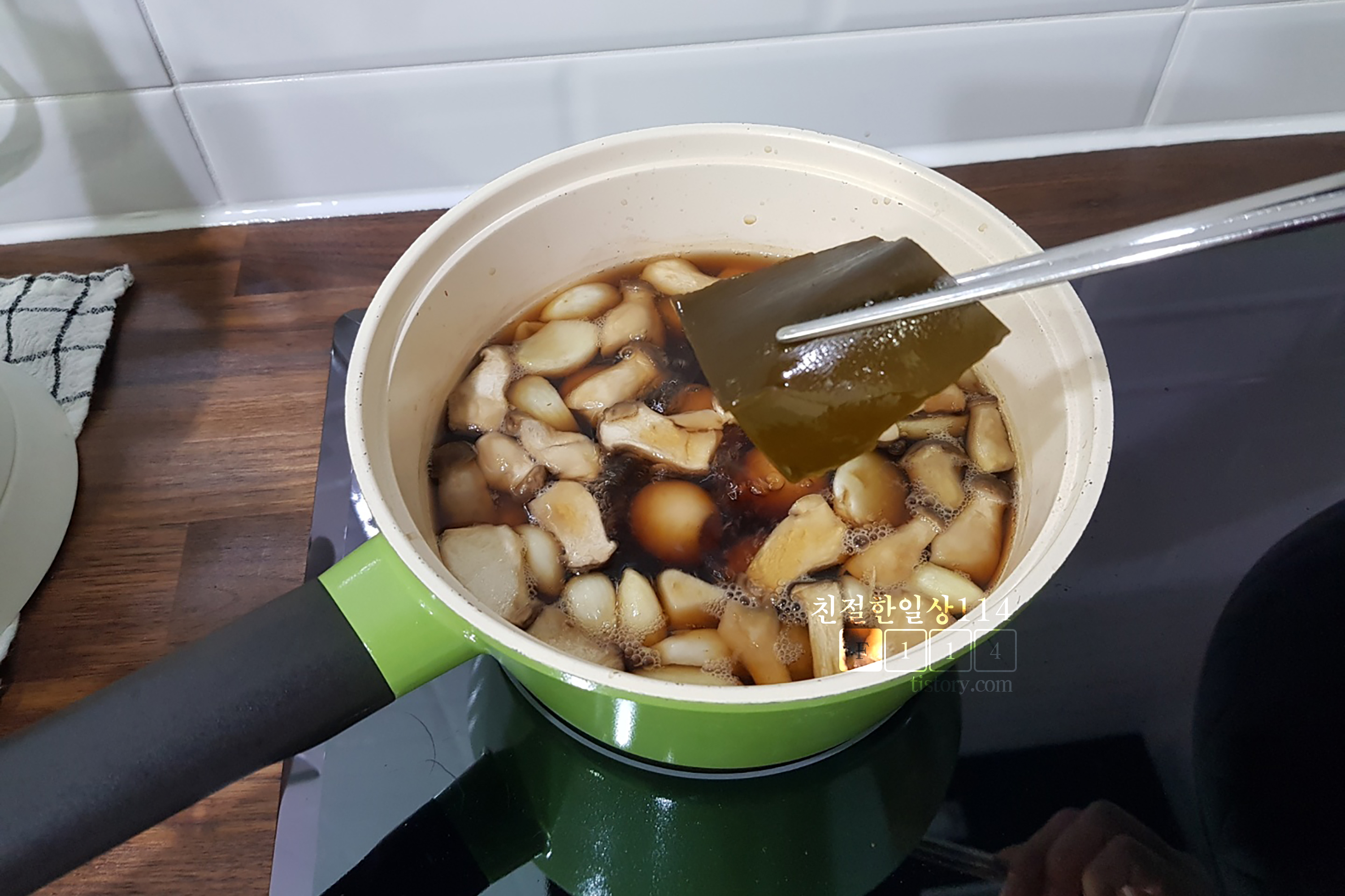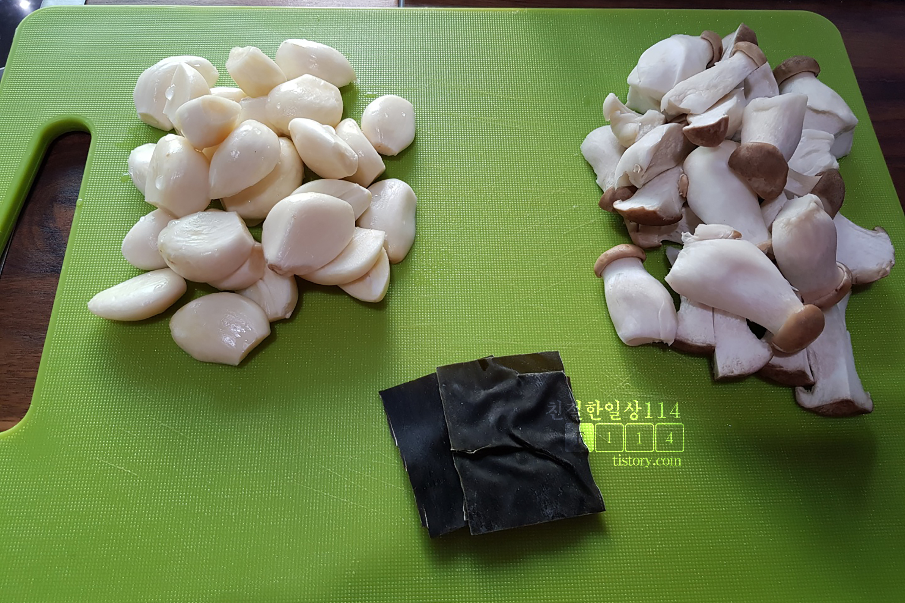 메추리알과 새송이버섯, 깐마늘, 다른다시마까지 준비가 되었다. 이제 요리를 시작해보자.