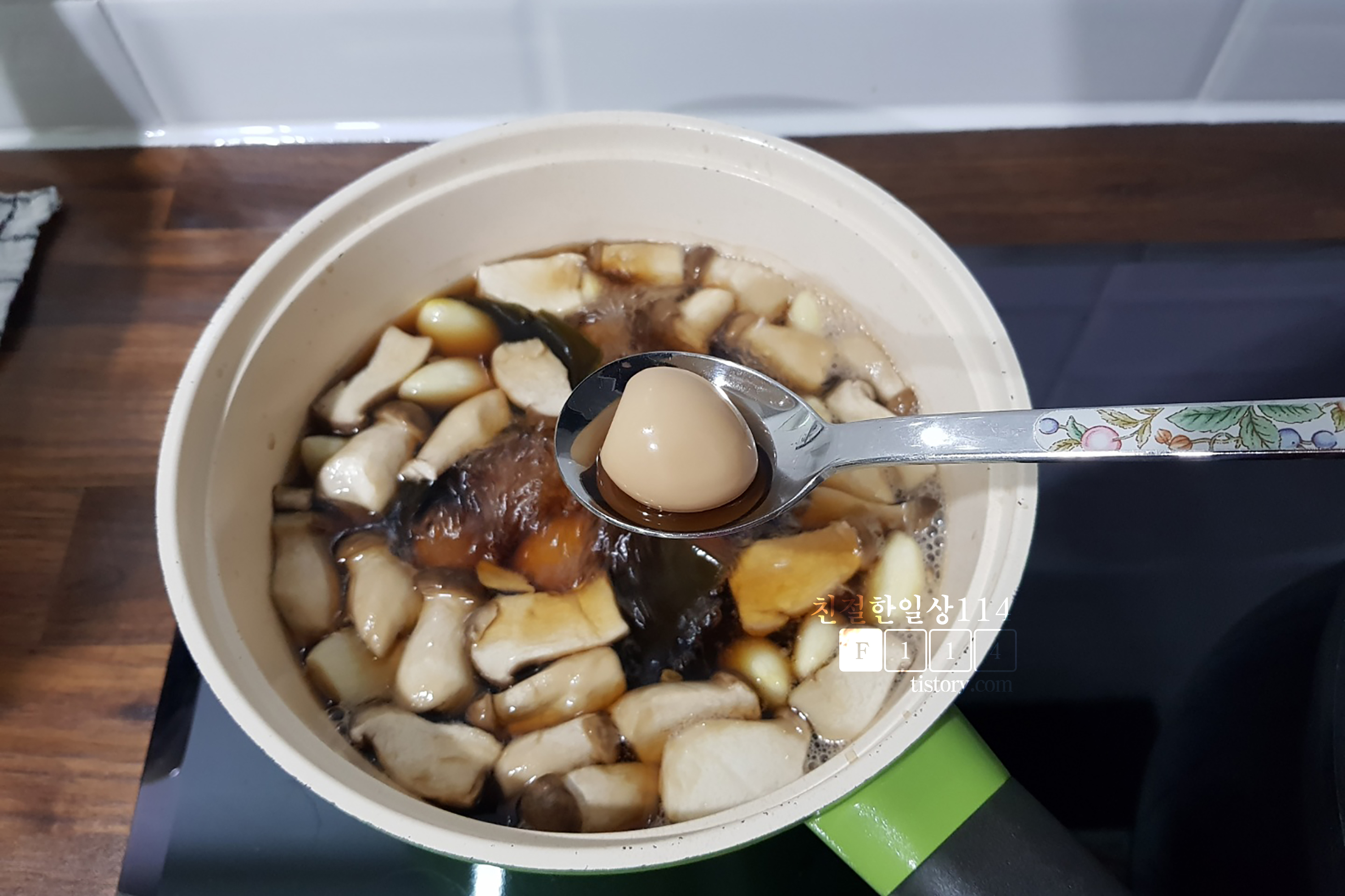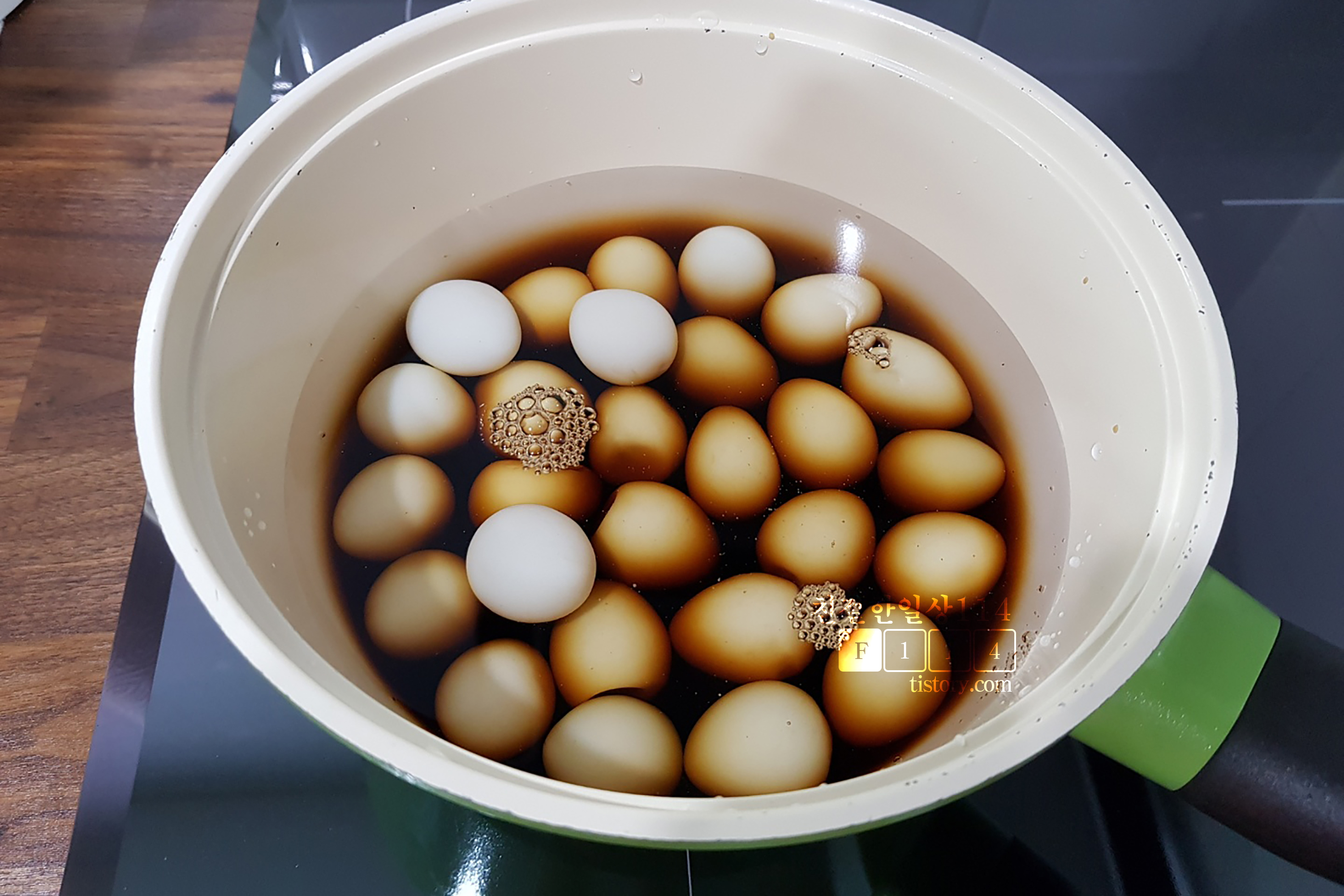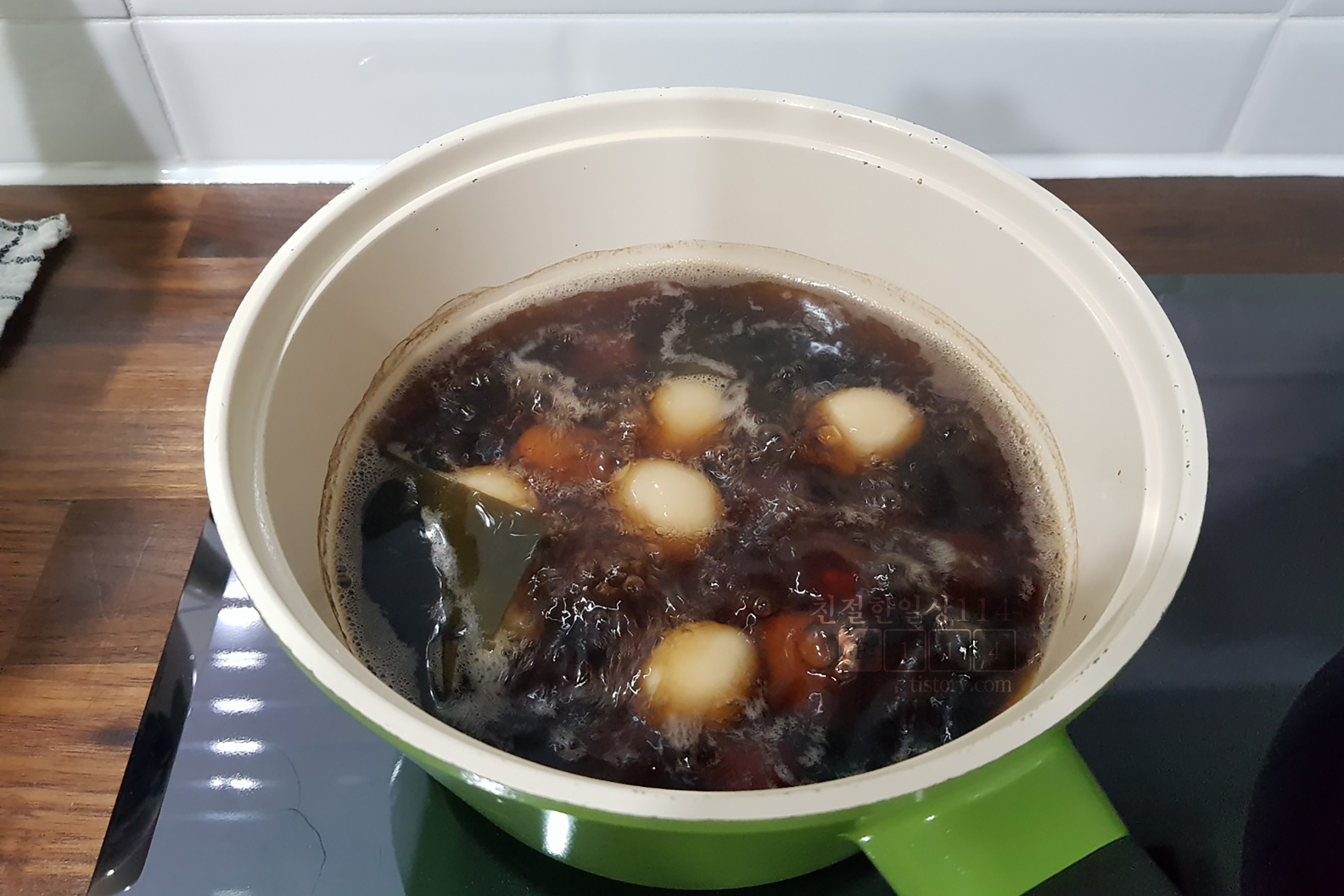 메추리알과 물을 넣고 끓기까지 10분정도가 걸리고 이후 20분간 중불로 조리면서 끓여주면 완성된다.