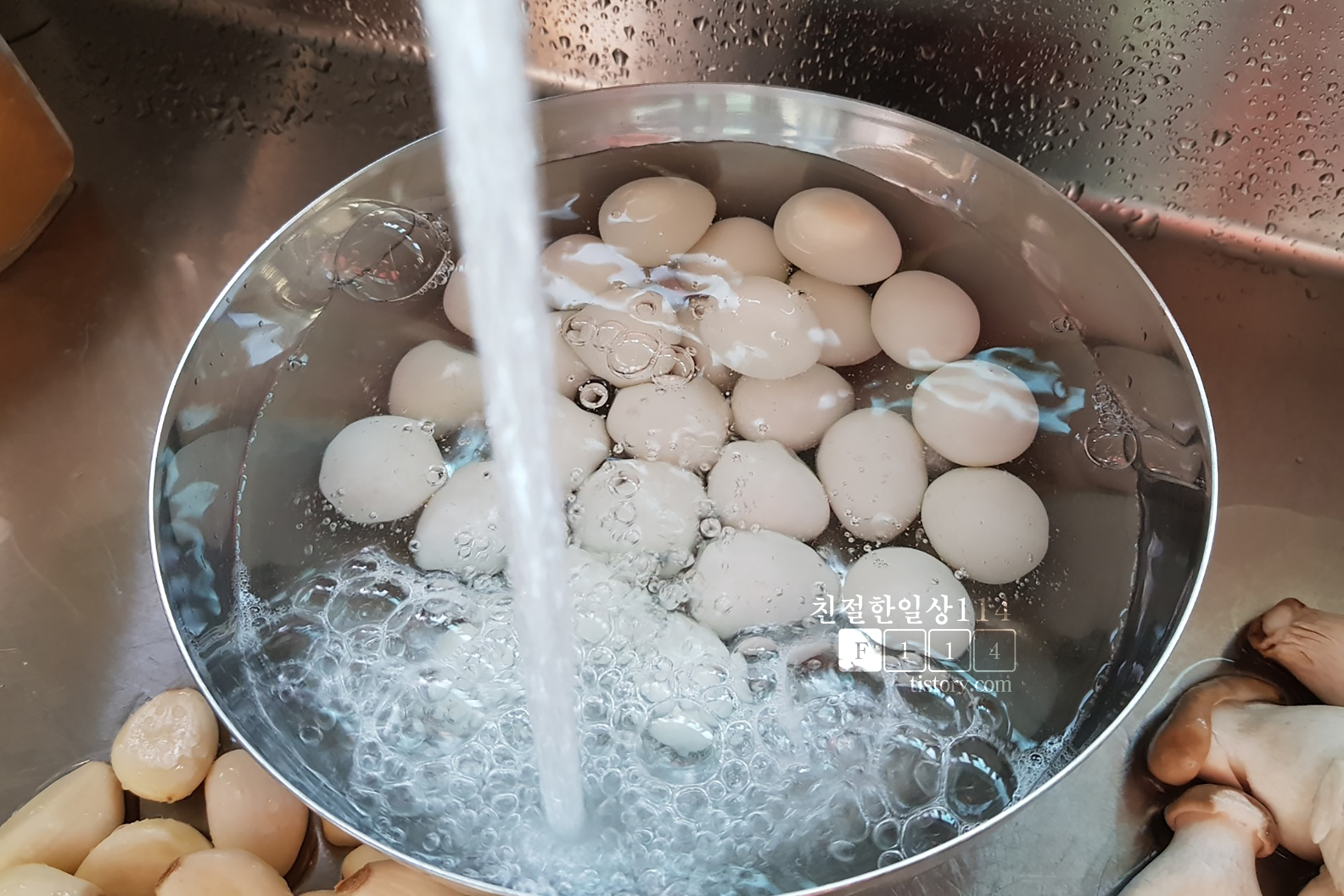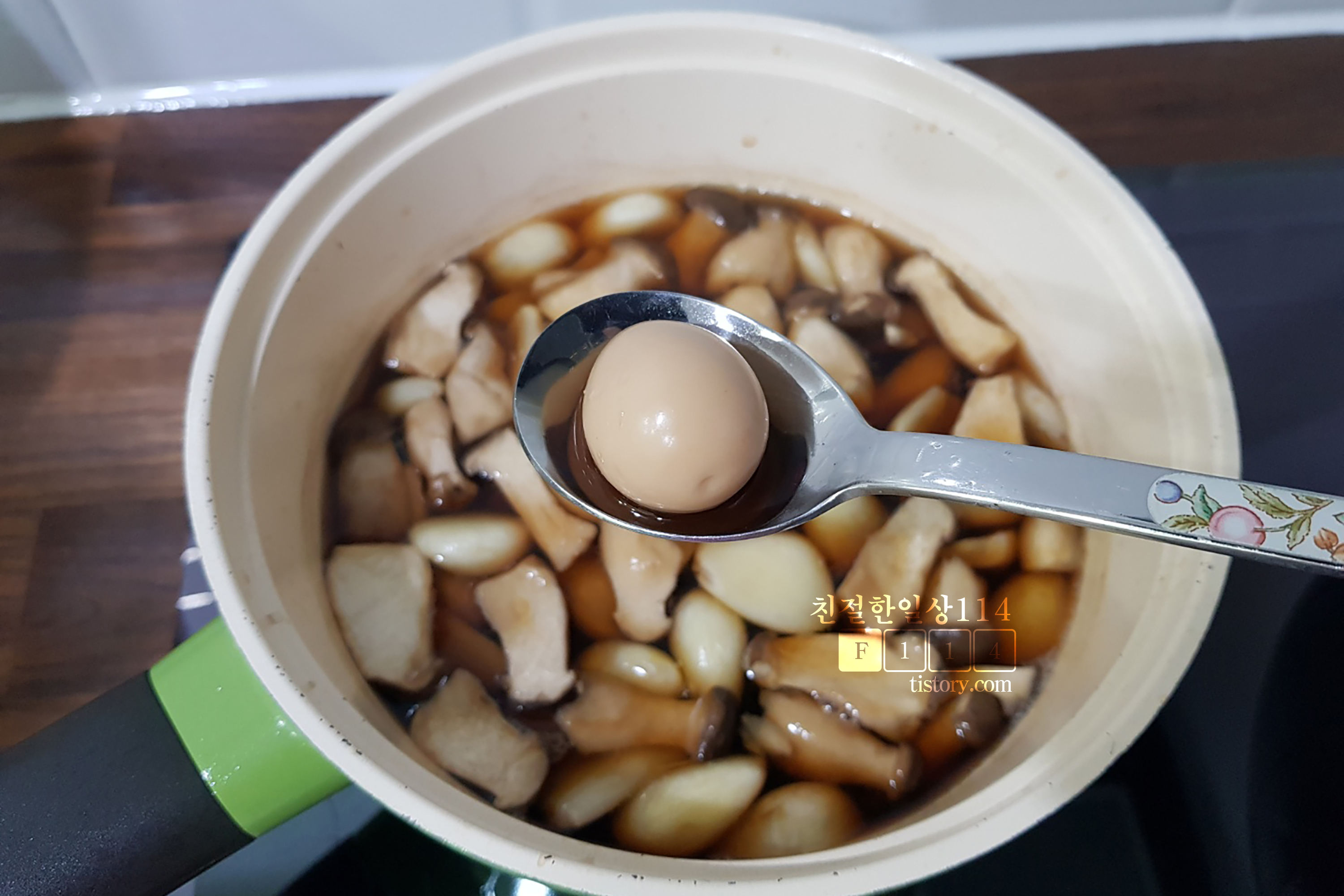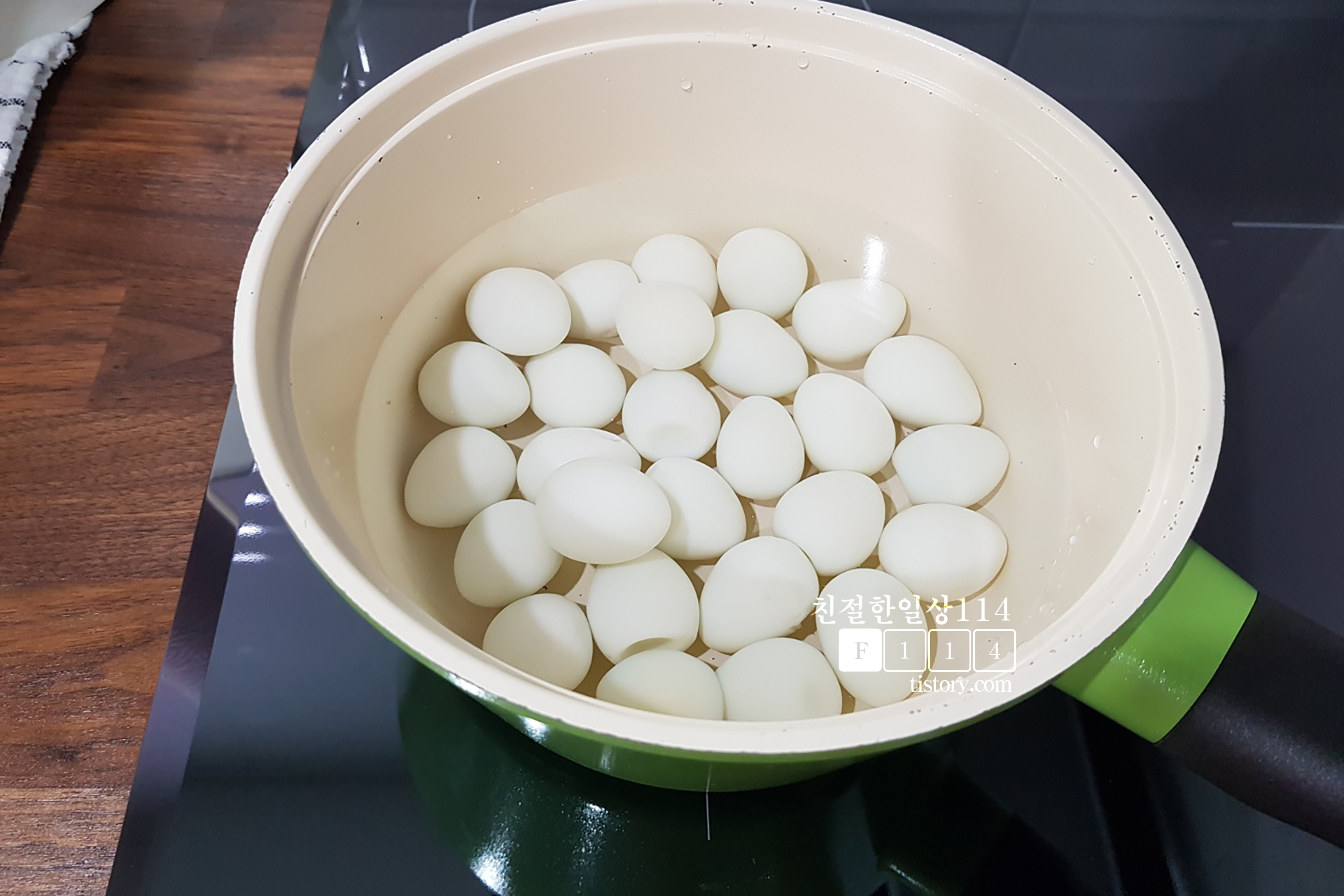 메추리알과 물을 넣고 끓기까지 10분정도가 걸리고 이후 20분간 중불로 조리면서 끓여주면 완성된다.
