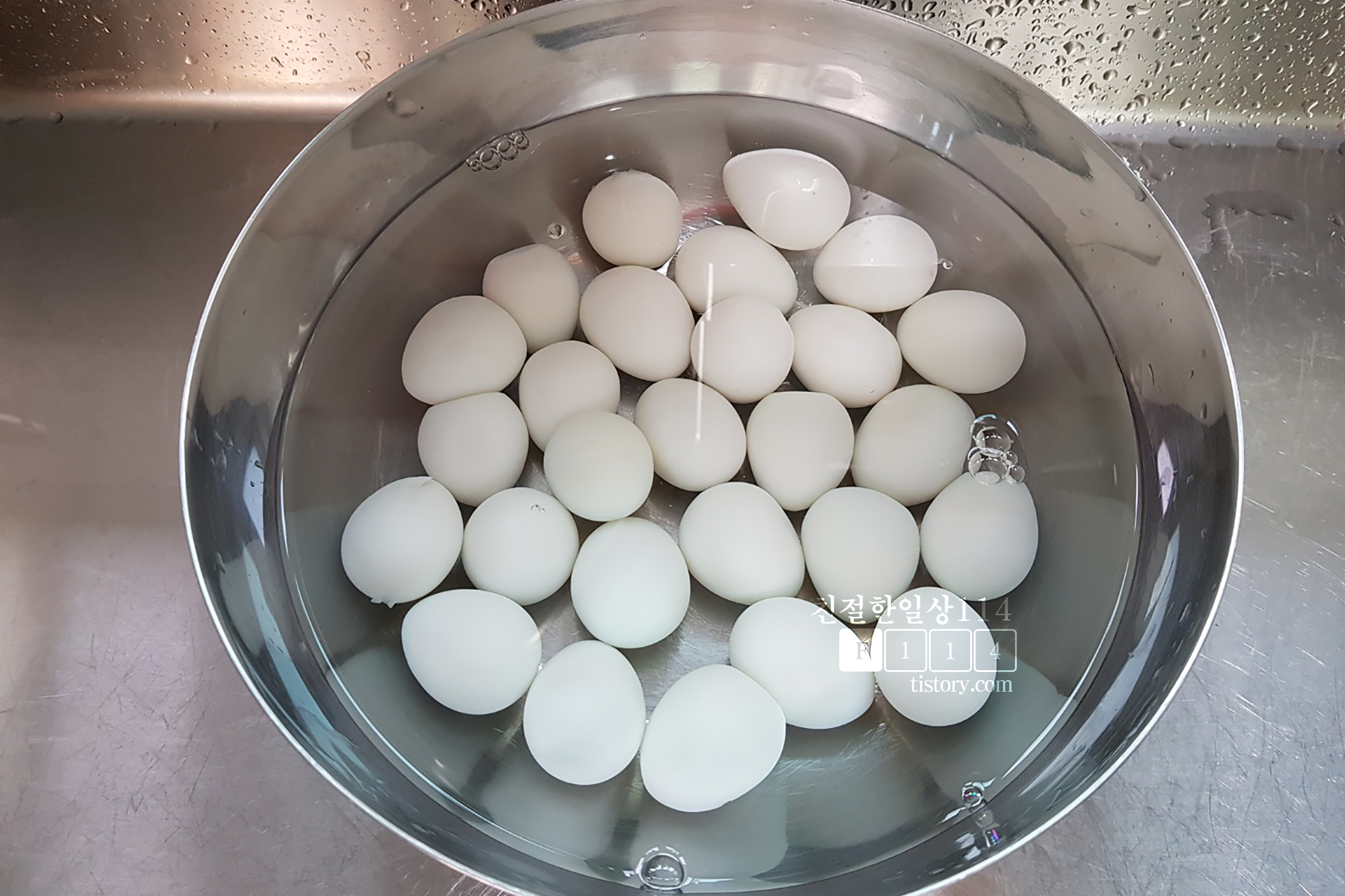 깐메추리알은 포장을 뜯어서 물을 바꿔가며 3~4차례 씻어준다. 처음 씻을때는 거품이 나오기도 하는데 세번정도 씻어내면 거품이 안나오고 깨끗해진걸 알 수 있다.