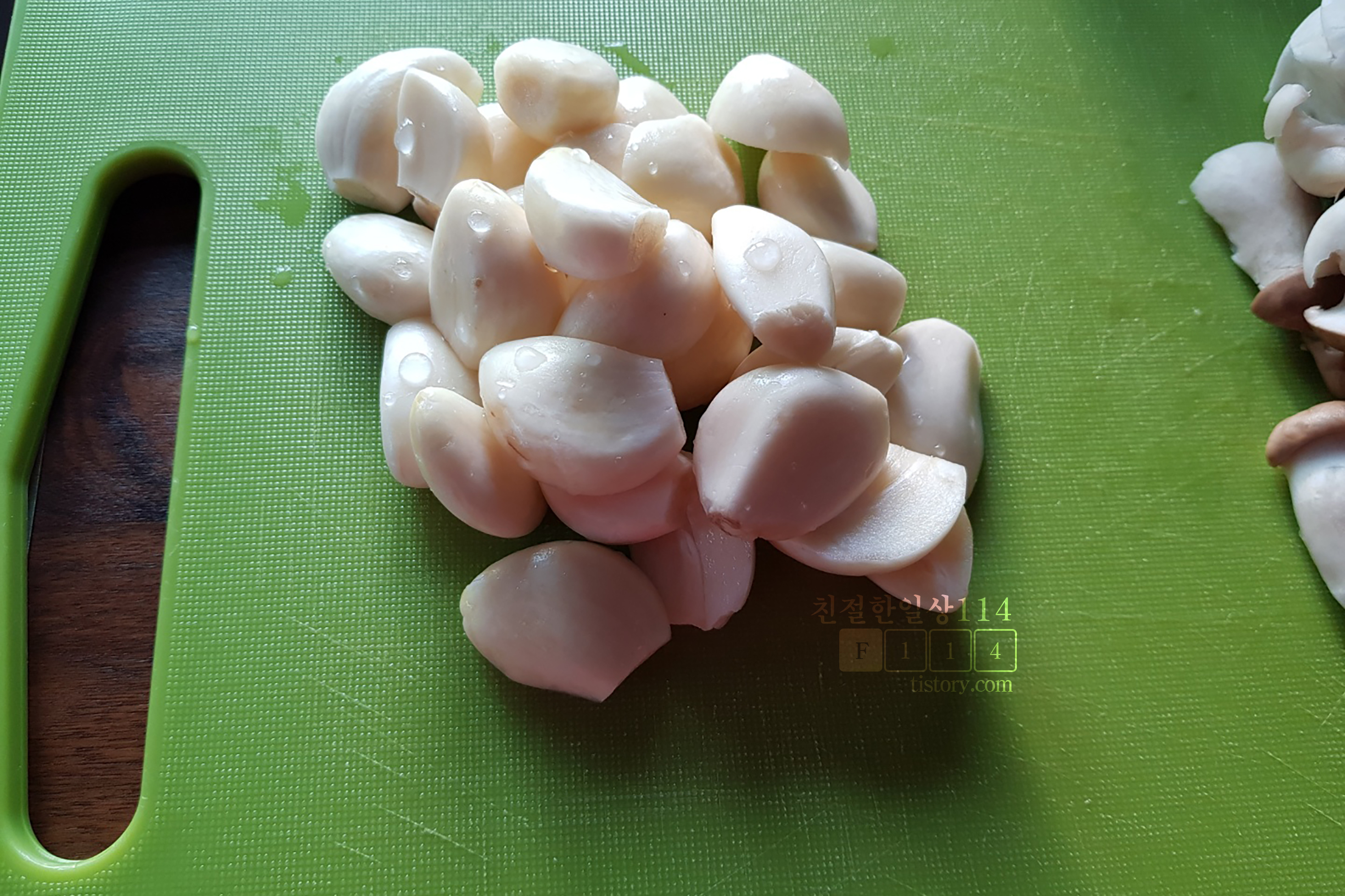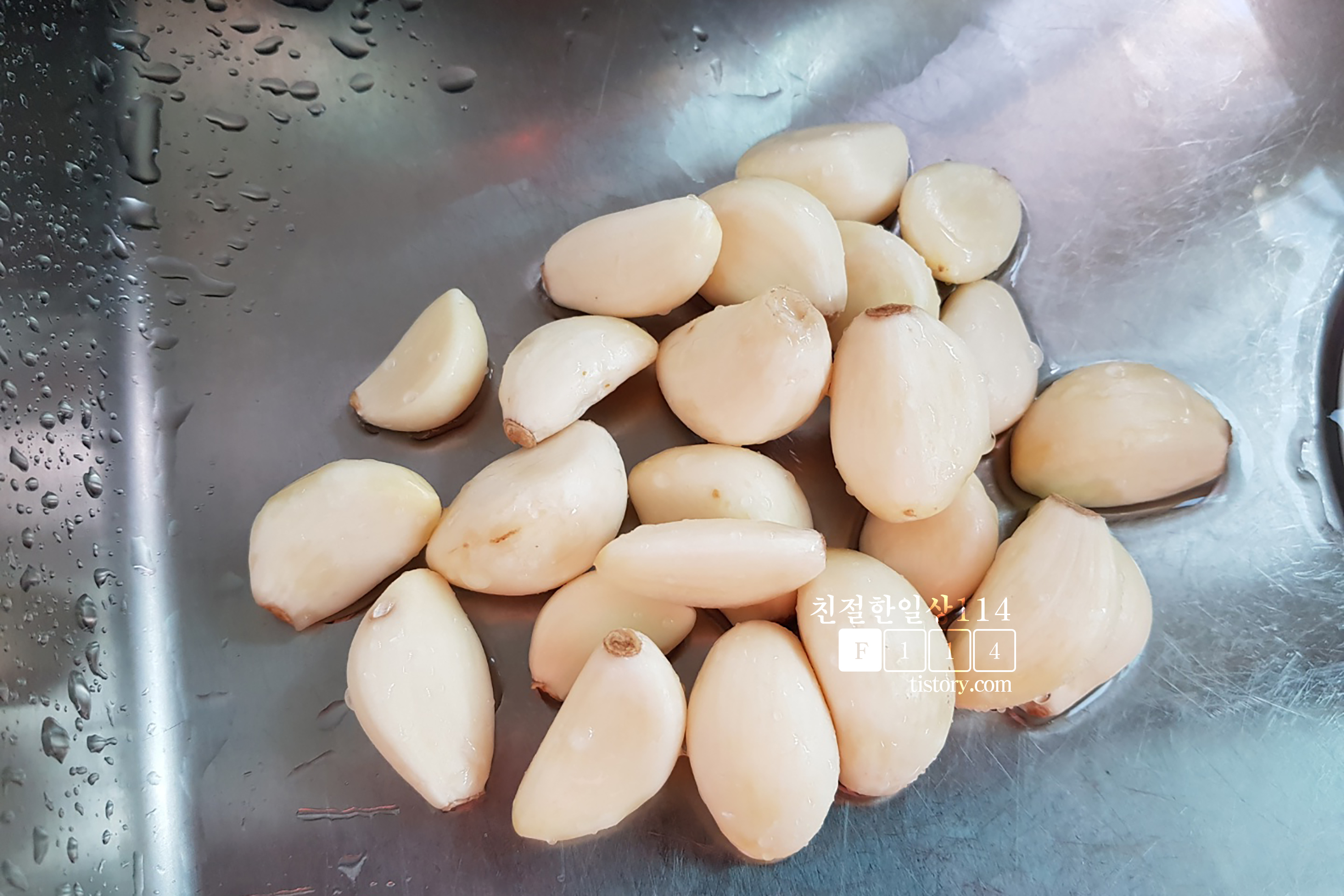 깐마늘은 적당히 통통한 것이 좋다. 깐마늘도 흐르는 물에 잘 씻어서 밑부분을 잘라내고 크기가 큰건 2~3등분으로 잘라서 준비한다.